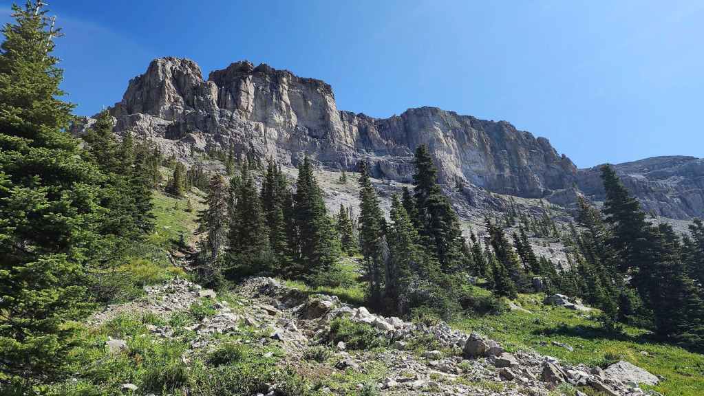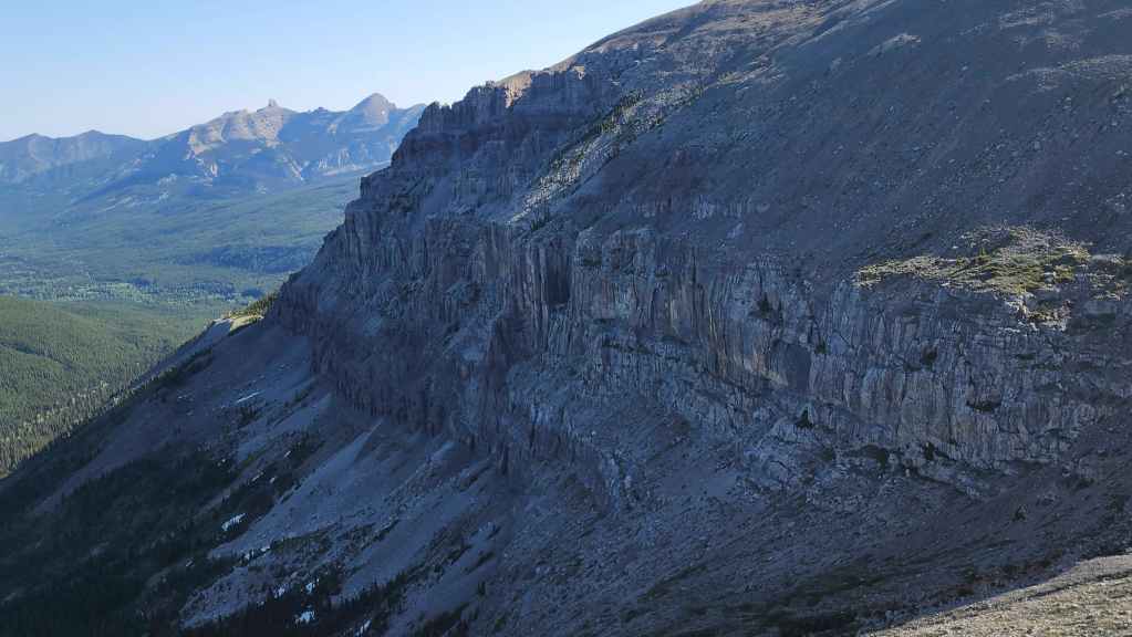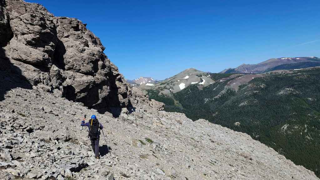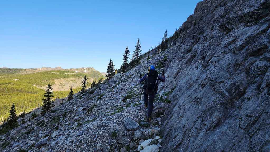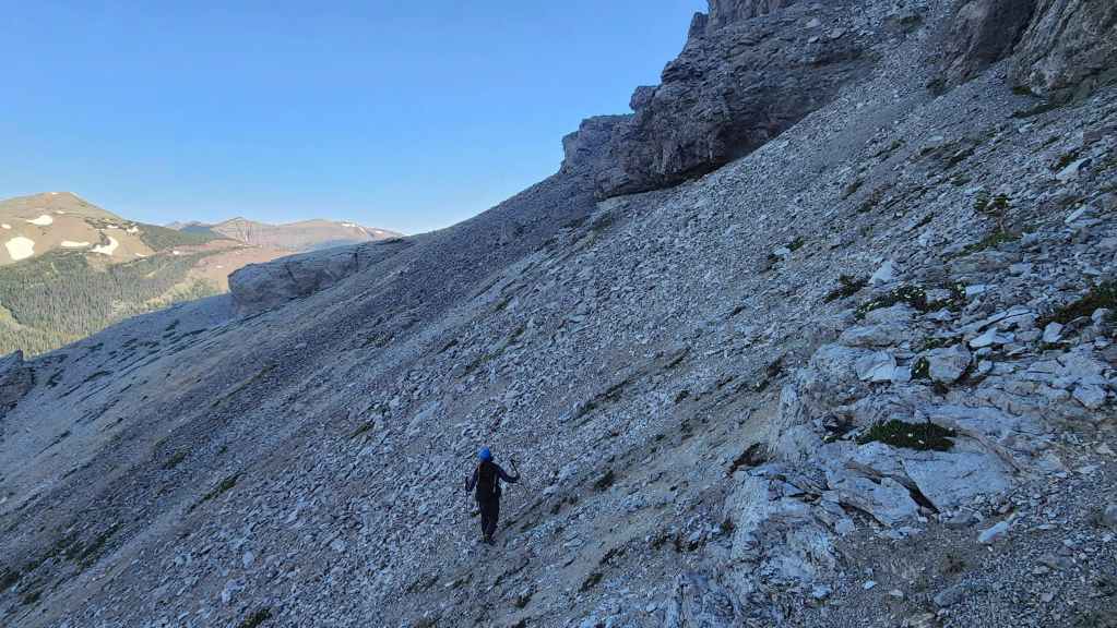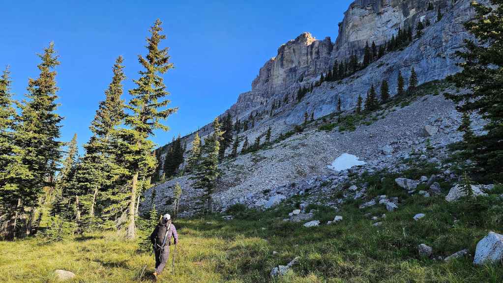 The following day, we left our campsite and followed the GDT for ~870 m towards Matkin, until we came to a large open slope. As this was the closest the GDT came to the mountain, we decided to make a traverse to gain elevation until we joined Cornelius’ scramble route around the west side of the mountain. From the trail to the west end beneath the cliffs, it was a ~760 m traverse / scramble (210 m elevation gain).