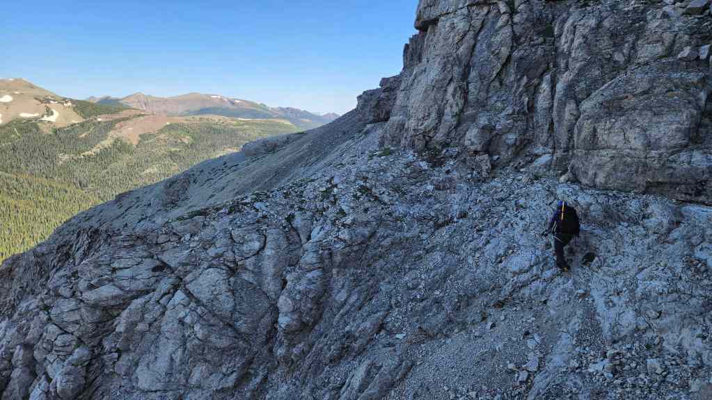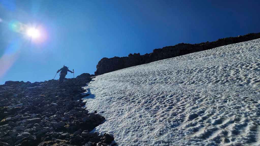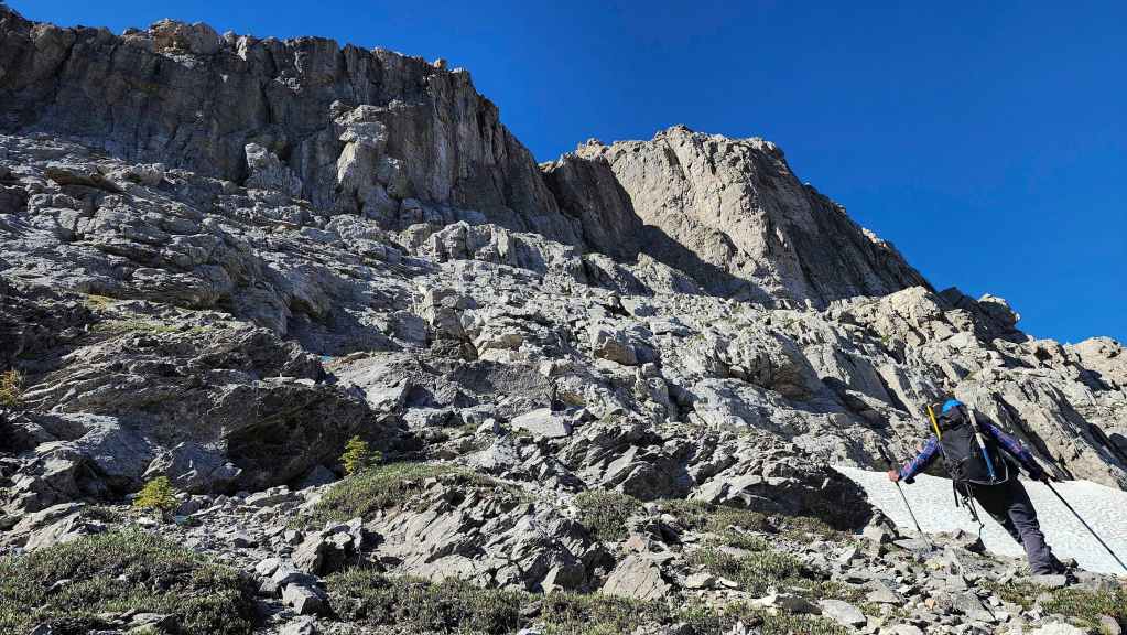 Traversing the base at the beginning of the shoulder is where we encountered brief sections of moderate scrambling.