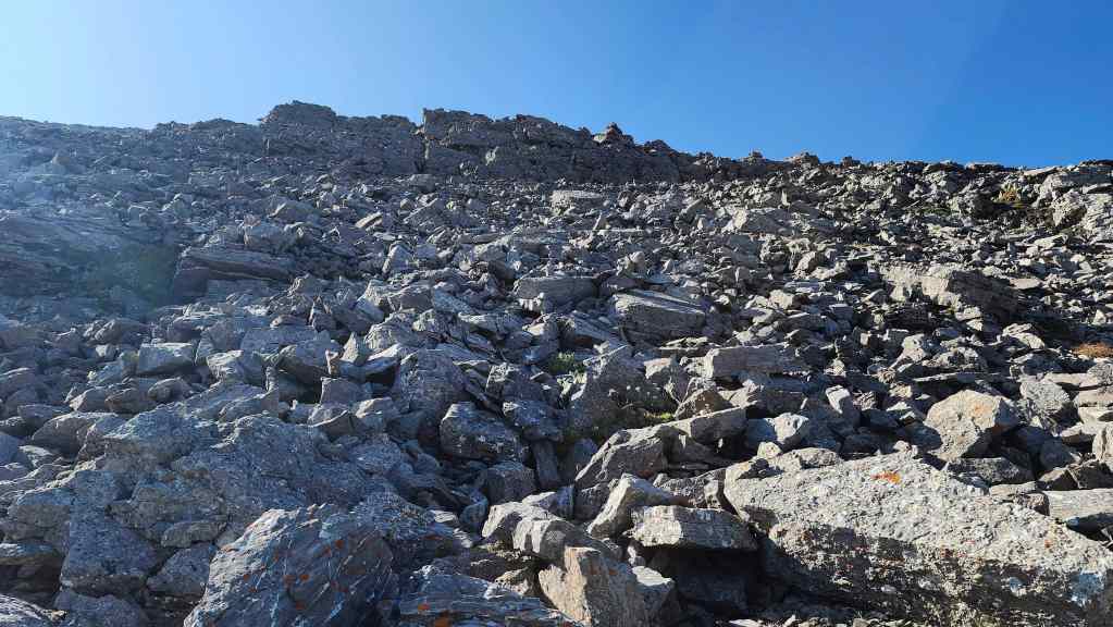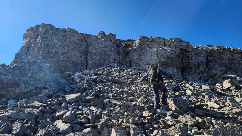 From the col with the outlier, it becomes a steep hike over rubble to get to the summit.