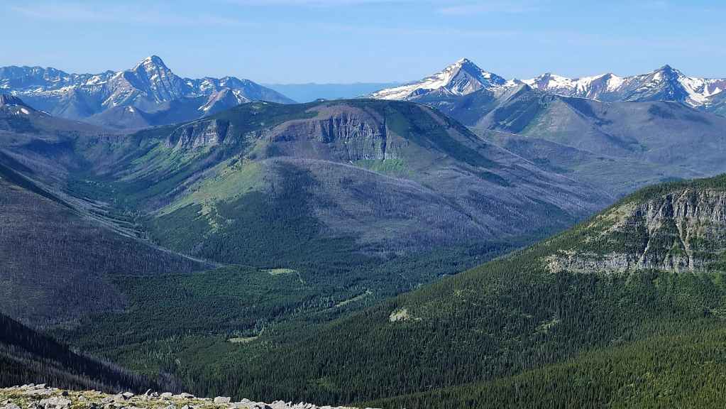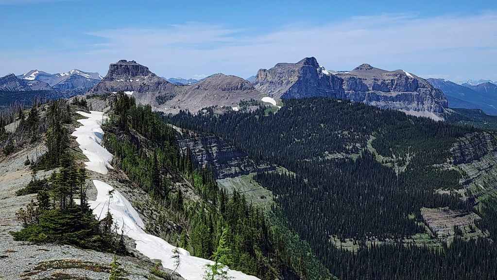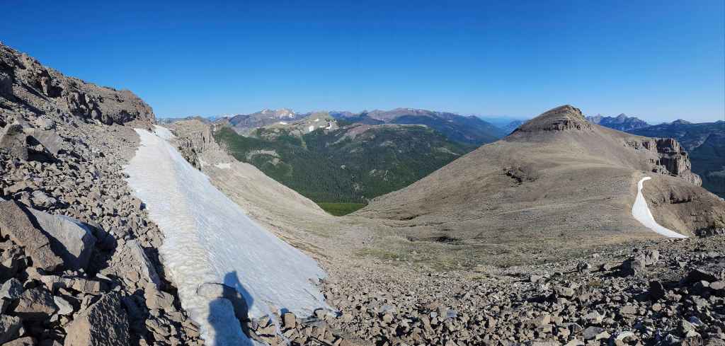 Instead of following the Great Divide Trail (GDT) north from the Pass, we headed to climber’s right and up and along the gentle ridge towards “Sage Pass Peak”. By following the mostly open slopes for ~920 m (160 m elevation gain), we soon arrived on the summit and were surprised by how good the views were. For reference, it took us 3 hours and 20 minutes and ~13.8 km (837 m elevation gain) from Red Rock Canyon to reach the summit.