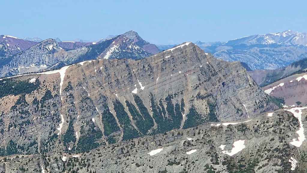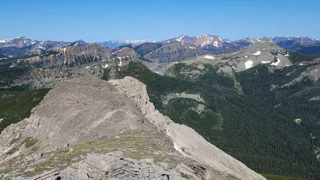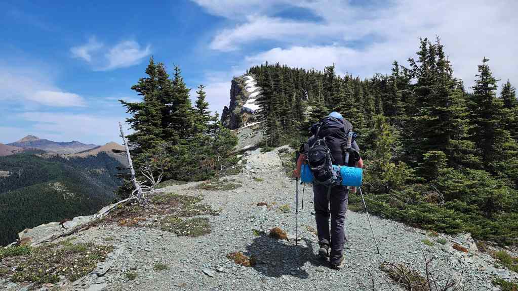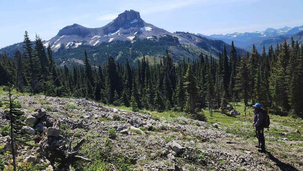 After a quick lunch on the summit, we set off toward toward Font Mountain. An easy downhill hike for ~500 m (74 m elevation loss) brought us back to the GDT which we then followed for ~2.5 km until it began to trend to climber’s right around a large high point shortly before Font. In hindsight, perhaps we should have left the GDT and followed the ridge, but we continued along the trail for another ~1 km; leaving it to regain the ridge on the other side of the high point when it began to descend toward Font Creek. In reality, we only had to regain ~270 m (50 m elevation gain) to reach the ridge, so it wasn’t a big deal.