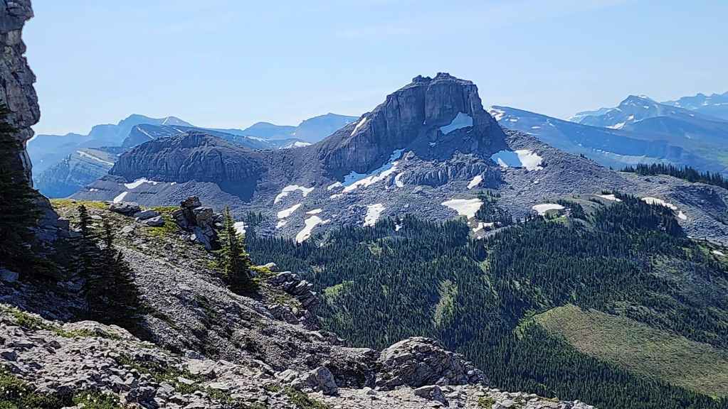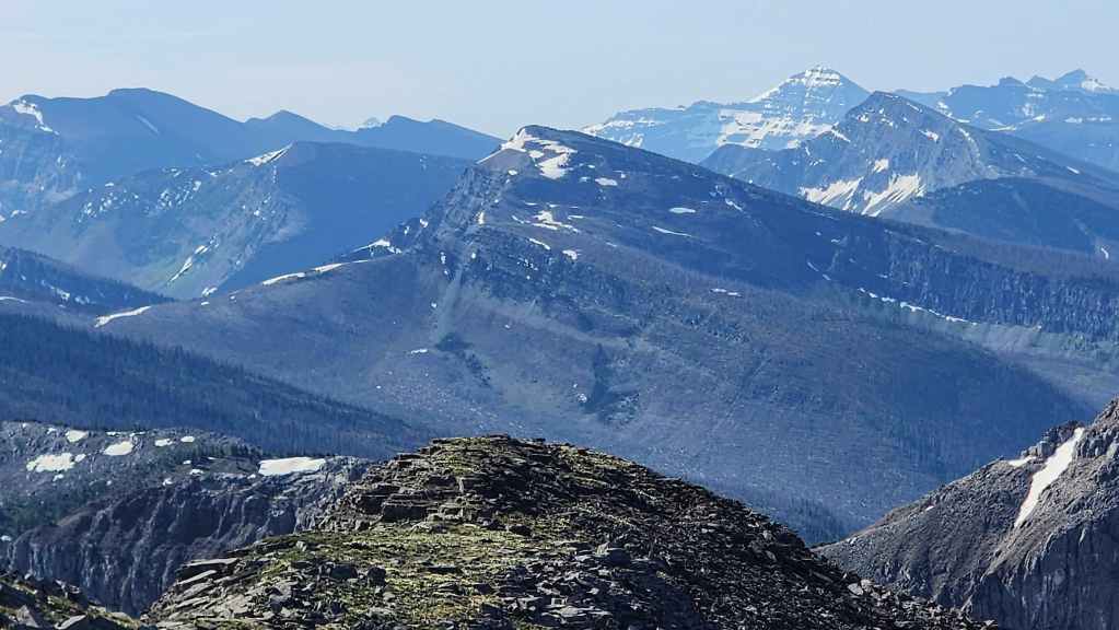 “Sage Senior” (foreground) with “Kootenai Brown Peak” (middle distance far left), Piinaquiium / Ahkoinimahstakoo (Mount Blakiston) (left) and Festubert Mountain (far right)
