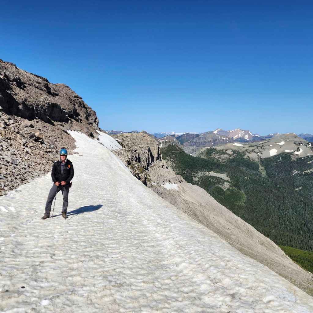 I take some photos of the very steep snow slope below the summit. Thankfully, we could easily avoid it! (Photo by Brad Wolcott)