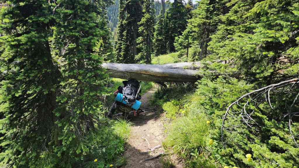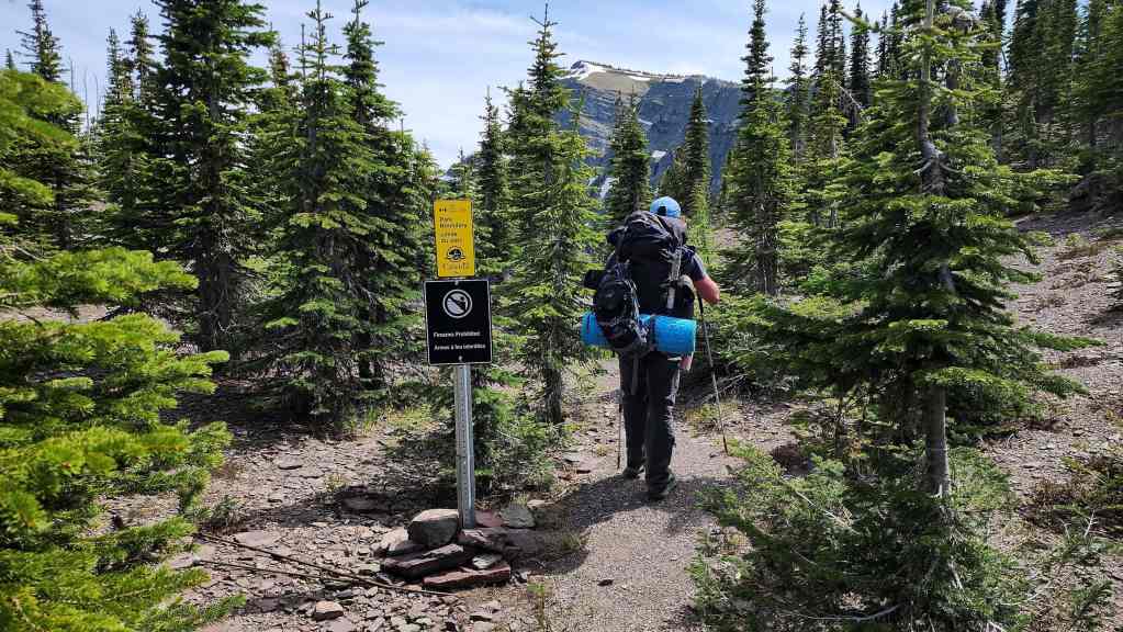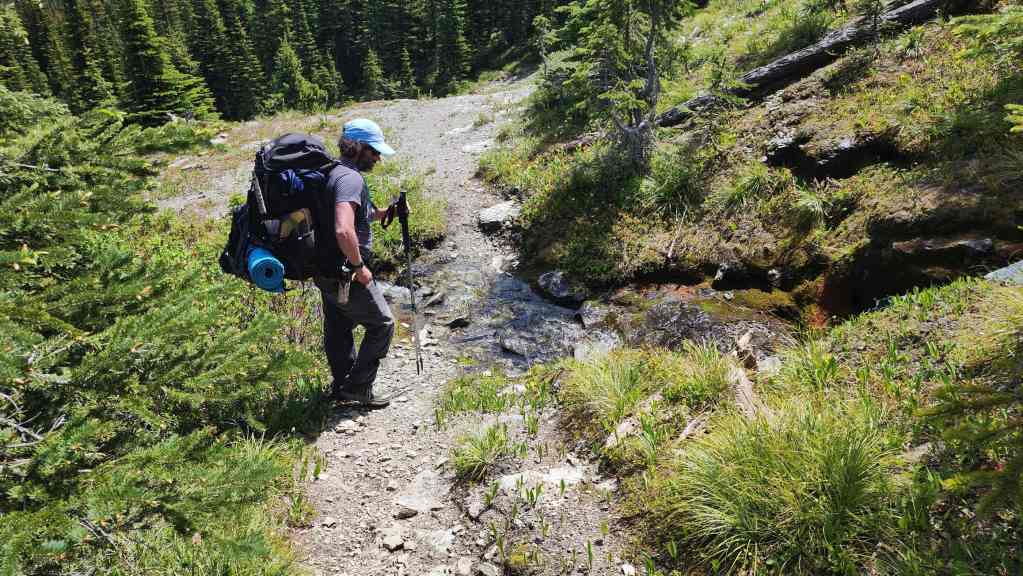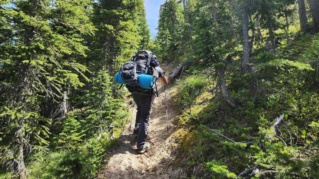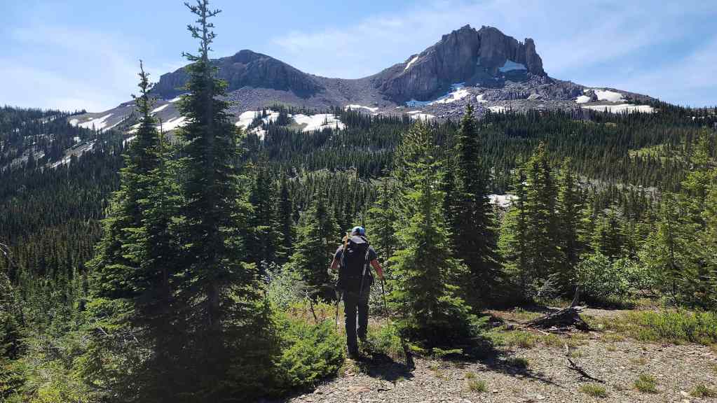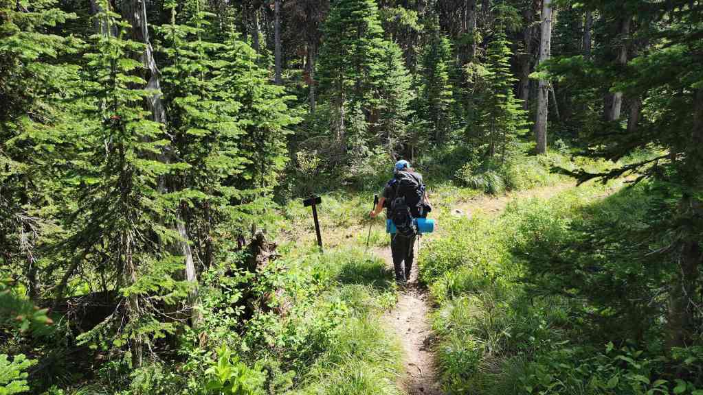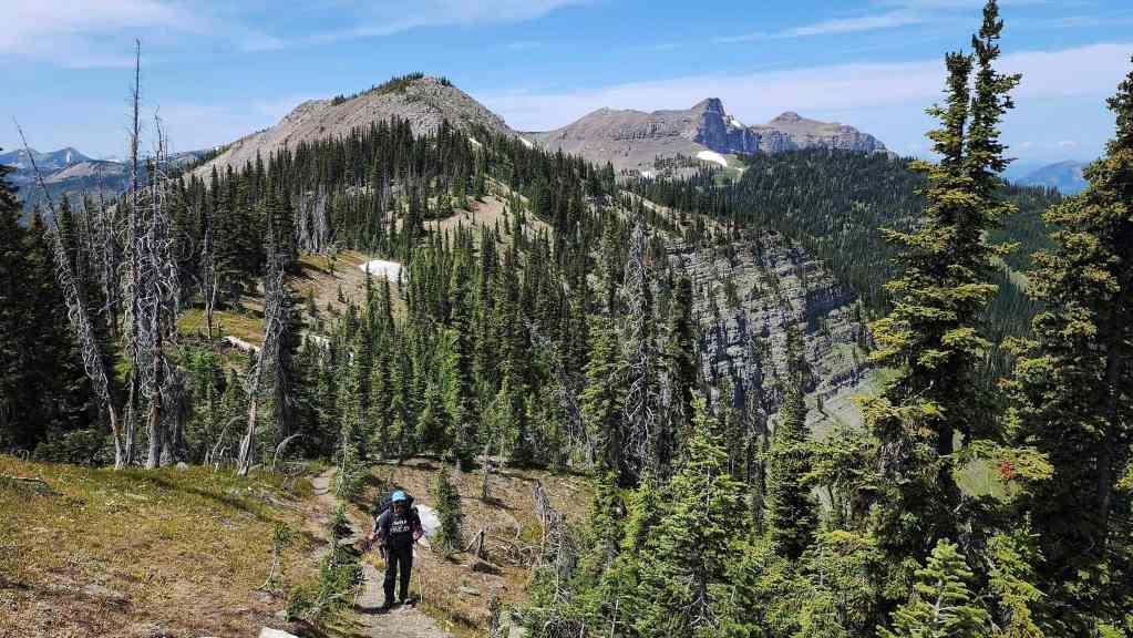 The GDT skirts the east side of Font, losing elevation before it comes to a fork. If you weren’t paying attention, it might be possible to miss the right fork and keep following the trail further towards the valley. This would mean turning around and hiking back up to this junction. Here, Brad has just turned onto the right fork which is the GDT. Note the small sign on the tree indicating that this is the GDT.
