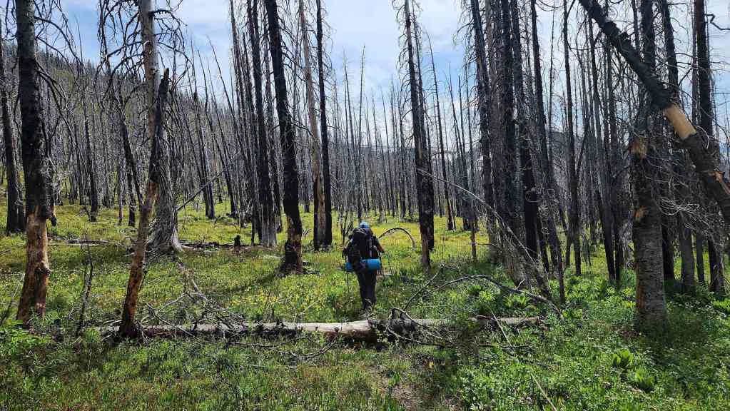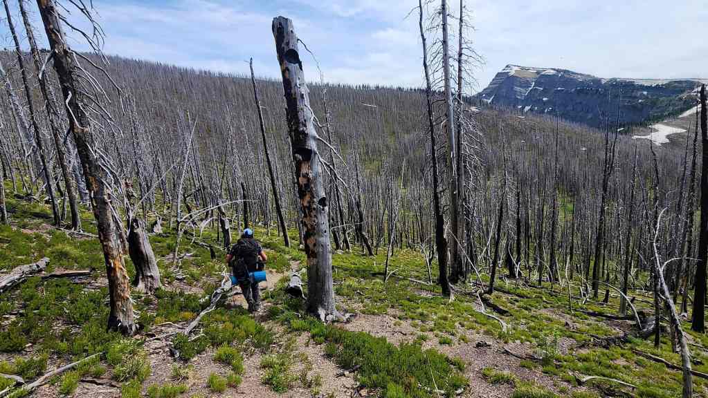 After enjoying the views, we returned the way we came, save for a more direct descent route back to the GDT. Once back at camp, we gathered our packs and set off on the GDT towards Sage Pass. The GDT skirts the east side of Font and as it descends, the trail forks, with the right fork being the GDT and the left fork continuing into the valley. Making a mistake here would be costly.