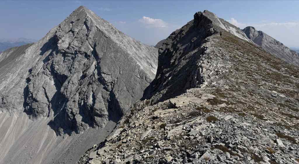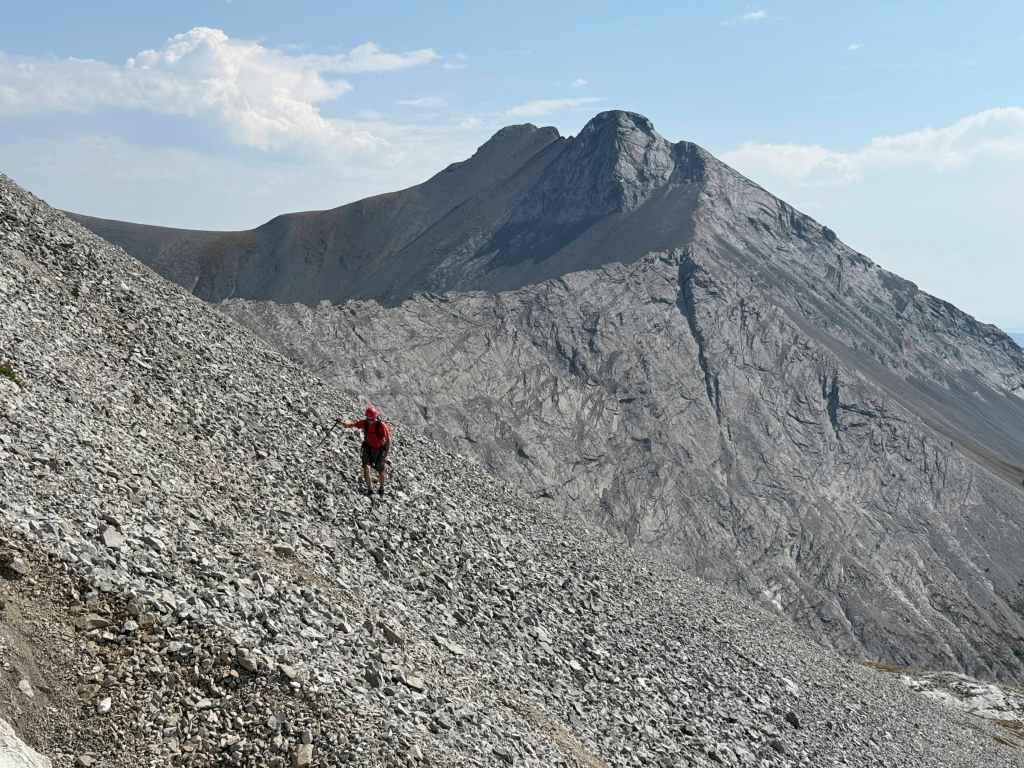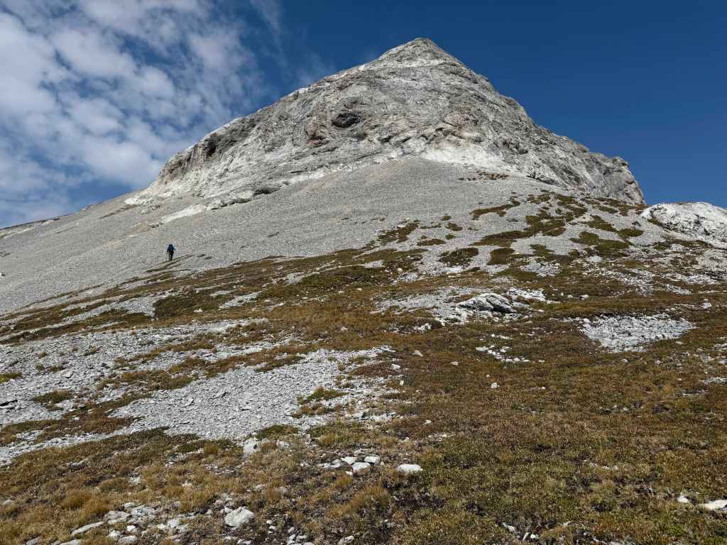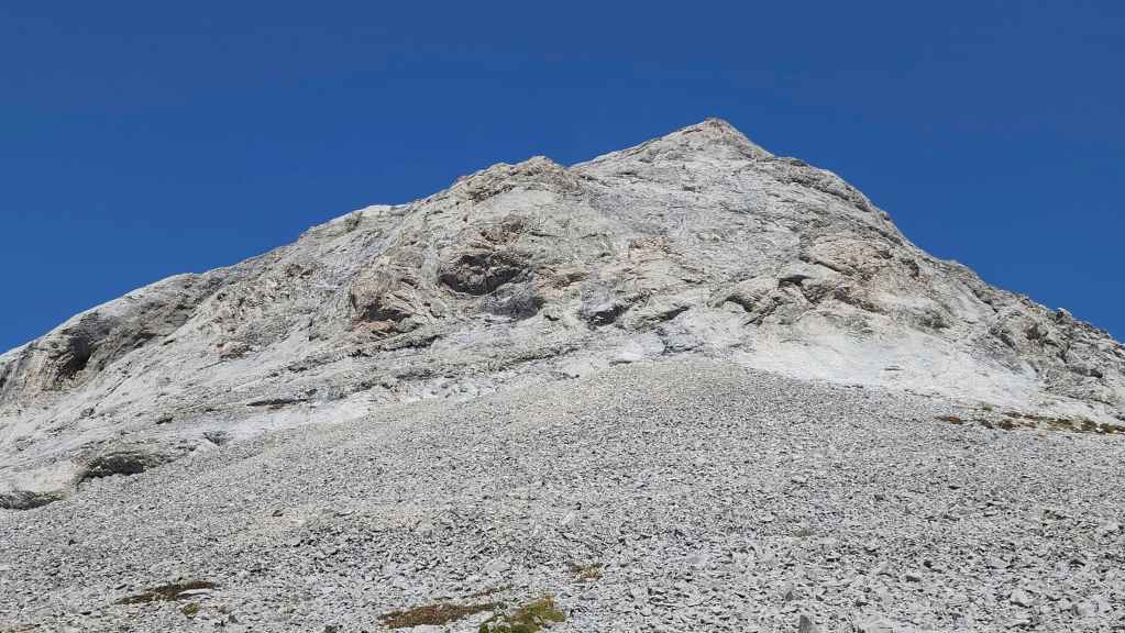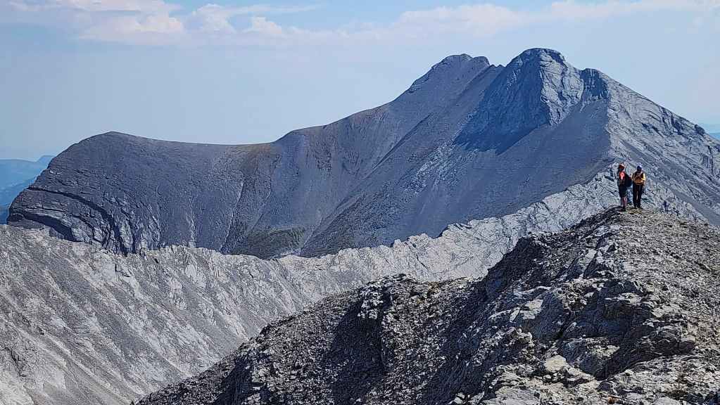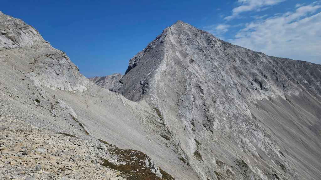 A more comprehensive view of “Gargantua Peak” (2520 m). Though the peak on the left is the actual summit, we also made the short hike over to the slightly lower, sub-peak (2503 m) on the right. (Photo by Geoff Hardy)