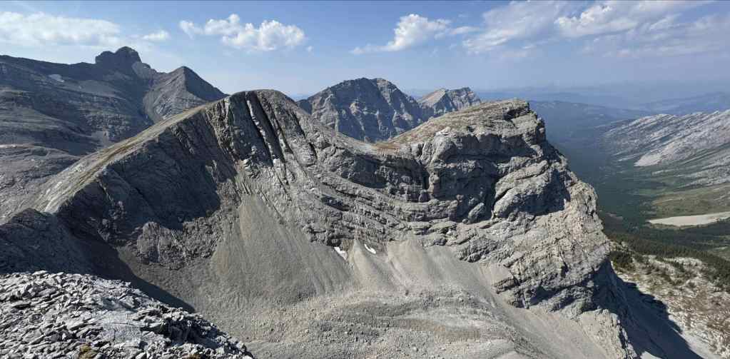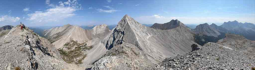 Geoff’s view from the previous photo. Brad, Andy, and I are hanging out in the col on the bottom left. “Promised Land Peak” is in the foreground with “Gargantua Peak” to its left. In the background is Mount Ptolemy (centre) and “Pharaoh’s Peak” (right) on the Northwest Ridge of Ptolemy. (Photo by Geoff Hardy)