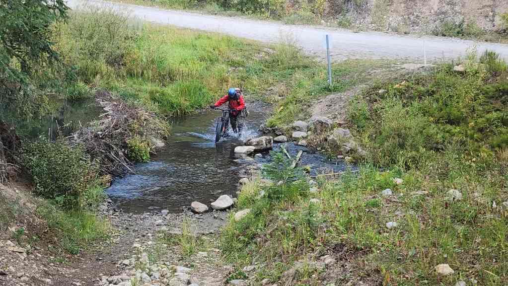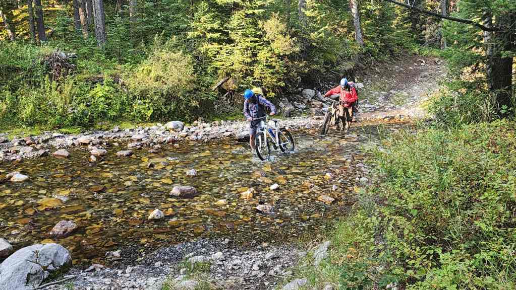 To get to “Promised Land Peak” and “Gargantua Peak”, we followed Highway 3 past Coleman towards the B.C. border. After driving 1.3 km beyond the rest area at the far west end of Crowsnest Lake, we turned left onto Coal Road. From here we drove ~3.2 km to our parking spot at the Ptolemy Creek trailhead. After wading across the stream at the trailhead (the first of many unbridged crossings), we then biked ~5 km (1 hour with a ~200 m elevation gain) until we reached a very large clearing/camping area.