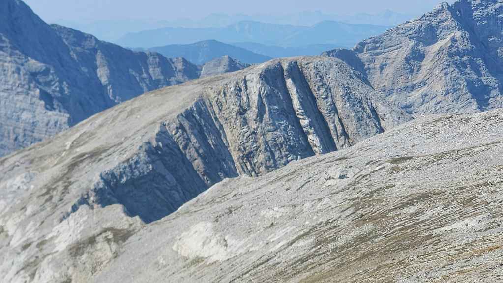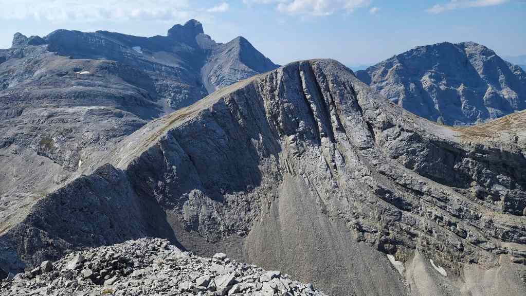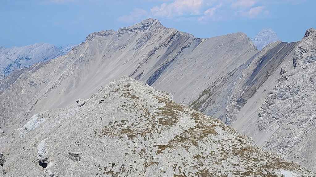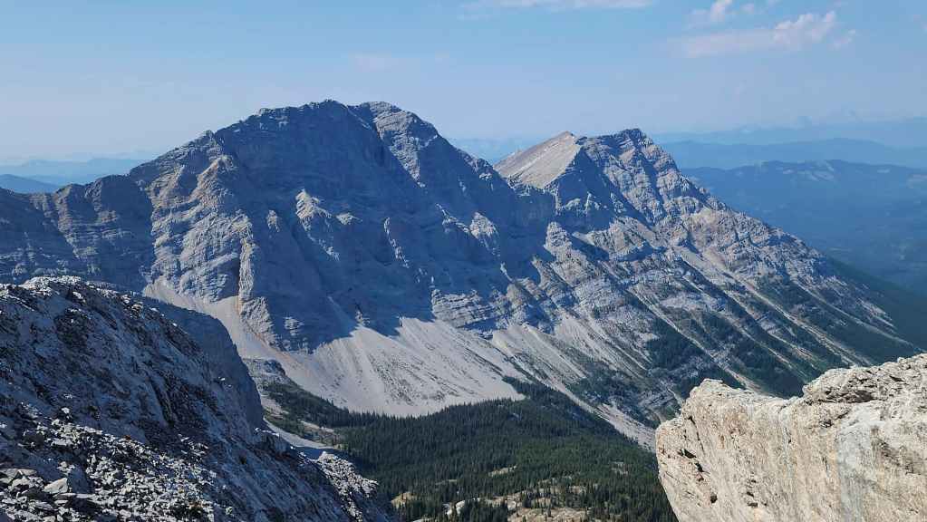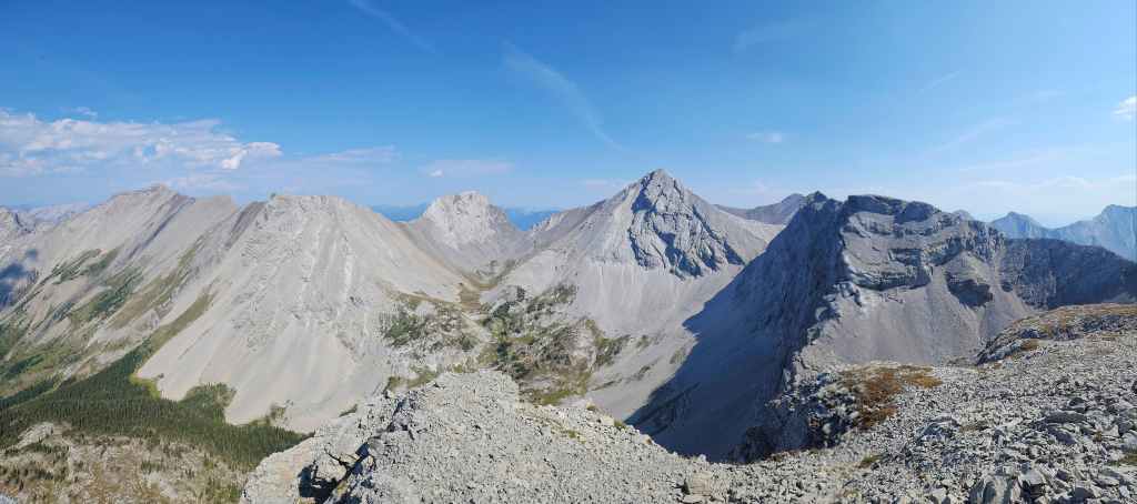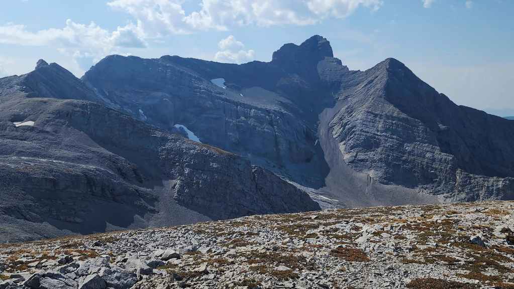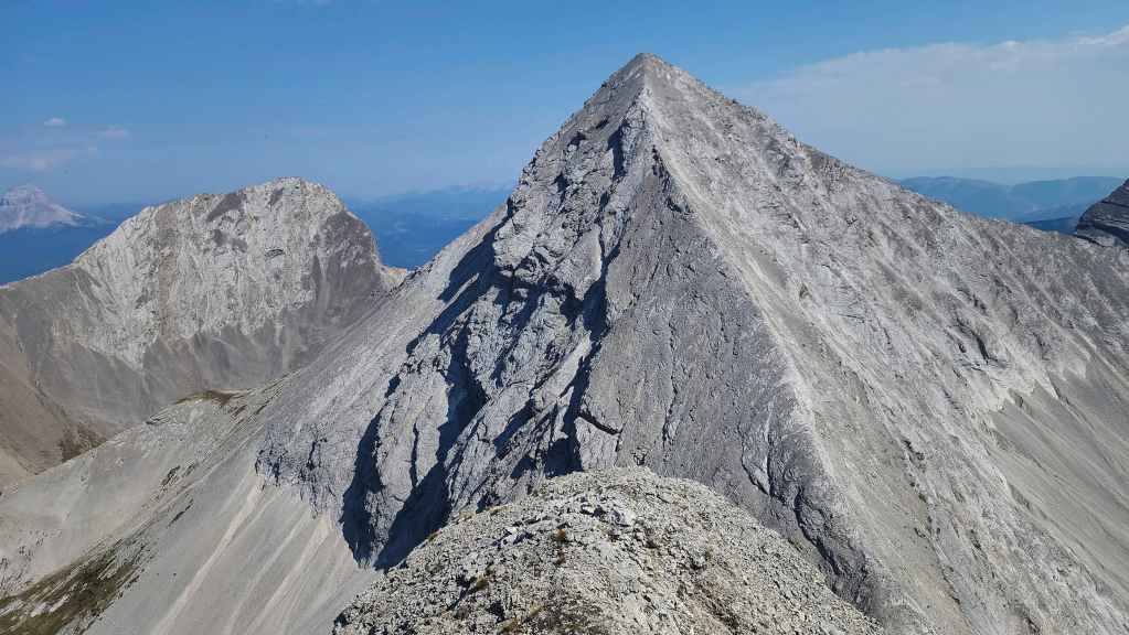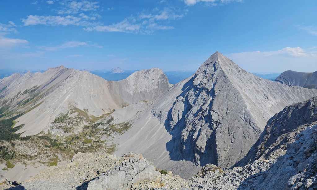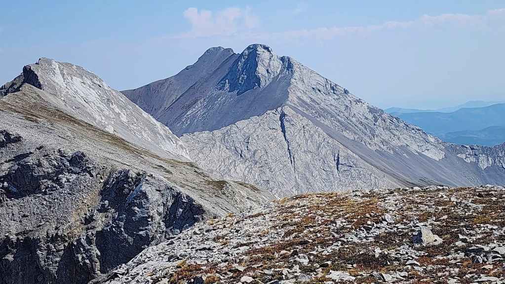 At 2622 m, “Pharaoh’s Peak” on the Northwest Ridge of Ptolemy is one of the higher peaks in the area. In the foreground is the summit of “Gargantua Peak”.