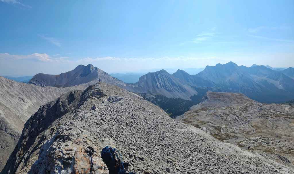 The trip from “Promised Land Peak” to “Gargantua Peak” involved following the connecting ridge for ~1.1 km. A small elevation loss to the col was followed by an easy hike to the summit. We then left our packs on the summit and make the ~375 m trip to the “Gargantua’s” sub-peak (2503 m). This involved a 56 m elevation loss to the col and then a 40 m elevation gain to the summit.