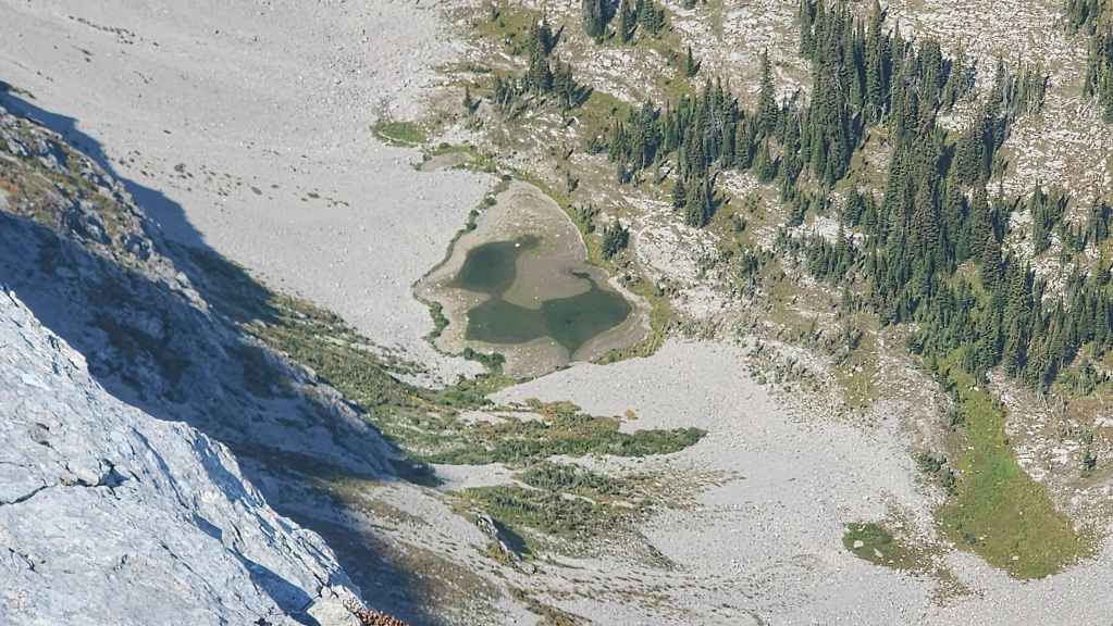 Glancing down at the tarn that sits in the Andy Good Basin.