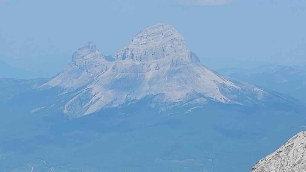 The Seven Sisters (left of centre) and Omahkai’stoo (Crowsnest Mountain).