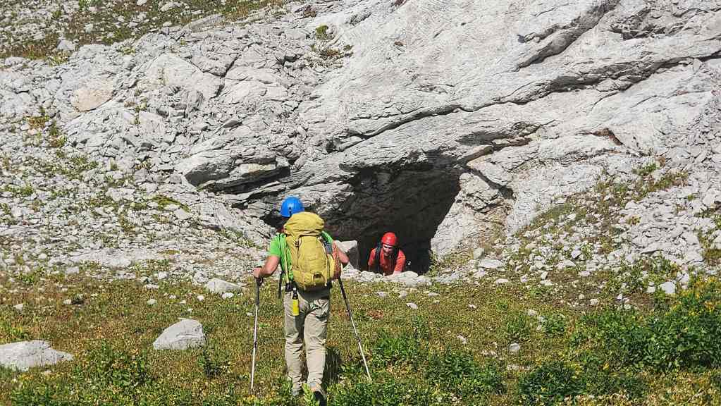 Cleft Cave is the vertical cave that can be seen in the background centre, near the skyline ridge.