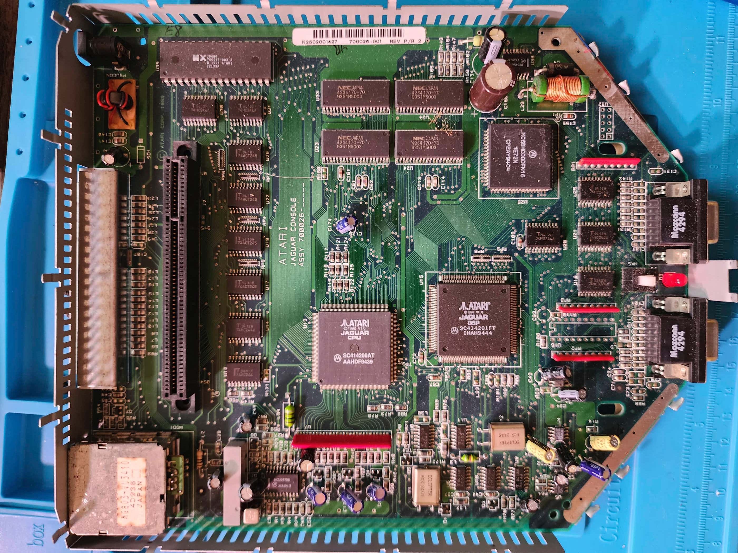 Project Details: I picked this up from my local retro game store for a decent price. Unfortunately, the store didn’t have any games and as the Jaguar requires a cartridge to be plugged in to complete the power circuit, I took it home under the assumption that “it worked the last time it was used” – which was several years beforehand. Not having any games myself, I ordered in a couple games to test it out. When they arrived I plugged one in and turned the system on… success! The system worked – well at least partially, because there was no sound whatsoever. I did some digging on Atari Age and discovered that this is a fairly common issue that is associated with the sound voltage regulator IC known as REG1. I tested it with a multimeter and discovered that I had the correct voltage entering PIN 8 but only .2 mV leaving PIN 1 instead of the 5V it was supposed to be. Though some on Atari Age had run a small wire hack to provide 5V power to PIN 1 to fix the problem, I decided to replace the entire chip. Thankfully, Console5 carried them and I placed an order. In the meantime, I gave the unit a detailed inspection and cleaning. I noticed that someone had written in red ink under the serial # the date of 12-05-14. Hmmm… Then it dawned on me that the reason why the capacitors looked newer was because they were. The date probably corresponded to when it was re-capped. Nice!