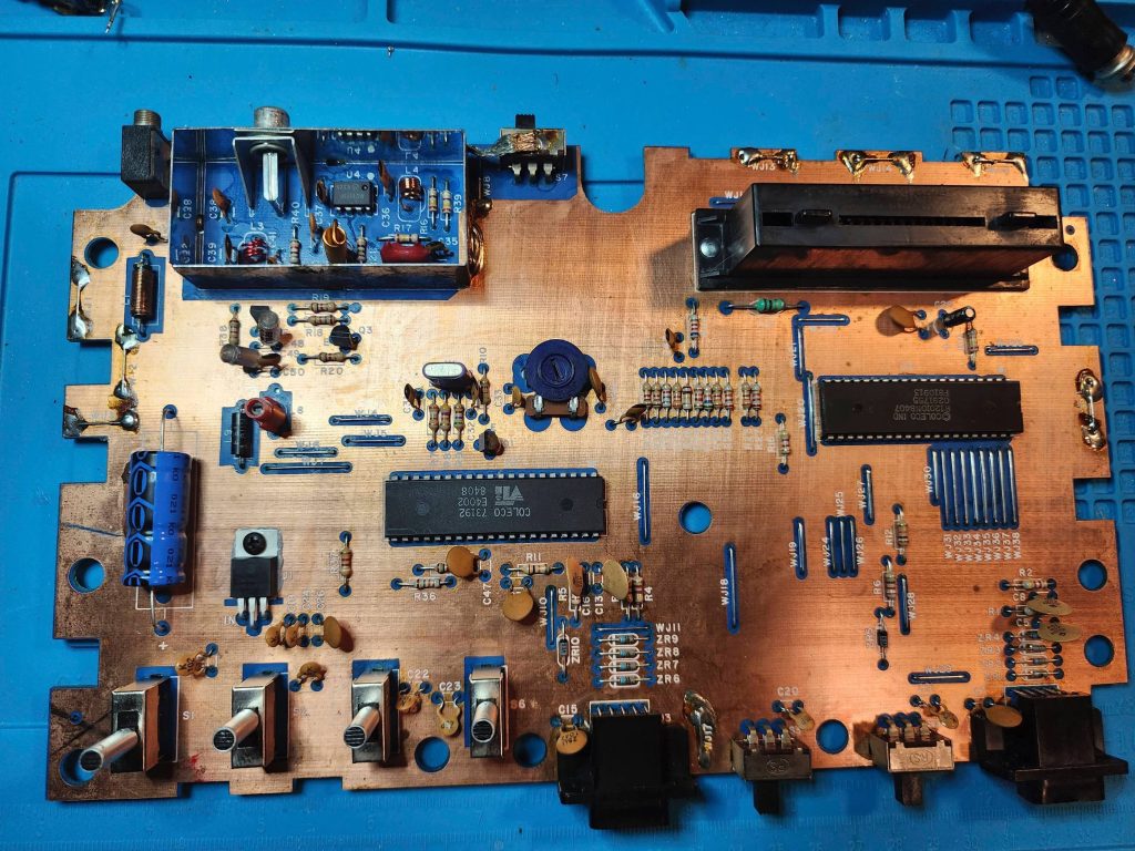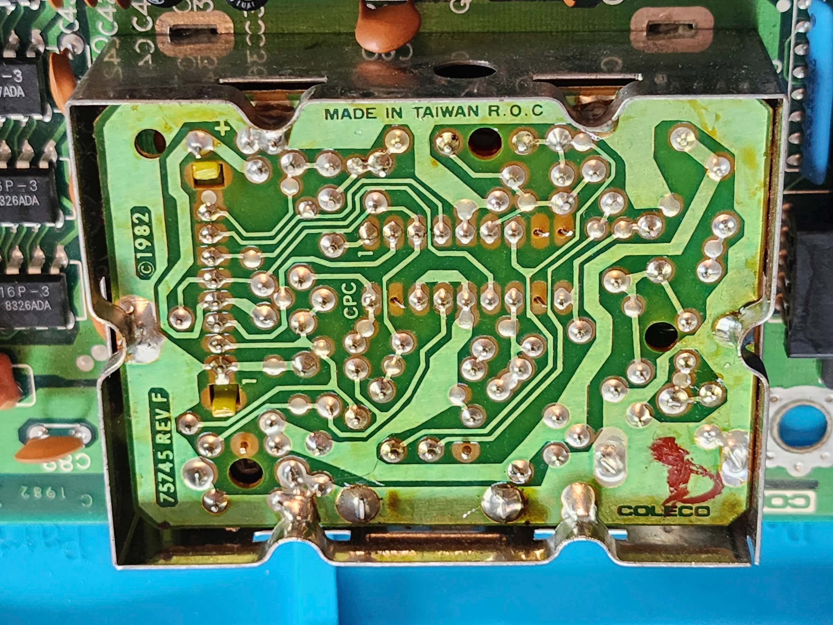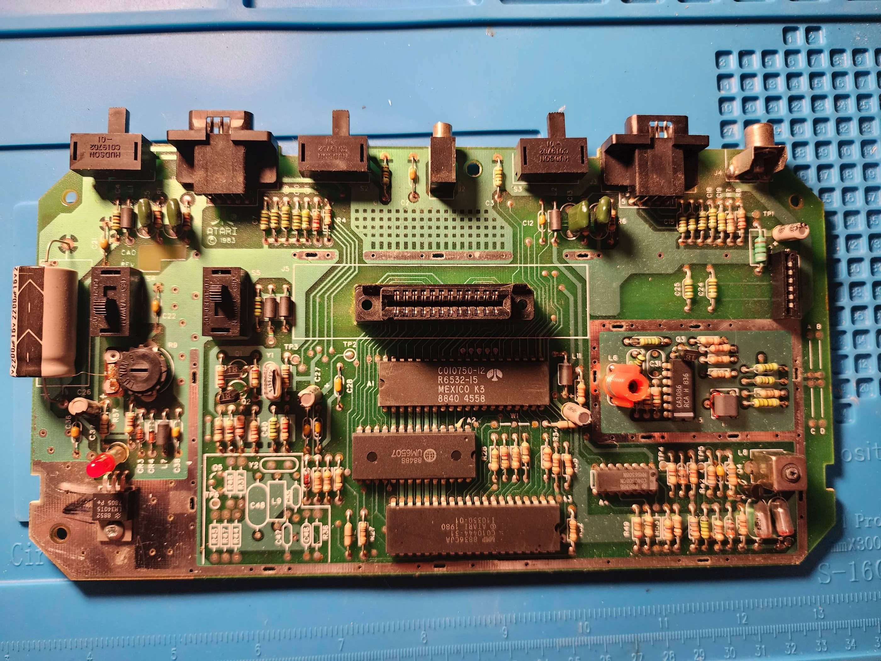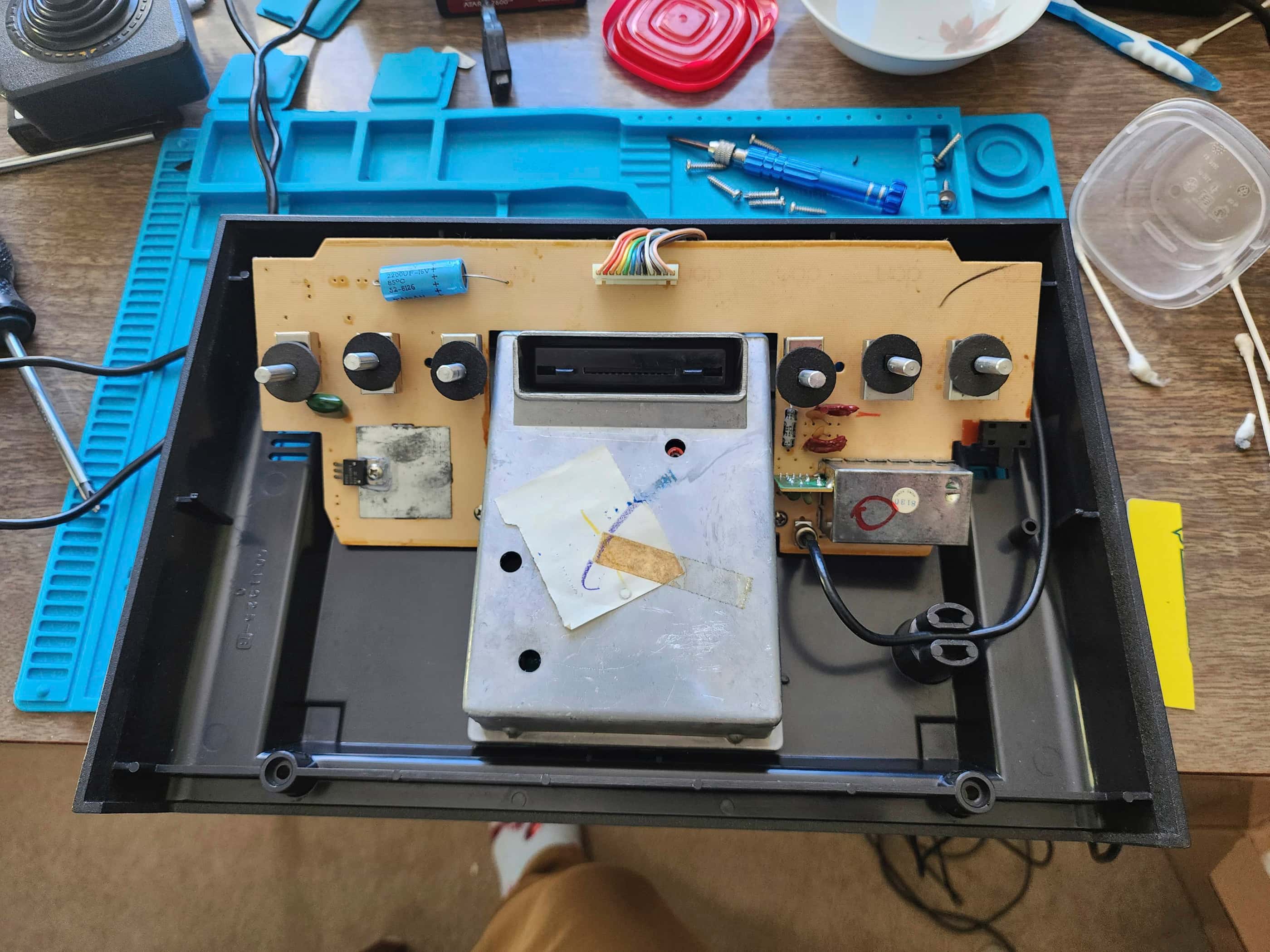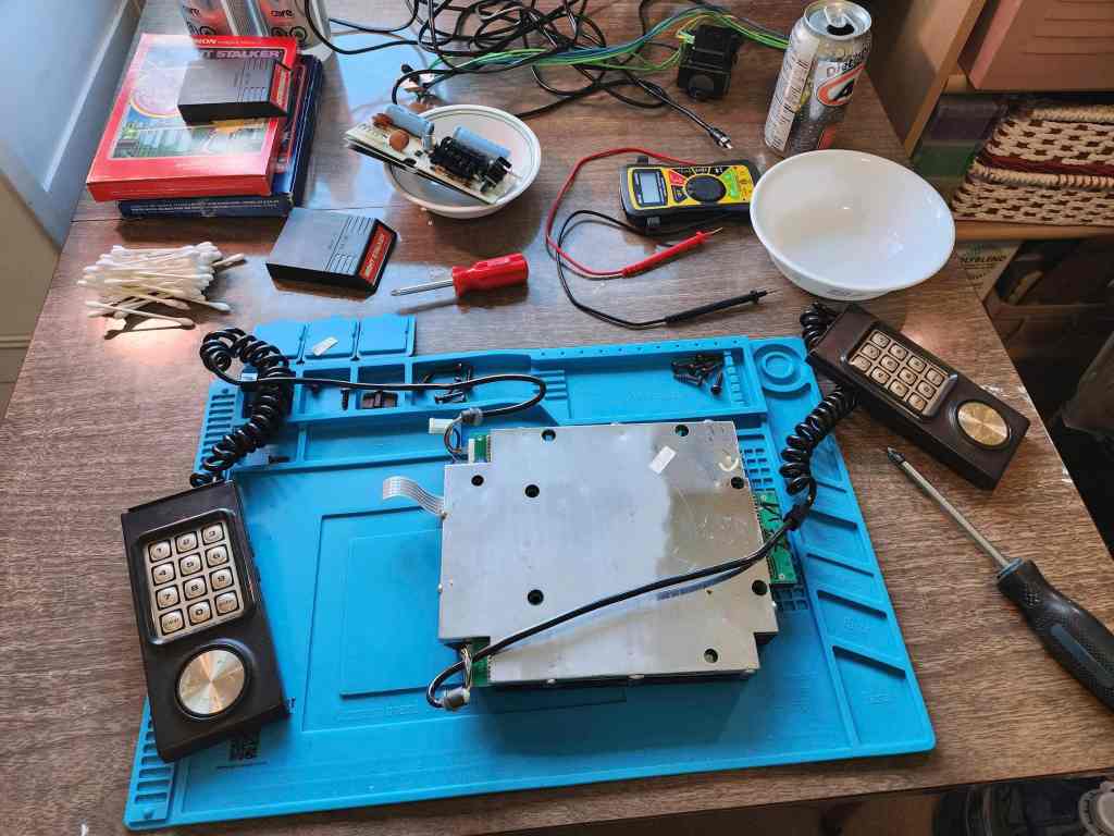 Project Details: I acquired this unit locally and it was partially functional. However, like the Astrocade, it came from a smoker’s home and before I could do anything, it and all its accessories had to spend several weeks sealed inside garbage bags with baking soda. When I opened the system up, I discovered it was quite dirty and there were two issues: 1) an occasional graphics glitch; and 2) an occasional sound issue where it would be fine and then suddenly shut off. After determining the power adapter was not the issue, I then desoldered and disassembled the power switch, cleaned the contacts, applied dielectric grease, reassembled, and soldered the switch back onto the board. Success! This fixed the graphics. I tackled the sound issue first by determining that it wasn’t a failing chip by connecting an external speaker via a jumper wire to ceramic capacitor C88. When I received rich and consistent sound without issue, I then zeroed in on the RF box and the audio subcarrier. Adjusting it with a homemade vinyl tool, I was able to get the sound back. However, if I squeezed the outside of the RF box the sound cutoff again, which told me there was a short somewhere. I reflowed a bunch of solder points and that seemed to fix it; however, if the issue arises again in the future, this unit may be a candidate for a composite mod. After testing the machine for quite a while and being satisfied with the results, I then cleaned it thoroughly. I also disassembled and cleaned the controller, the driving wheel, the track ball, and the Atari expansion unit. 😁