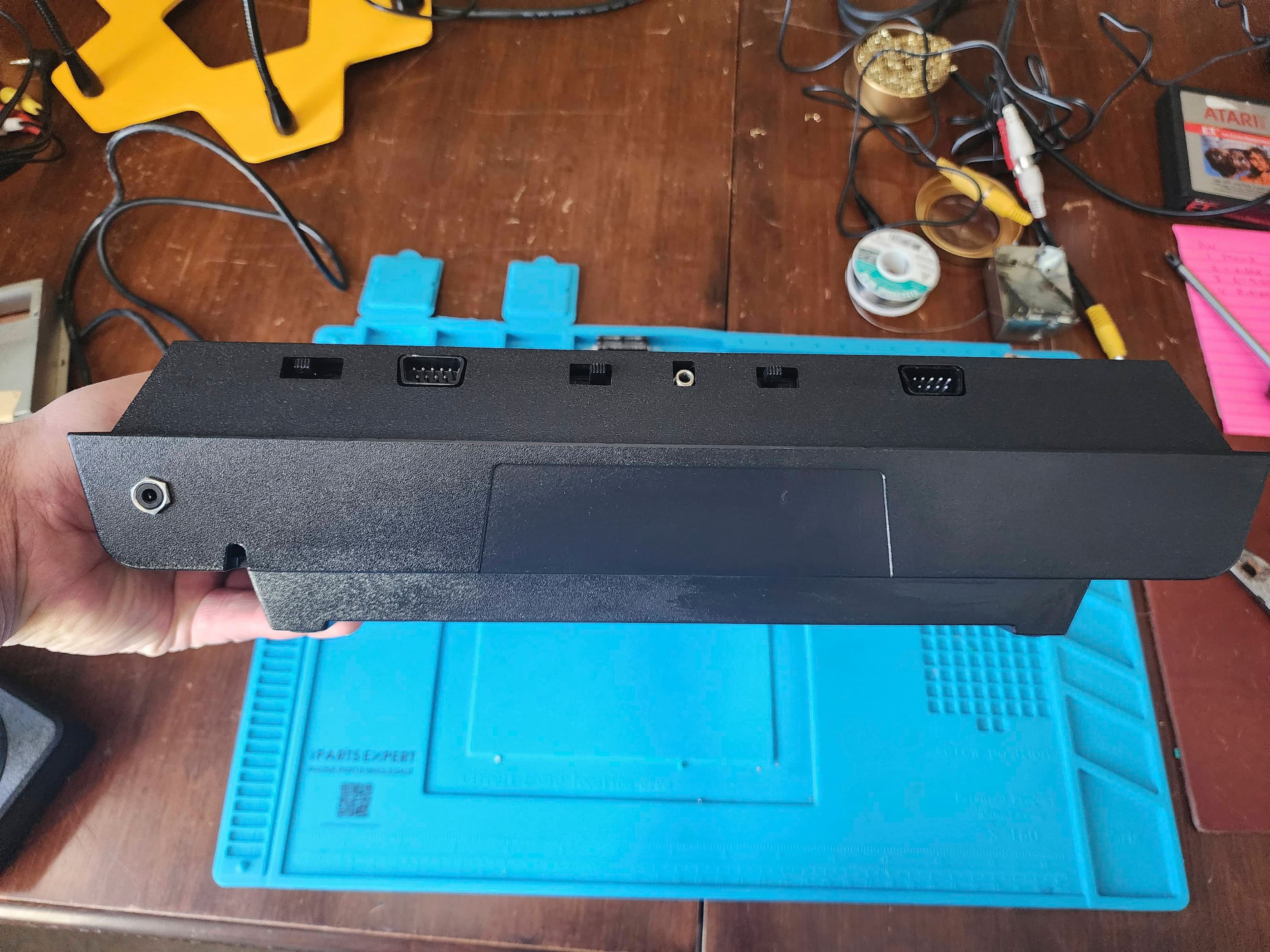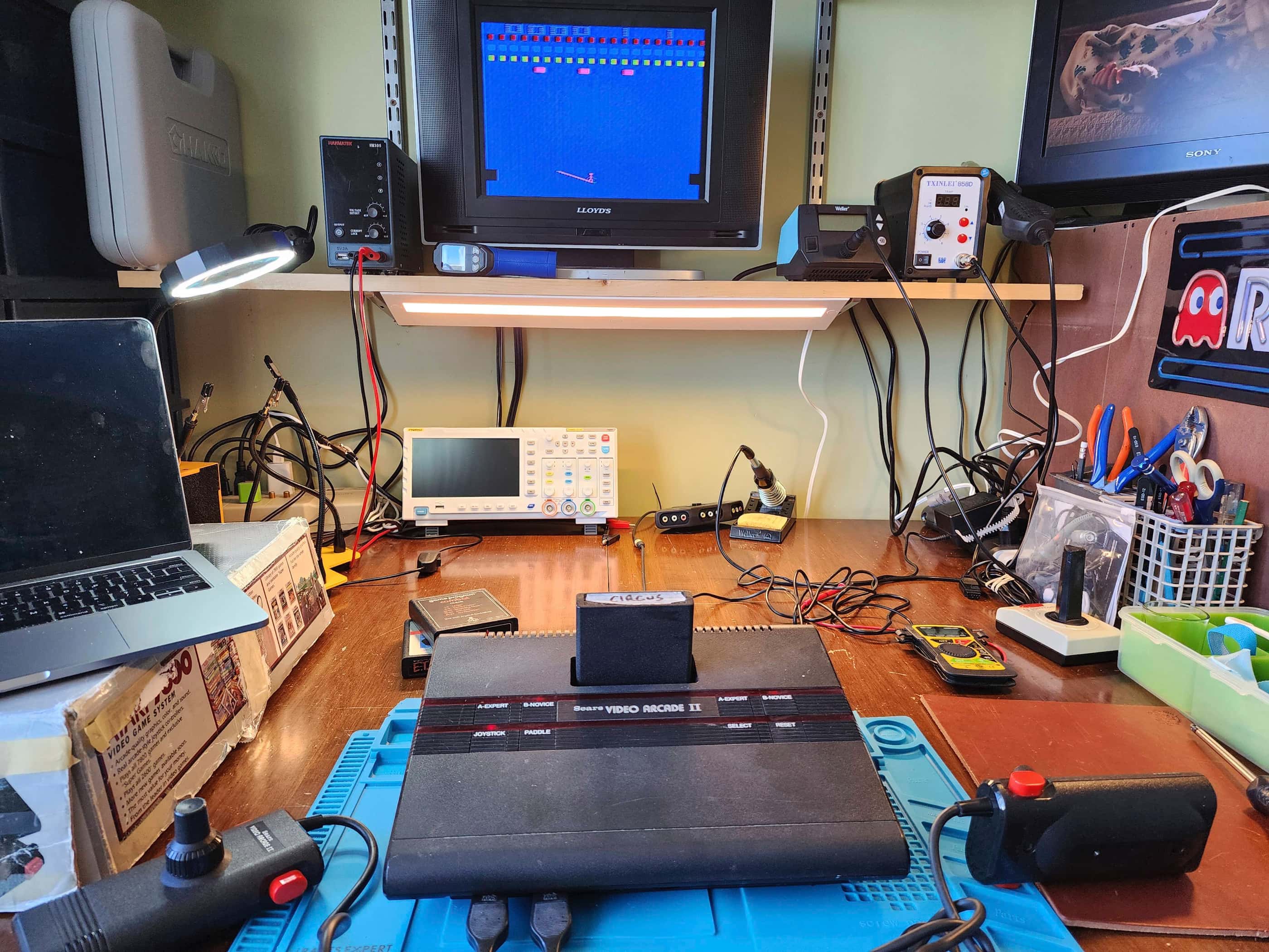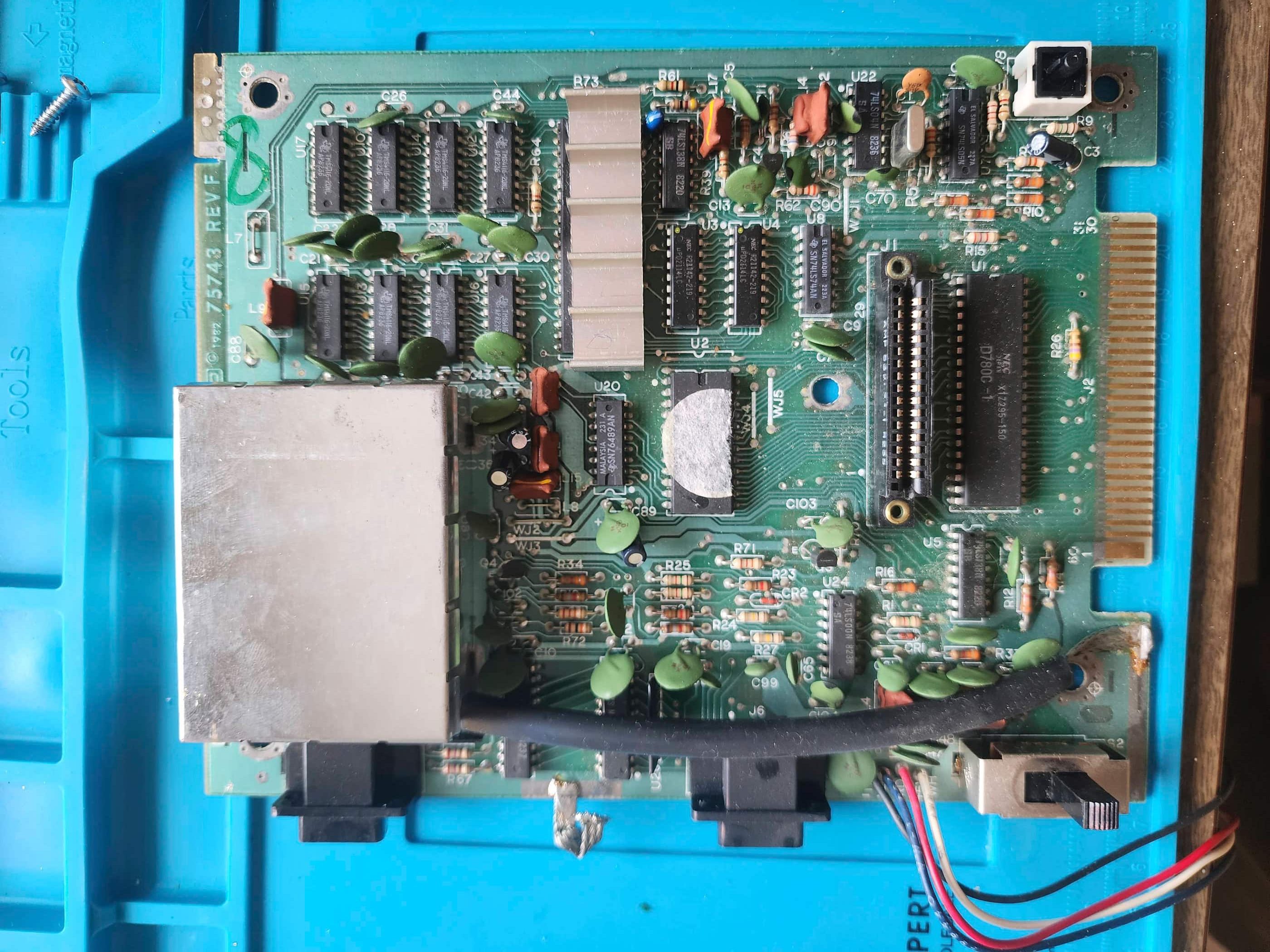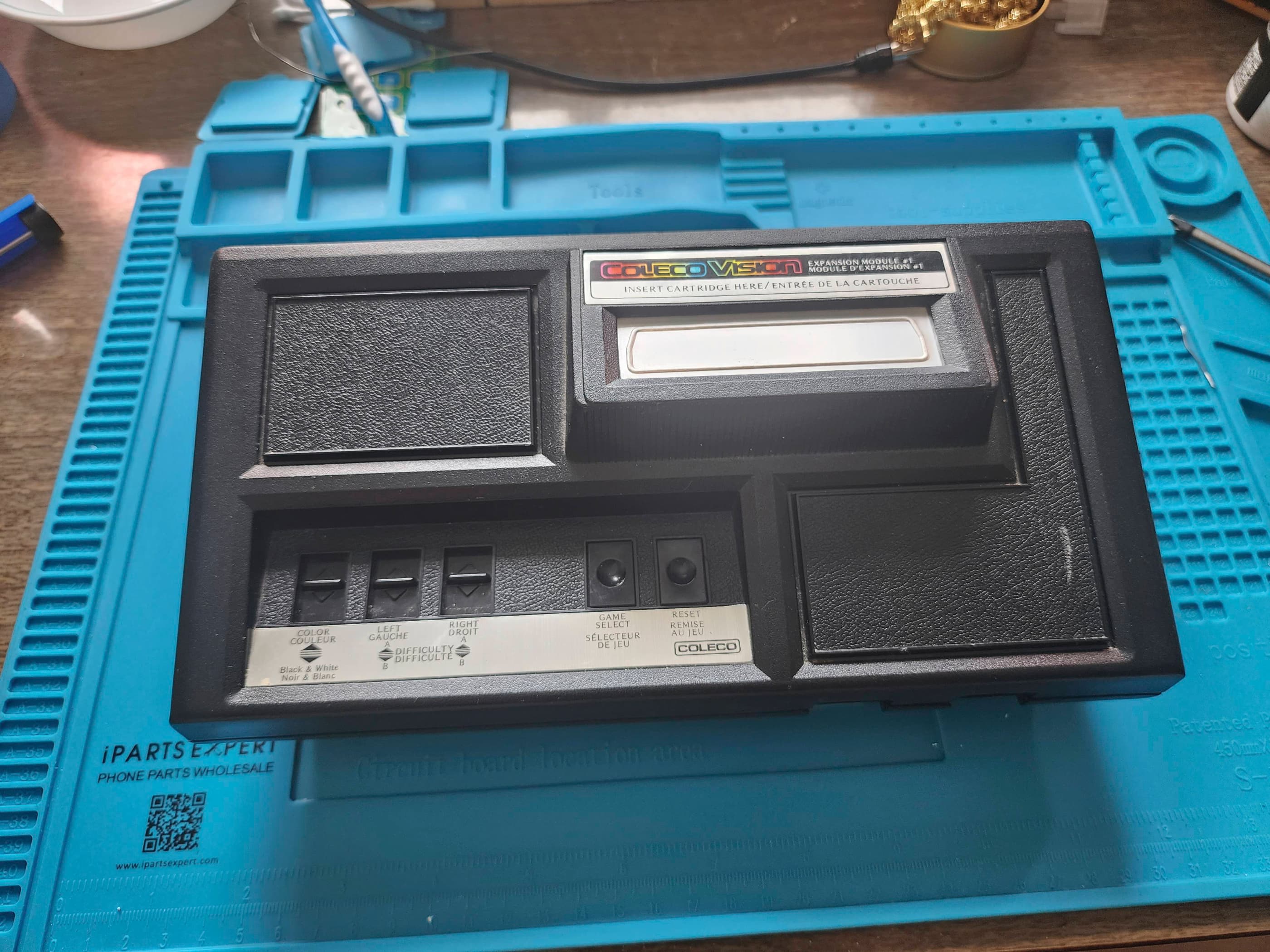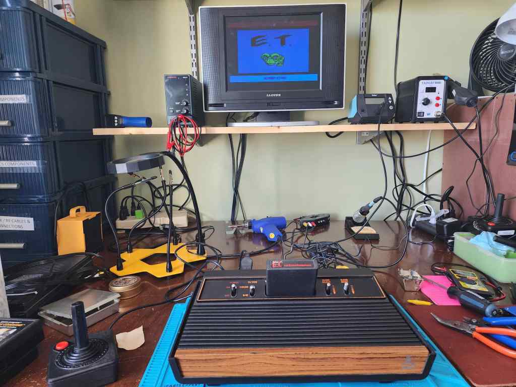Project Details: I acquired this unit locally and it was partially functional. However, like the Astrocade, it came from a smoker’s home and before I could do anything, it and all its accessories had to spend several weeks sealed inside garbage bags with baking soda. When I opened the system up, I discovered it was quite dirty and there were two issues: 1) an occasional graphics glitch; and 2) an occasional sound issue where it would be fine and then suddenly shut off. After determining the power adapter was not the issue, I then desoldered and disassembled the power switch, cleaned the contacts, applied dielectric grease, reassembled, and soldered the switch back onto the board. Success! This fixed the graphics. I tackled the sound issue first by determining that it wasn’t a failing chip by connecting an external speaker via a jumper wire to ceramic capacitor C88. When I received rich and consistent sound without issue, I then zeroed in on the RF box and the audio subcarrier. Adjusting it with a homemade vinyl tool, I was able to get the sound back. However, if I squeezed the outside of the RF box the sound cutoff again, which told me there was a short somewhere. I reflowed a bunch of solder points and that seemed to fix it; however, if the issue arises again in the future, this unit may be a candidate for a composite mod. After testing the machine for quite a while and being satisfied with the results, I then cleaned it thoroughly. I also disassembled and cleaned the controller, the driving wheel, the track ball, and the Atari expansion unit. 😁