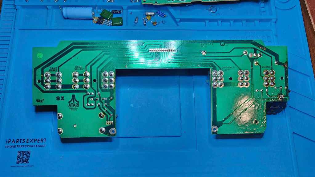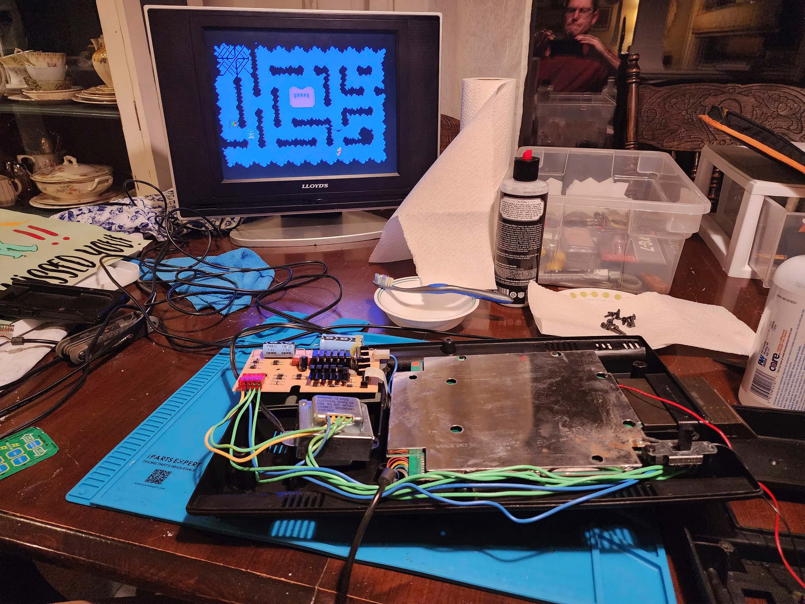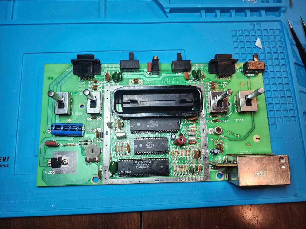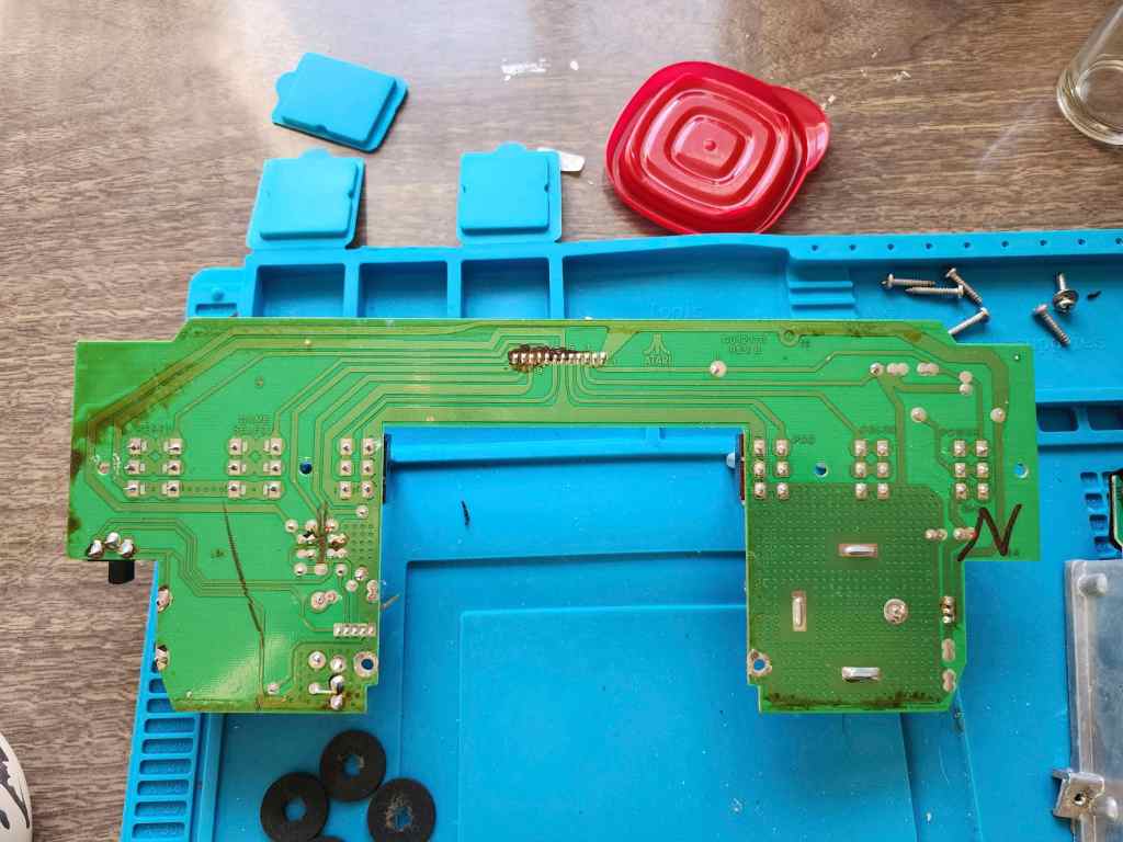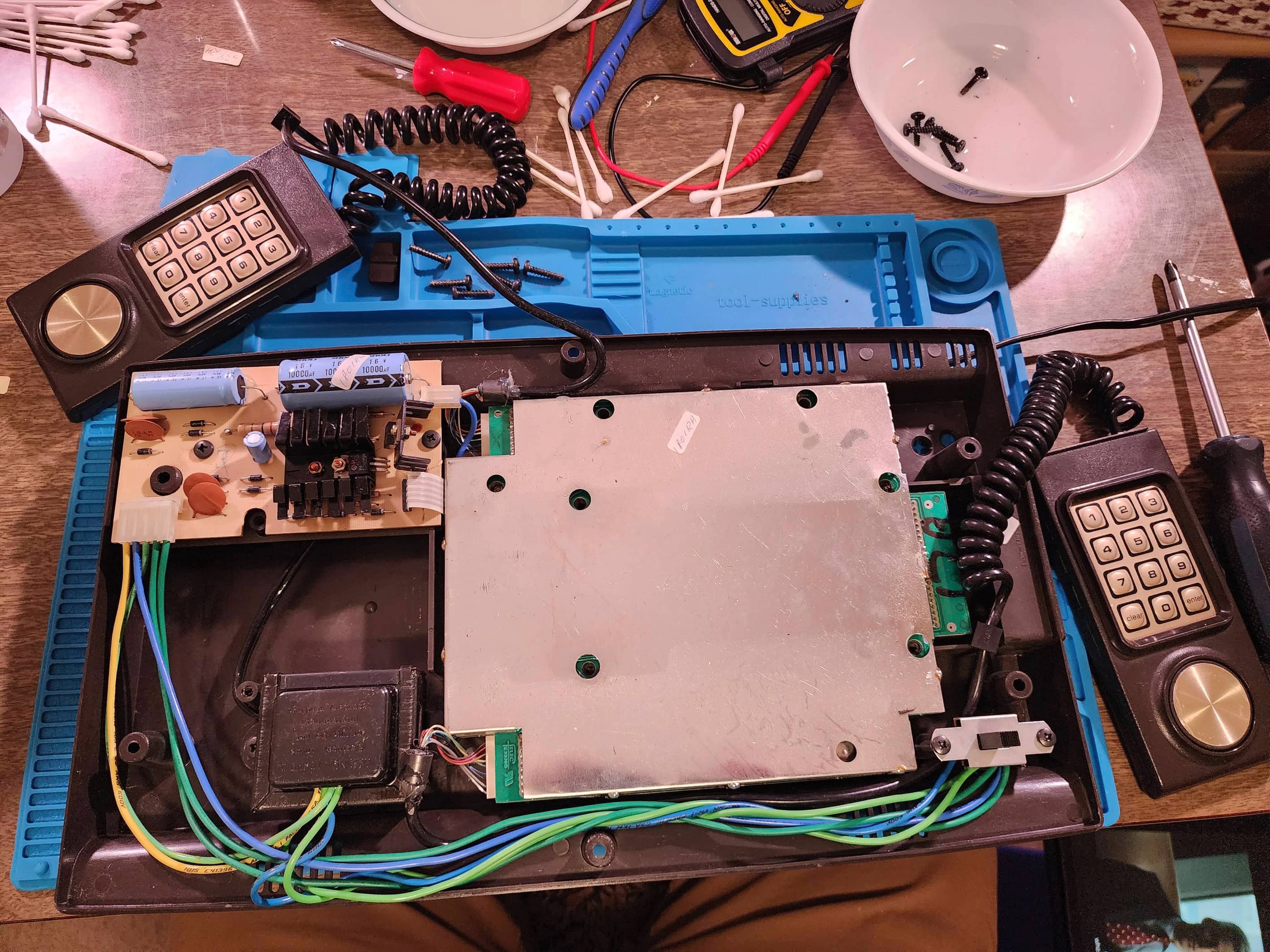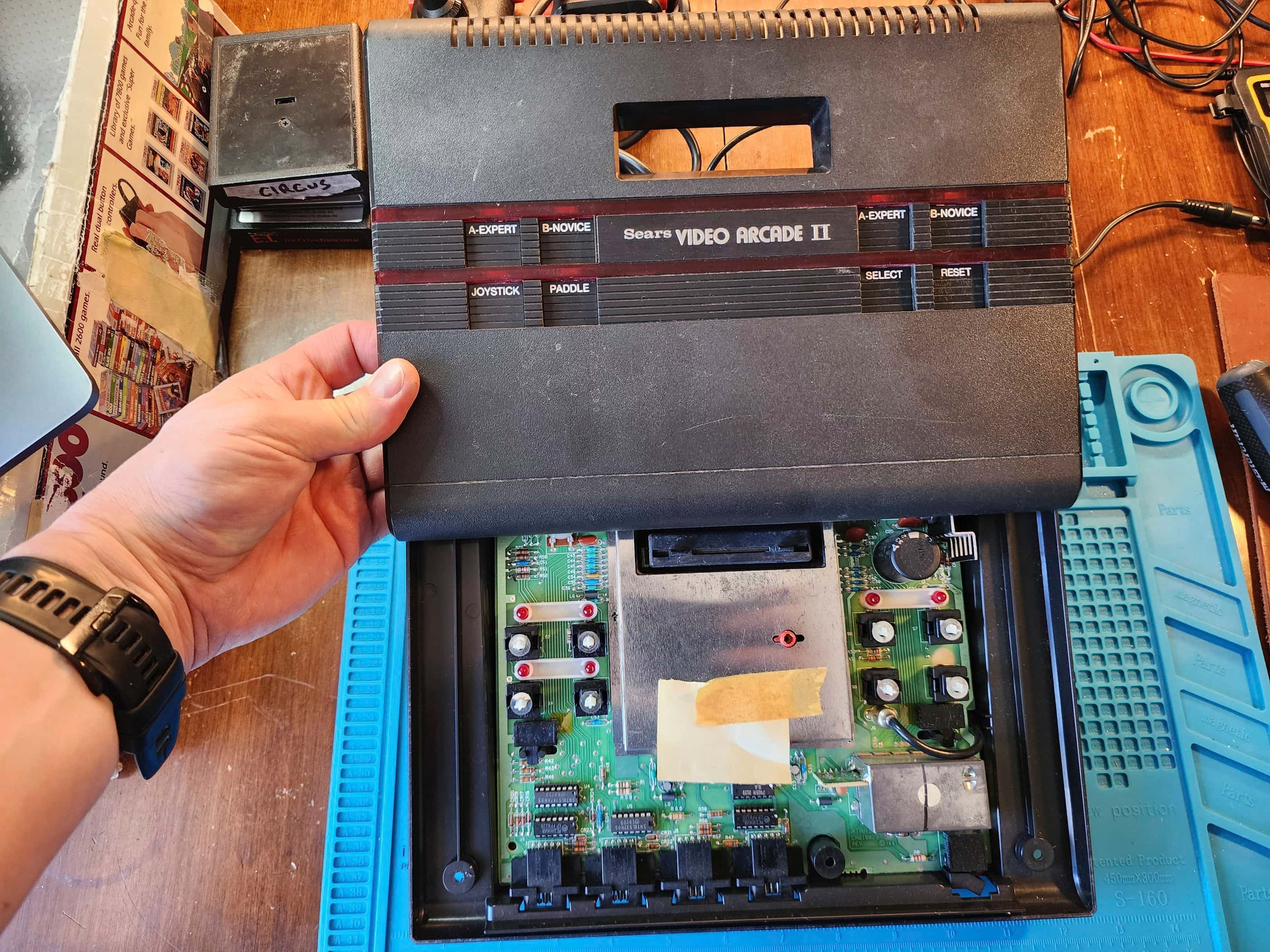Project Details: I acquired this unit locally and it was partially functional. However, like the Astrocade, it came from a smoker’s home and before I could do anything, it and all its accessories had to spend several weeks sealed inside garbage bags with baking soda. When I opened the system up, I discovered it was quite dirty and there were two issues: 1) an occasional graphics glitch; and 2) an occasional sound issue where it would be fine and then suddenly shut off. After determining the power adapter was not the issue, I then desoldered and disassembled the power switch, cleaned the contacts, applied dielectric grease, reassembled, and soldered the switch back onto the board. Success! This fixed the graphics. I tackled the sound issue first by determining that it wasn’t a failing chip by connecting an external speaker via a jumper wire to ceramic capacitor C88. When I received rich and consistent sound without issue, I then zeroed in on the RF box and the audio subcarrier. Adjusting it with a homemade vinyl tool, I was able to get the sound back. However, if I squeezed the outside of the RF box the sound cutoff again, which told me there was a short somewhere. I reflowed a bunch of solder points and that seemed to fix it; however, if the issue arises again in the future, this unit may be a candidate for a composite mod. After testing the machine for quite a while and being satisfied with the results, I then cleaned it thoroughly. I also disassembled and cleaned the controller, the driving wheel, the track ball, and the Atari expansion unit. 😁
