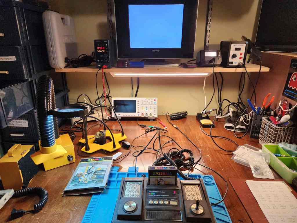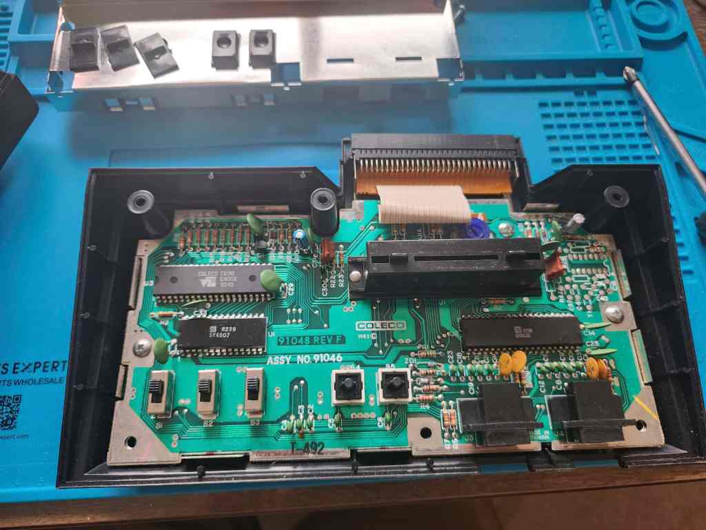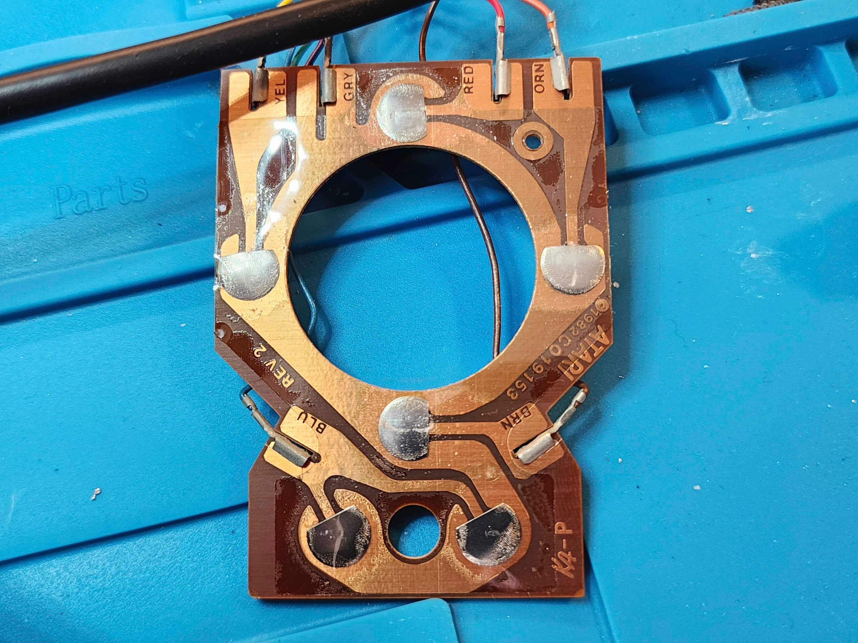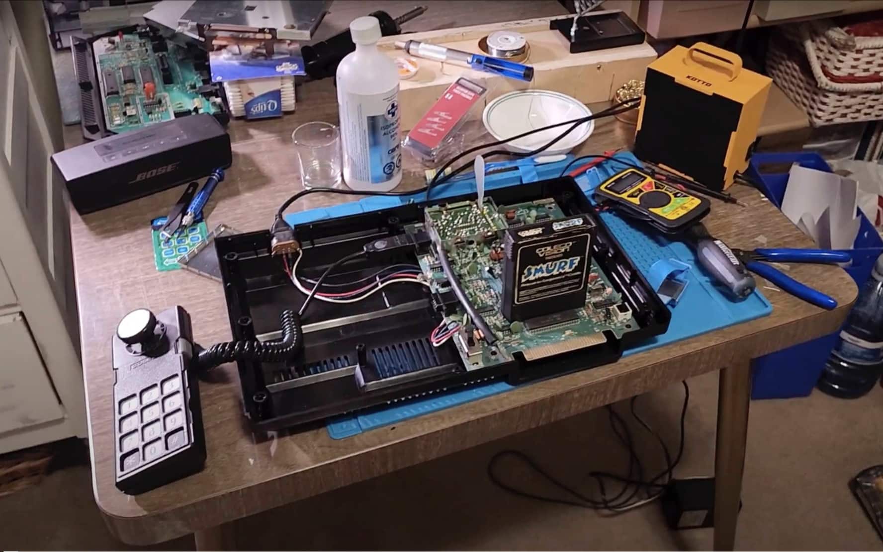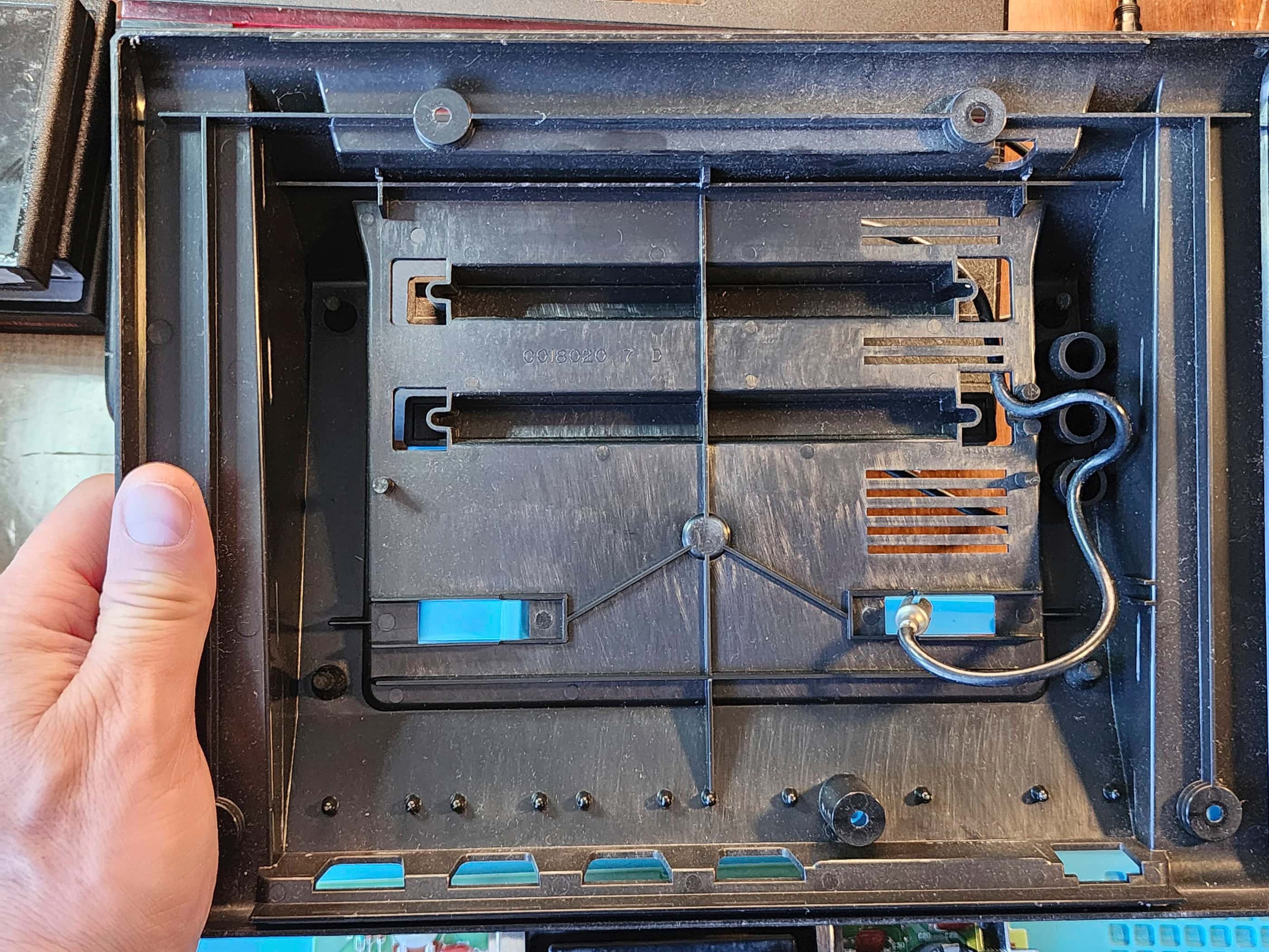 Project Details: I acquired this unit locally and it was partially functional. However, like the Astrocade, it came from a smoker’s home and before I could do anything, it and all its accessories had to spend several weeks sealed inside garbage bags with baking soda. When I opened the system up, I discovered it was quite dirty and there were two issues: 1) an occasional graphics glitch; and 2) an occasional sound issue where it would be fine and then suddenly shut off. After determining the power adapter was not the issue, I then desoldered and disassembled the power switch, cleaned the contacts, applied dielectric grease, reassembled, and soldered the switch back onto the board. Success! This fixed the graphics. I tackled the sound issue first by determining that it wasn’t a failing chip by connecting an external speaker via a jumper wire to ceramic capacitor C88. When I received rich and consistent sound without issue, I then zeroed in on the RF box and the audio subcarrier. Adjusting it with a homemade vinyl tool, I was able to get the sound back. However, if I squeezed the outside of the RF box the sound cutoff again, which told me there was a short somewhere. I reflowed a bunch of solder points and that seemed to fix it; however, if the issue arises again in the future, this unit may be a candidate for a composite mod. After testing the machine for quite a while and being satisfied with the results, I then cleaned it thoroughly. I also disassembled and cleaned the controller, the driving wheel, the track ball, and the Atari expansion unit. 😁