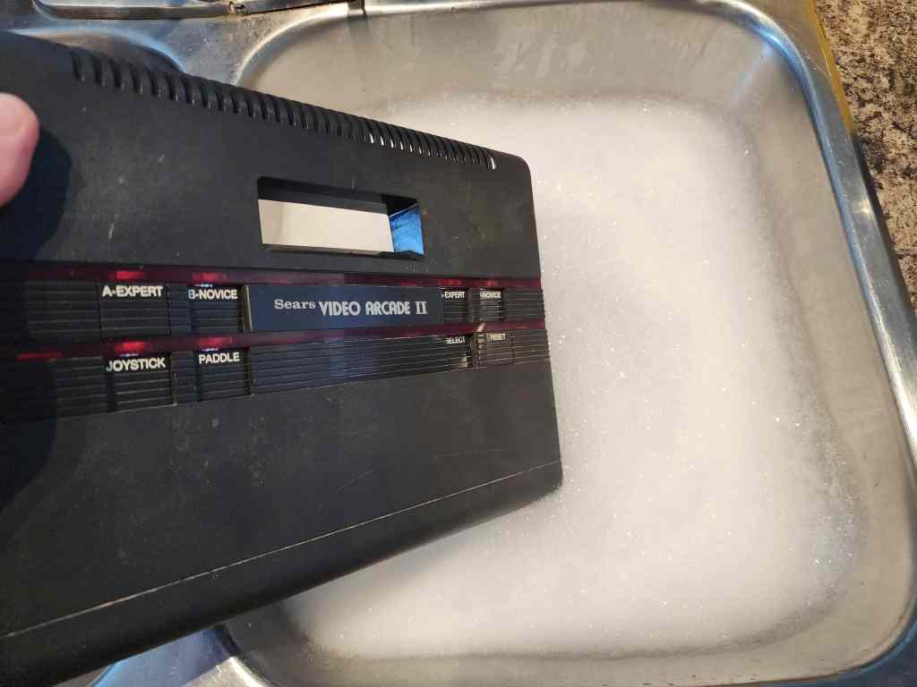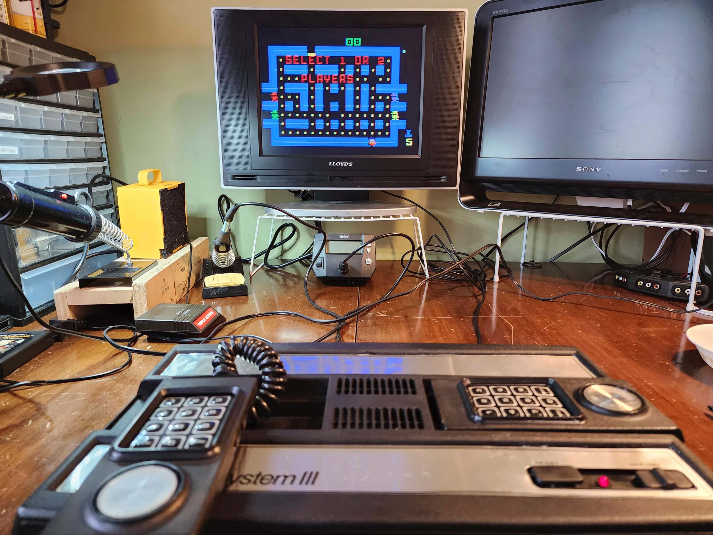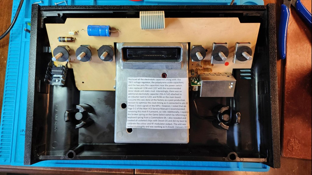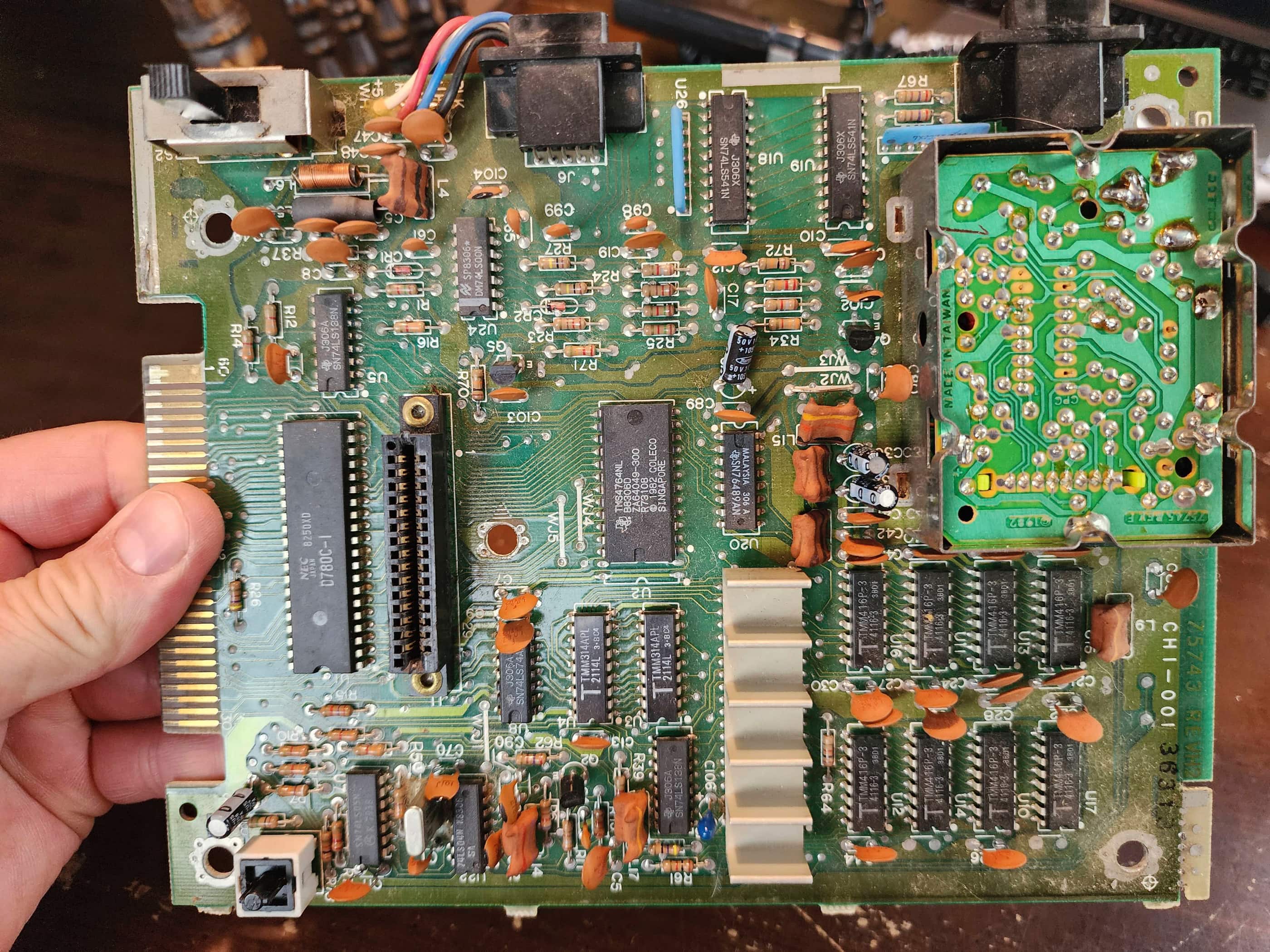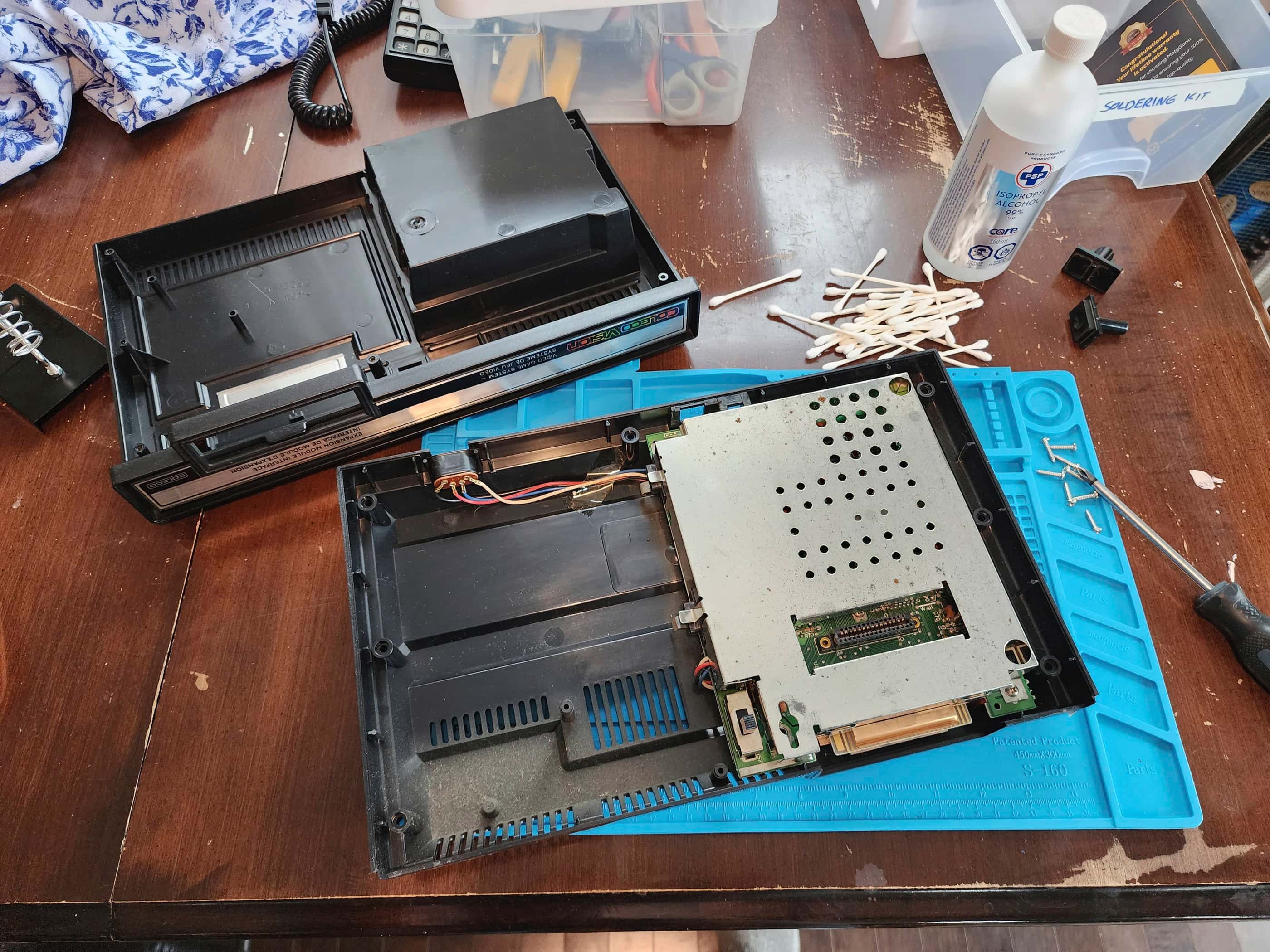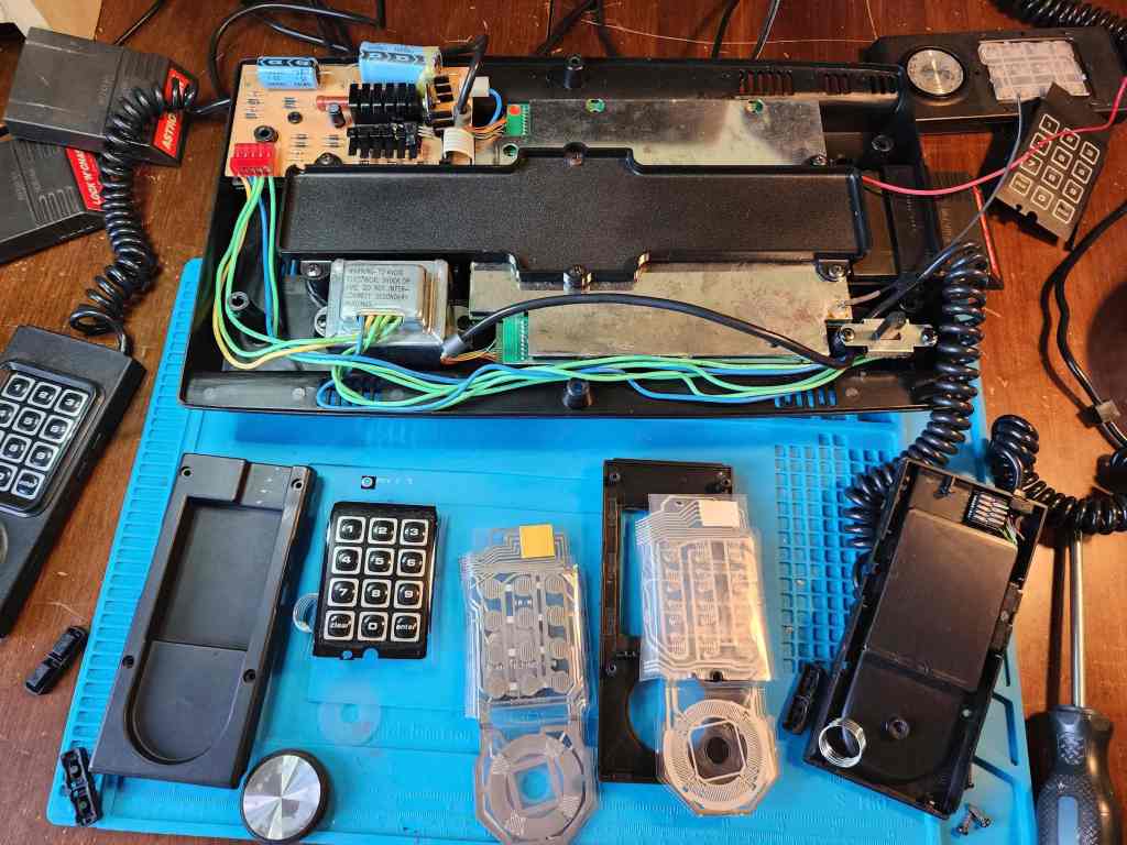 Project Details: I acquired this unit locally and it was partially functional. However, like the Astrocade, it came from a smoker’s home and before I could do anything, it and all its accessories had to spend several weeks sealed inside garbage bags with baking soda. When I opened the system up, I discovered it was quite dirty and there were two issues: 1) an occasional graphics glitch; and 2) an occasional sound issue where it would be fine and then suddenly shut off. After determining the power adapter was not the issue, I then desoldered and disassembled the power switch, cleaned the contacts, applied dielectric grease, reassembled, and soldered the switch back onto the board. Success! This fixed the graphics. I tackled the sound issue first by determining that it wasn’t a failing chip by connecting an external speaker via a jumper wire to ceramic capacitor C88. When I received rich and consistent sound without issue, I then zeroed in on the RF box and the audio subcarrier. Adjusting it with a homemade vinyl tool, I was able to get the sound back. However, if I squeezed the outside of the RF box the sound cutoff again, which told me there was a short somewhere. I reflowed a bunch of solder points and that seemed to fix it; however, if the issue arises again in the future, this unit may be a candidate for a composite mod. After testing the machine for quite a while and being satisfied with the results, I then cleaned it thoroughly. I also disassembled and cleaned the controller, the driving wheel, the track ball, and the Atari expansion unit. 😁
