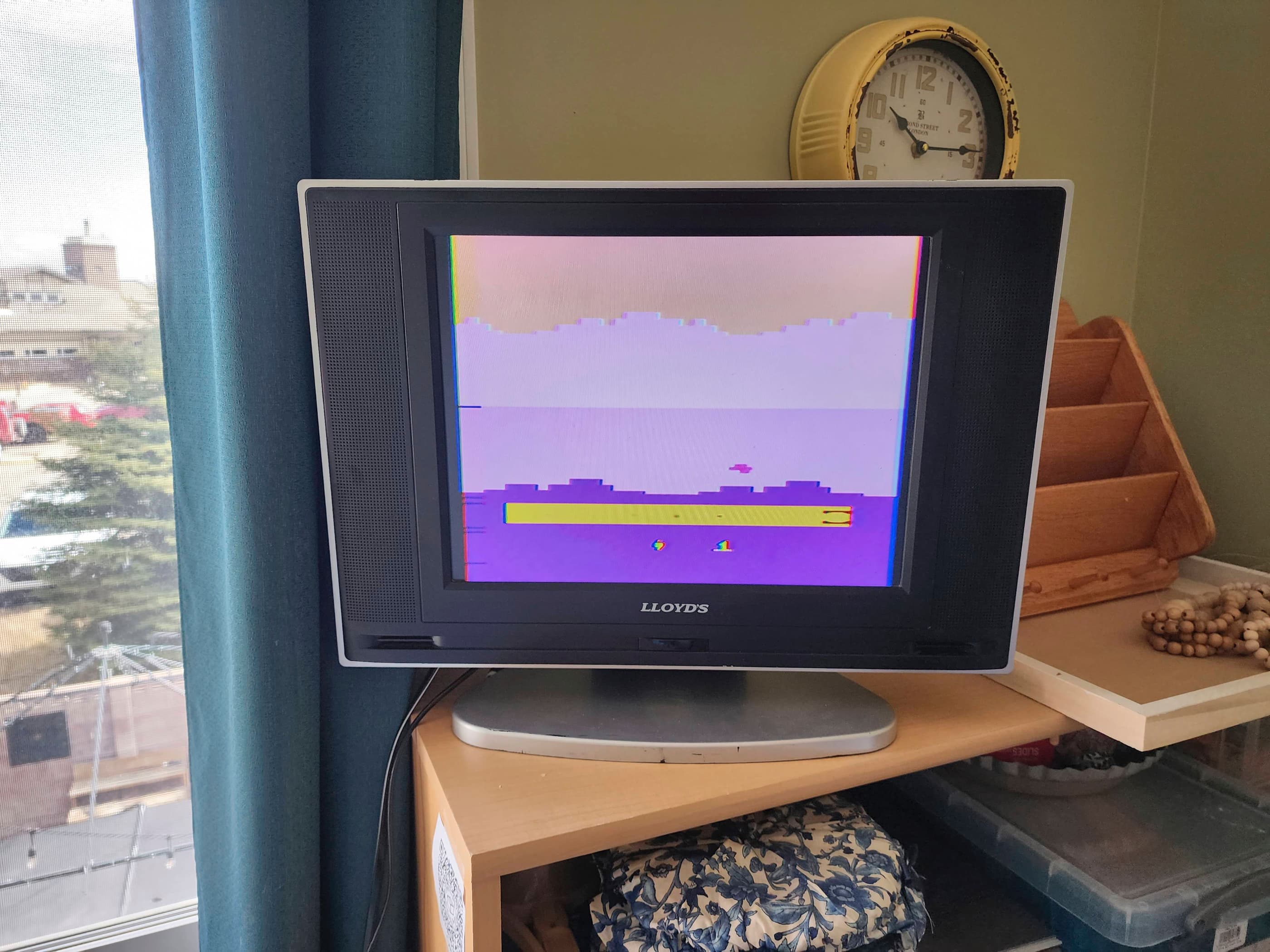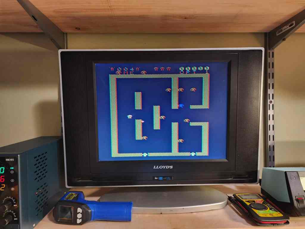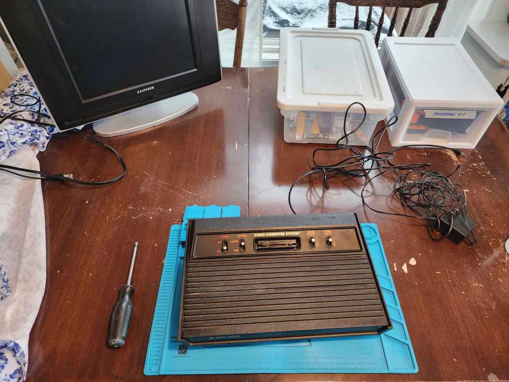 Project Details: This system came cheap with an original Atari 2600 box, except the serial number on the console did not match the number on the box. After confirming the power adapter was working despite having been spliced at some point in time, I inserted a cartridge and turned the unit on. I was instantly met with a grey flickering screen and loud screeching. Hmmm… 🤔 I opened the console, removed the RF shielding, and used IPA to thoroughly clean the cartridge slot. For good measure, I also cleaned the pins on the cartridge. I powered the unit on and was pleased to see a grainy Missile Command pop onto the screen. I connected a joystick, started the game, and was further relieved when I heard the proper sounds. I adjusted the RF tuning on the board, but the picture still wasn’t right.