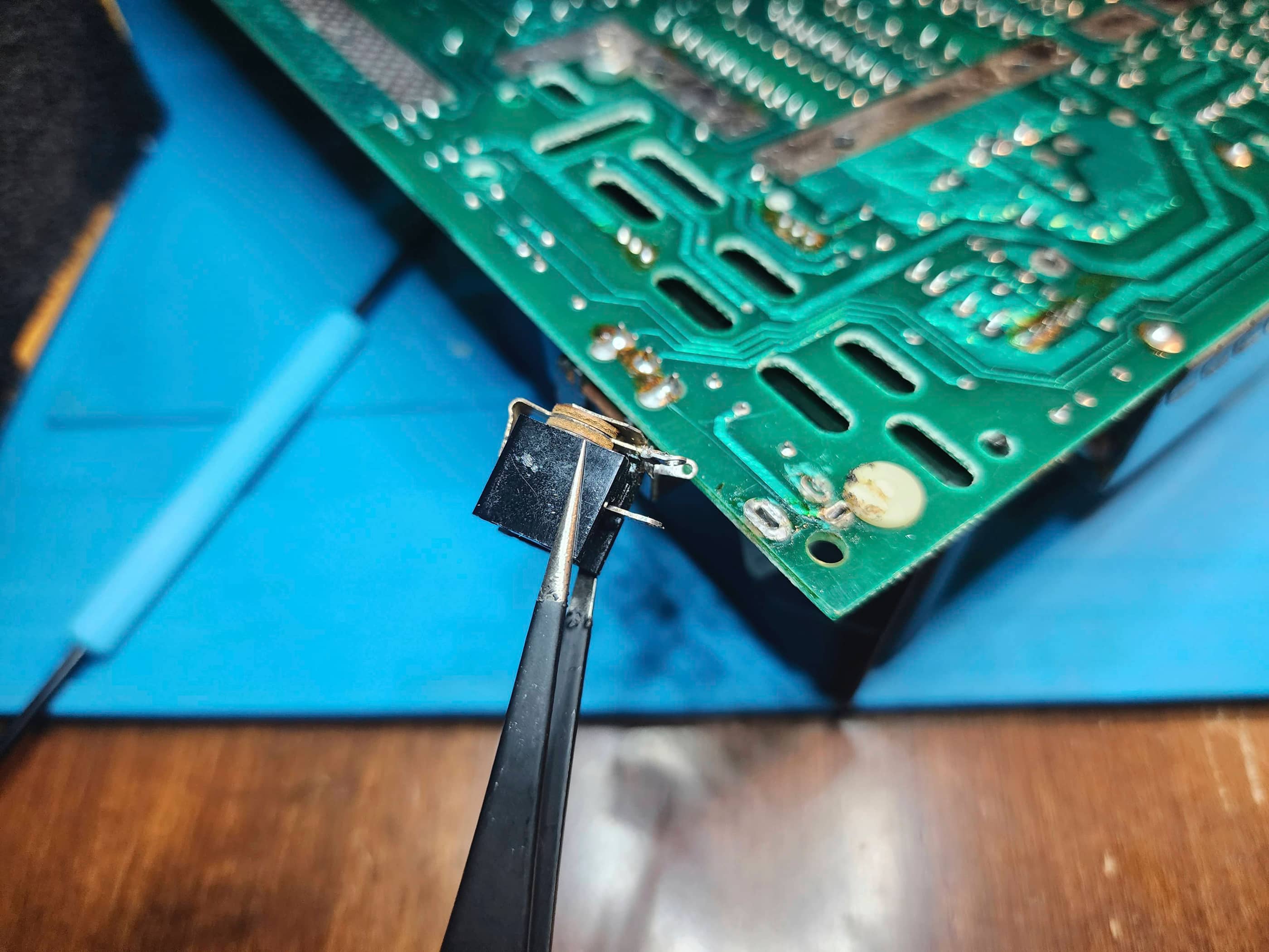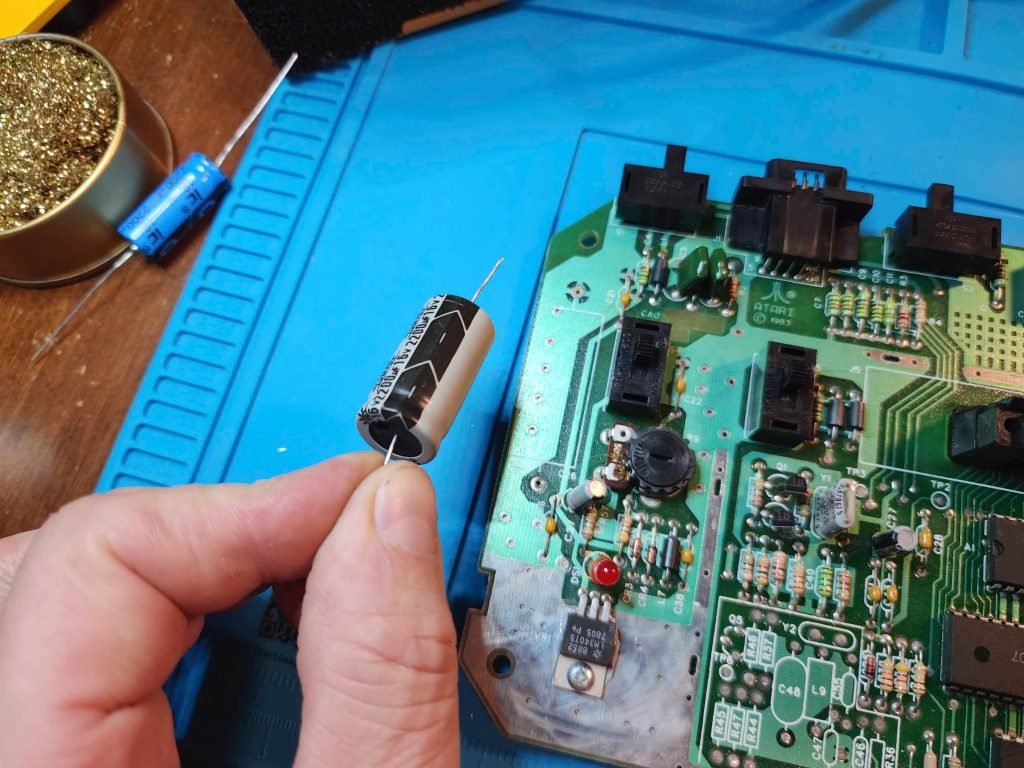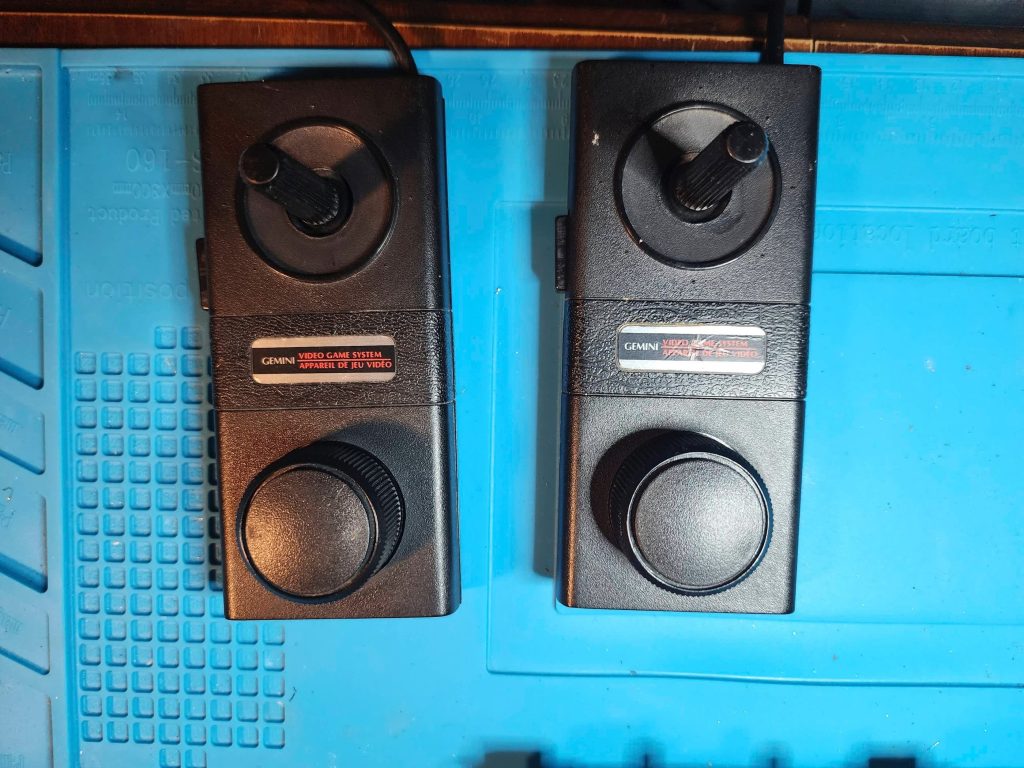 One issue fixed. For the joystick port, I continued to do continuity checks with a focus on the pins 4 & 8 that control movement to the right. Nothing came back indicating there was a problem, but I still decided to reflow and add new solder where the port pins join the board. I was surprised when the existing solder disappeared into the hole as soon as my iron touched it. I proceeded to reflow and add new solder to all the pins on both ports. I then tested it with a couple games. Both joysticks now had full movement. The second issue was now fixed. I then disassembled and cleaned the joysticks, noting that at some point, they had come in contact with water. I also discovered the exoskeleton of a bug in one. 😯 After cleaning I reassembled the joysticks and then tested them. The joysticks and paddles worked great. I decided that since the unit was still open that I’d recap it (using a 50v 4.7μF capacitor to replace the original 35v 4.7μF one) and also replace the 7805 regulator. Once done I tested it with several games and then reassembled it. The Gemini is now a fully functioning system. 🙂