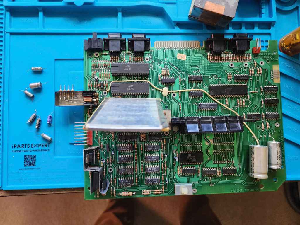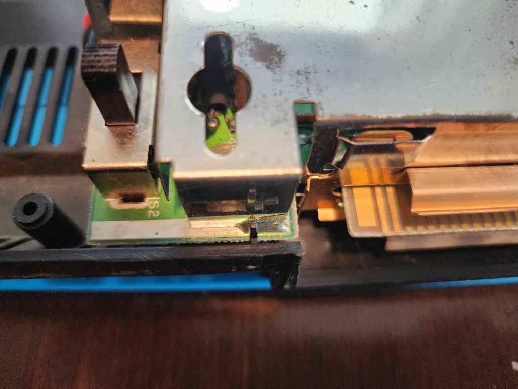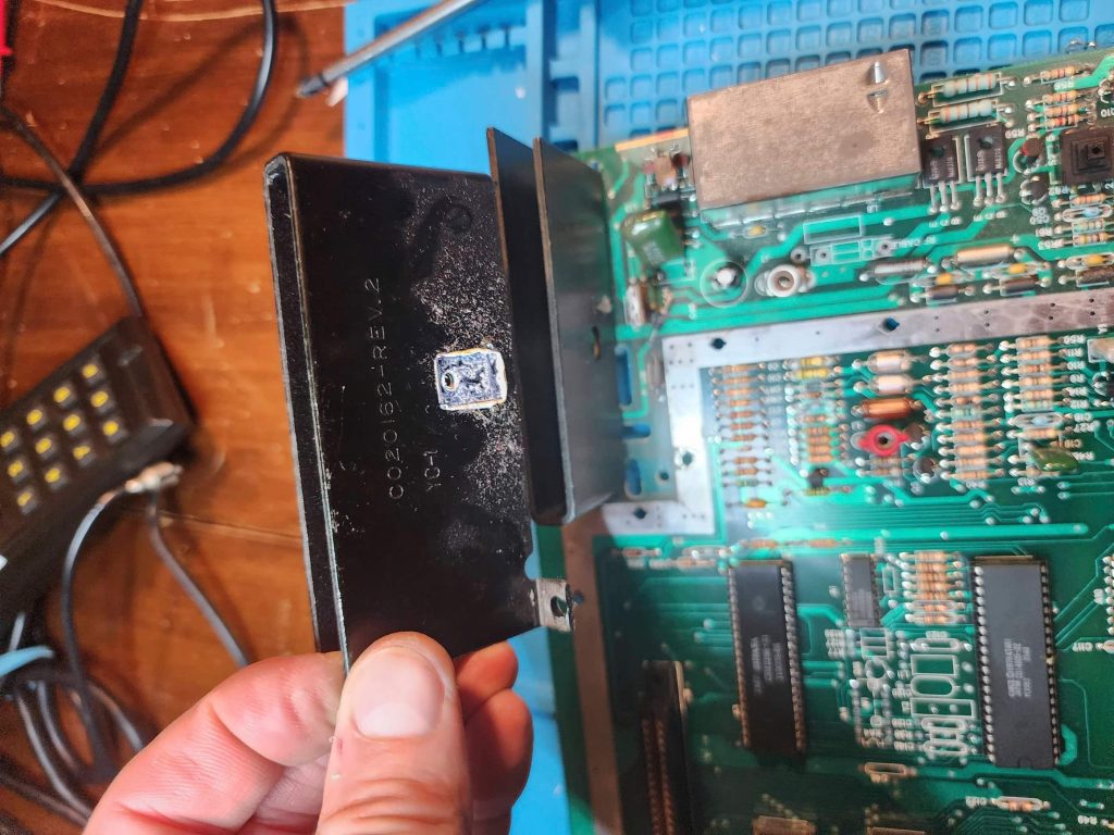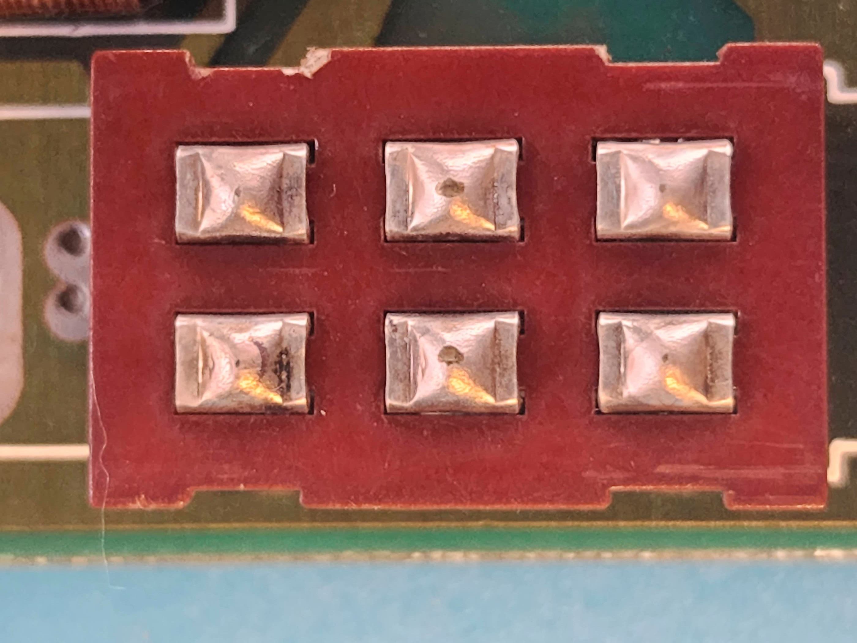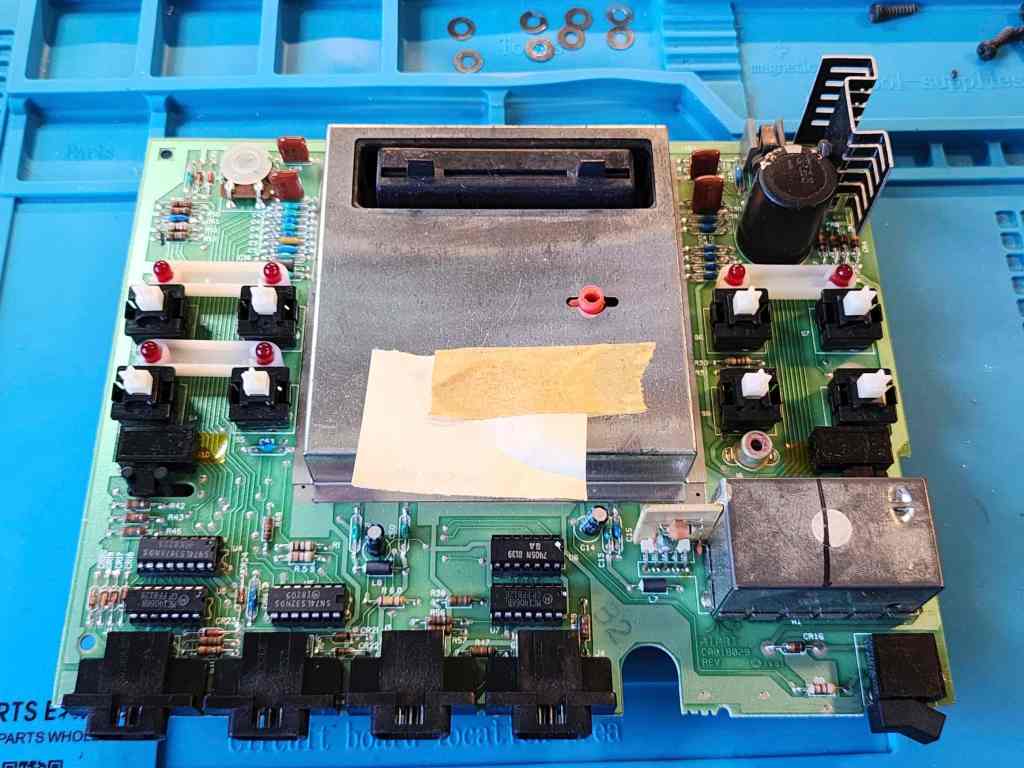 As the machine was working, I decided not to re-cap it, but in the process of putting new thermal grease onto the voltage regulator and heatsinks, I bent the regulator too far forward and wrecked it. Doh! 🤪 This is because the ground pin is set farther back on the board and is not lined up with the in / out pins. Fortunately, I keep a healthy supply of 7805 5v regulators on hand and it only took a couple minutes to replace it. I also disassembled the power switch, cleaned the dirty contacts, applied dielectric grease, and reassembled the switch. Unfortunately, I put the contact strip in the wrong slot and then spent several minutes trying to figure out why the machine didn’t turn on. Doh! 🤪 After I figured it out and fixed the problem, the machine turned on without issue.