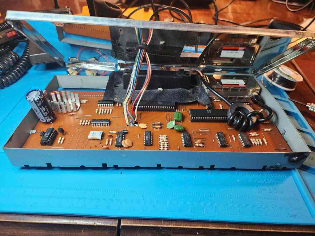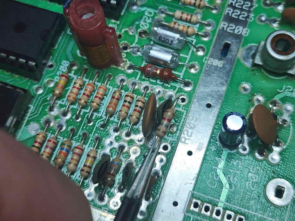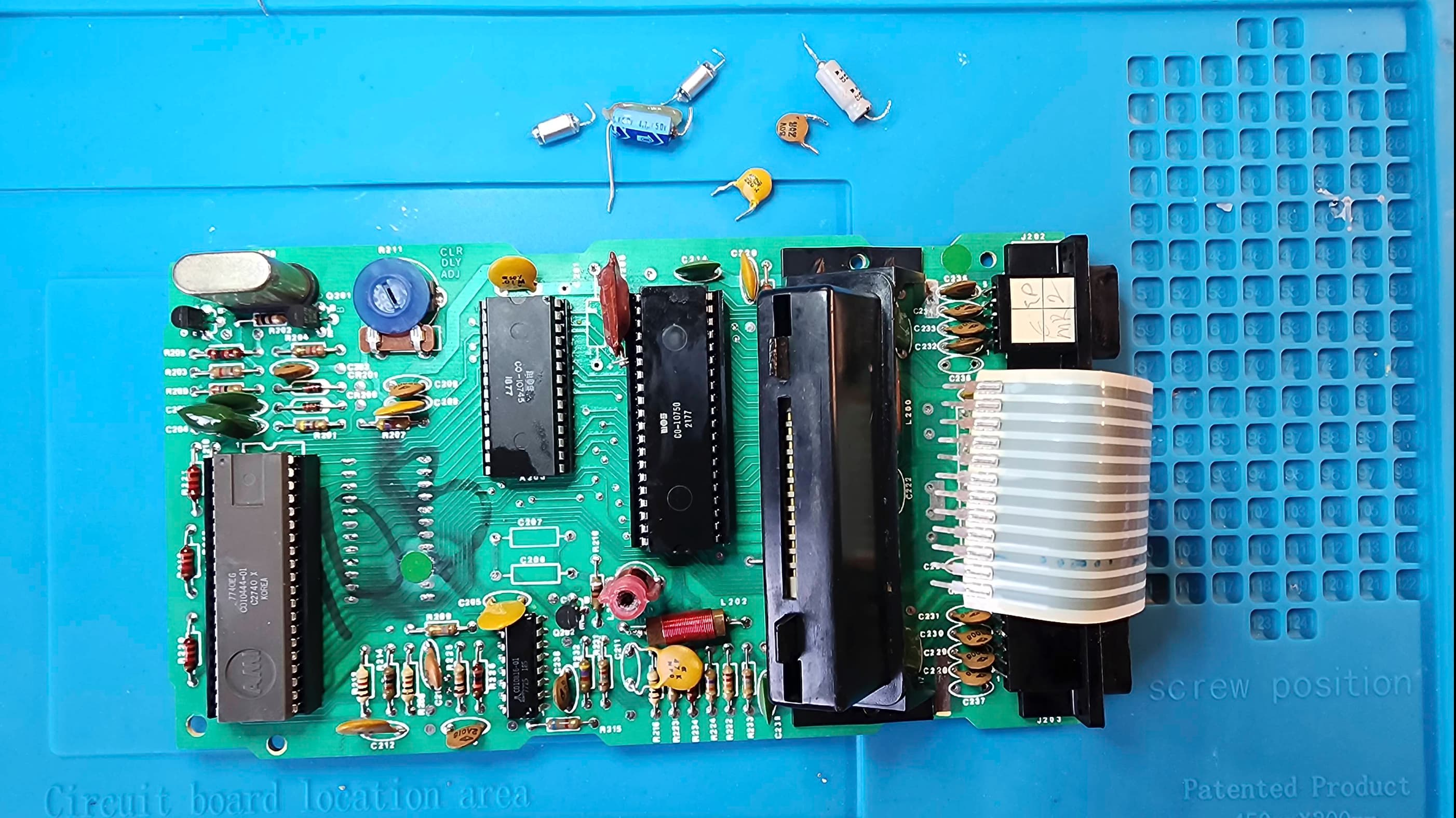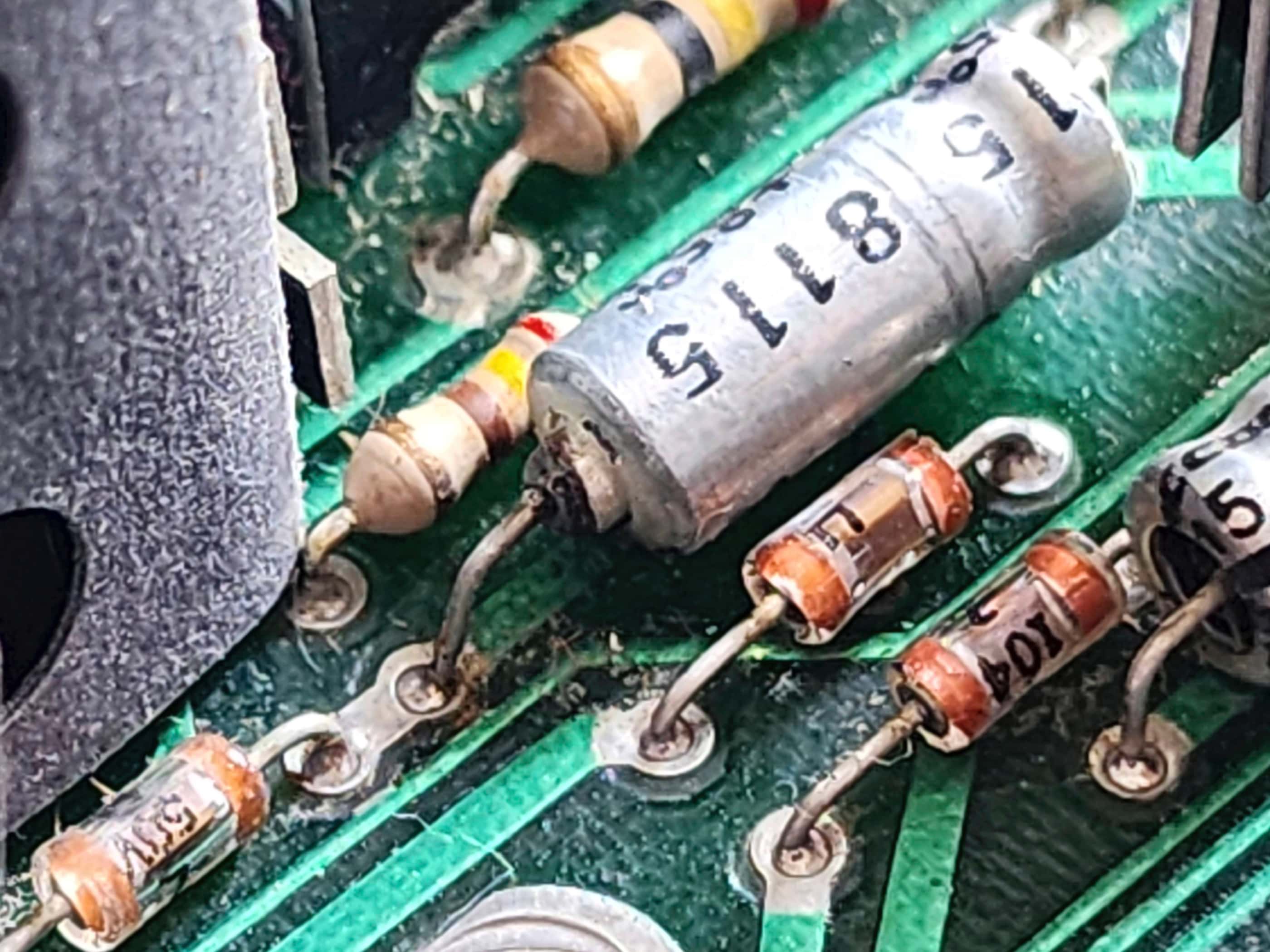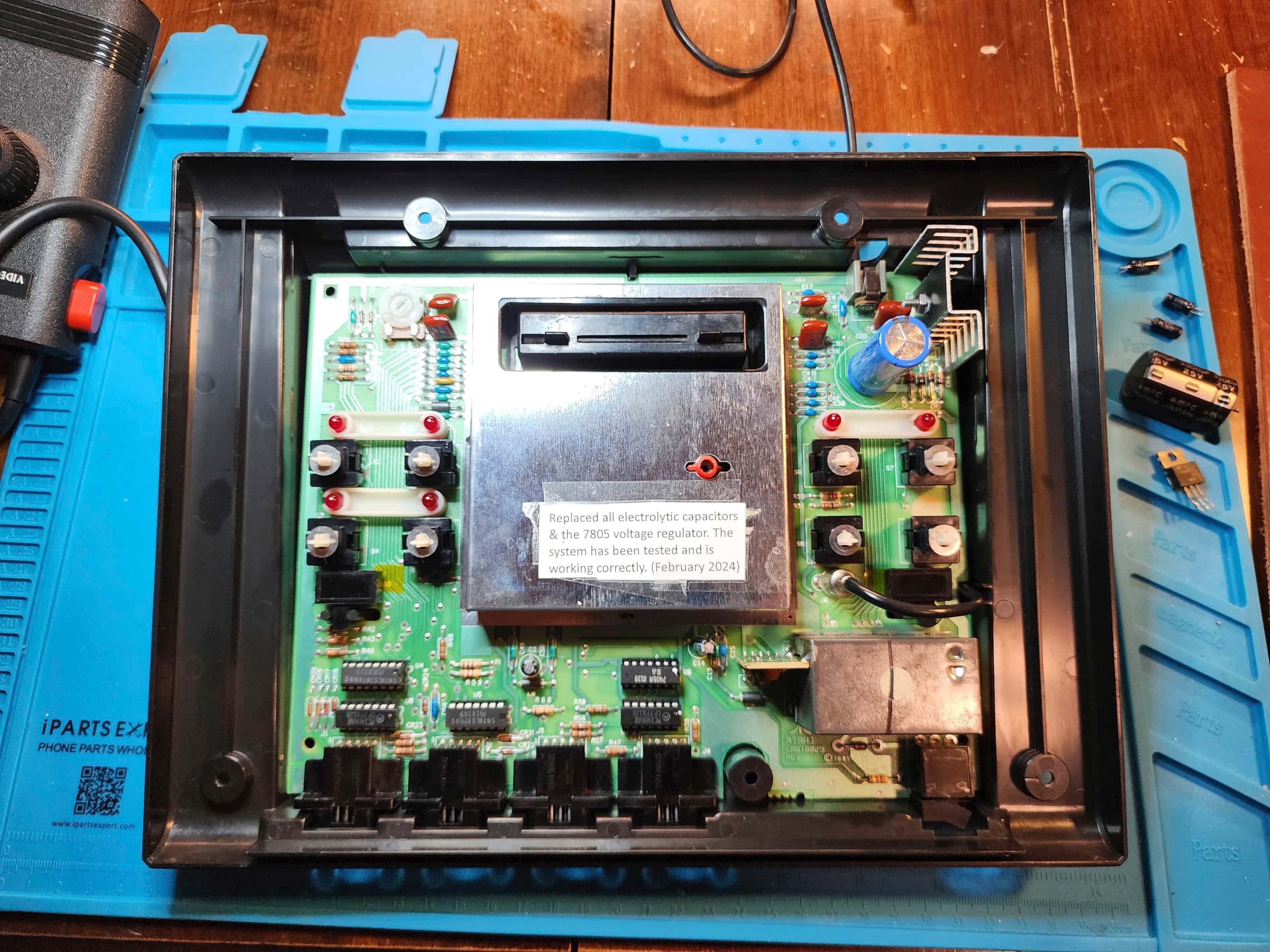 Once I had taken everything apart, I set to work on re-capping the entire unit along with: replacing the 7805 voltage regulator; performing the recommended mylar capacitor replacement on the upper board; the recommended anti-static Zener diode mod on C236 and C237 on the main board; and finally, the recommended polystyrene audio capacitor replacements also on the main board.