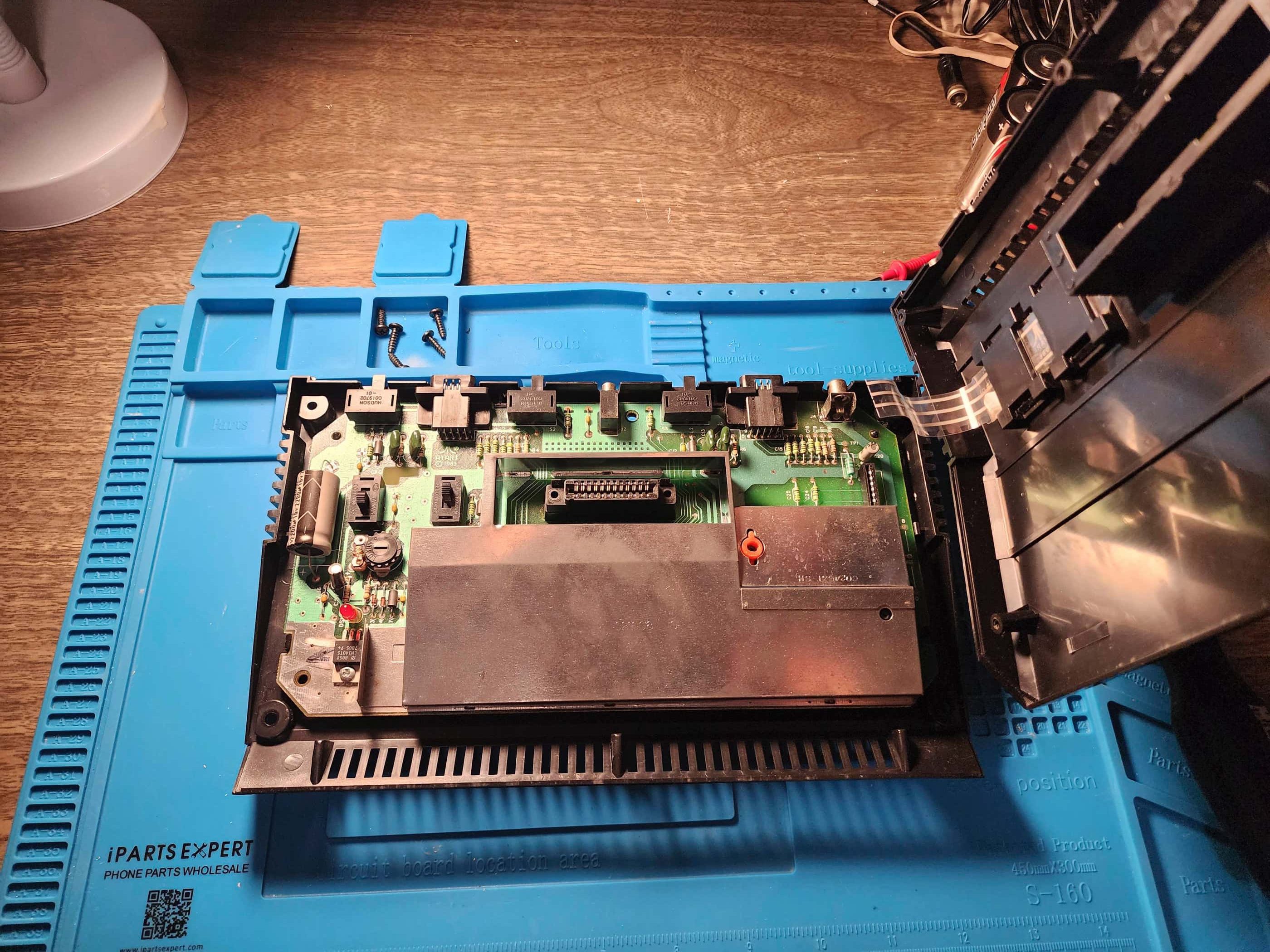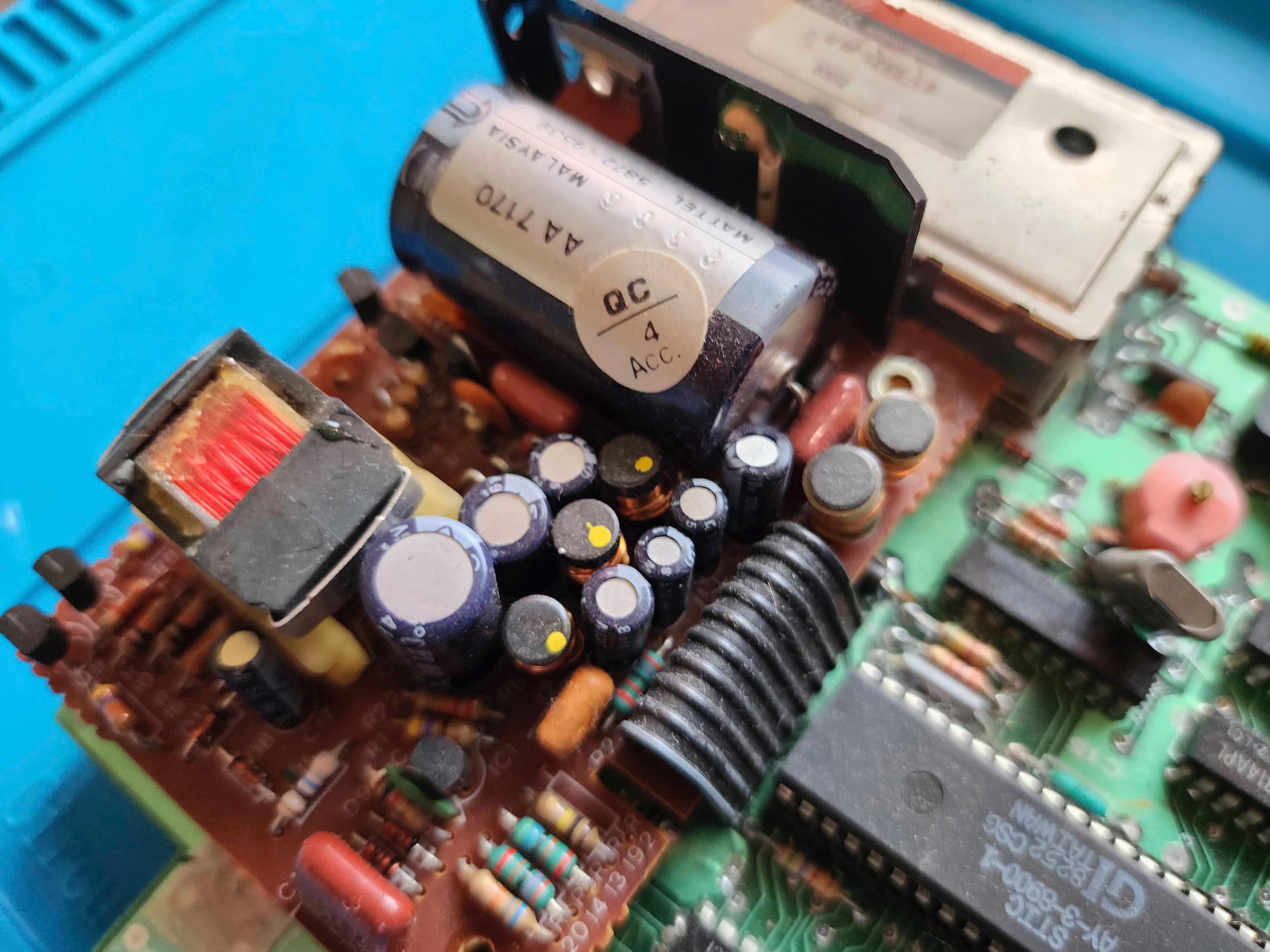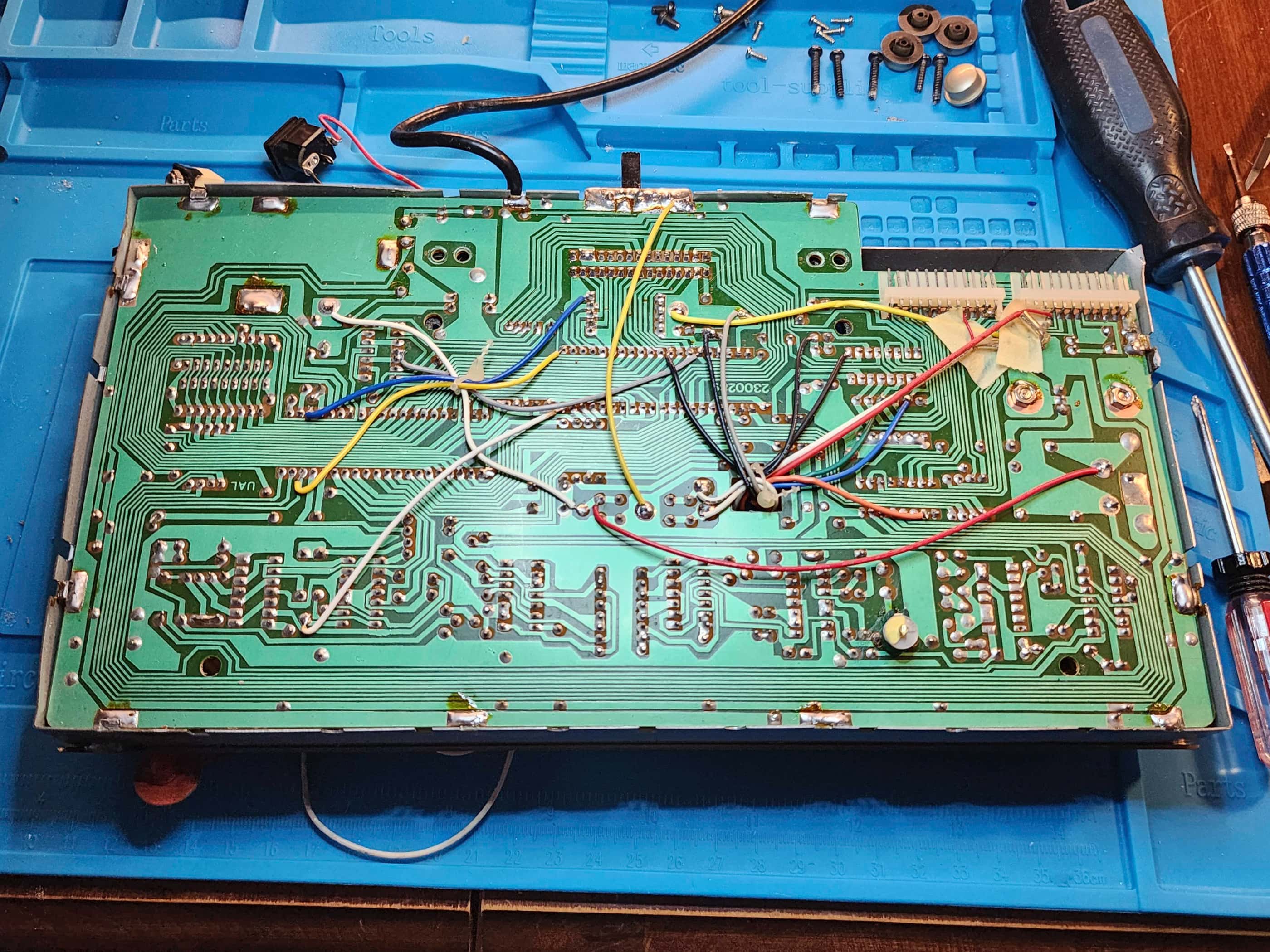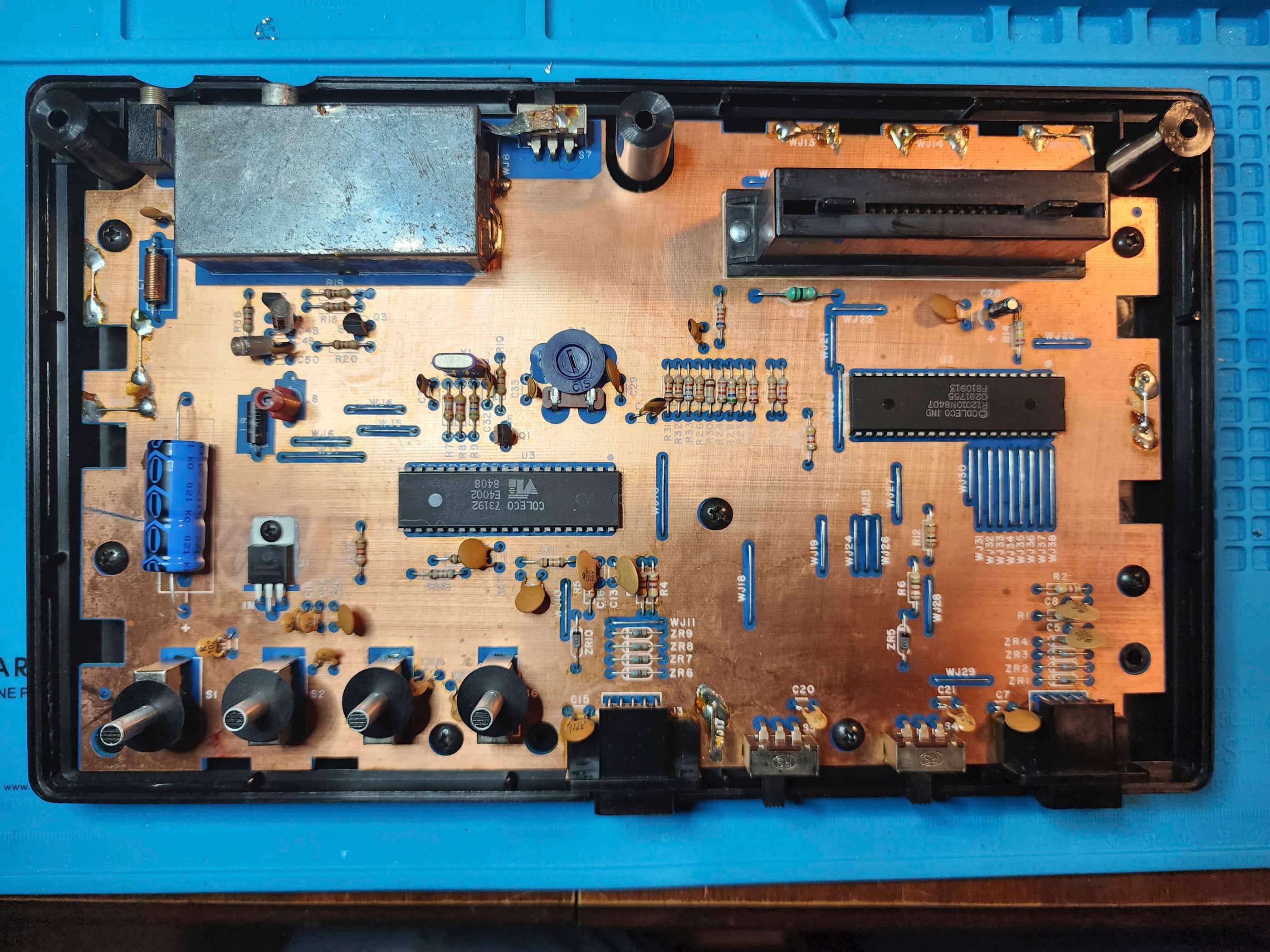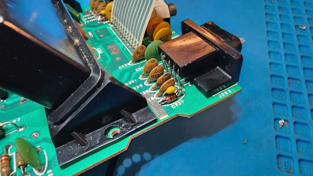 Once I had taken everything apart, I set to work on re-capping the entire unit along with: replacing the 7805 voltage regulator; performing the recommended mylar capacitor replacement on the upper board; the recommended anti-static Zener diode mod on C236 and C237 on the main board; and finally, the recommended polystyrene audio capacitor replacements also on the main board.
