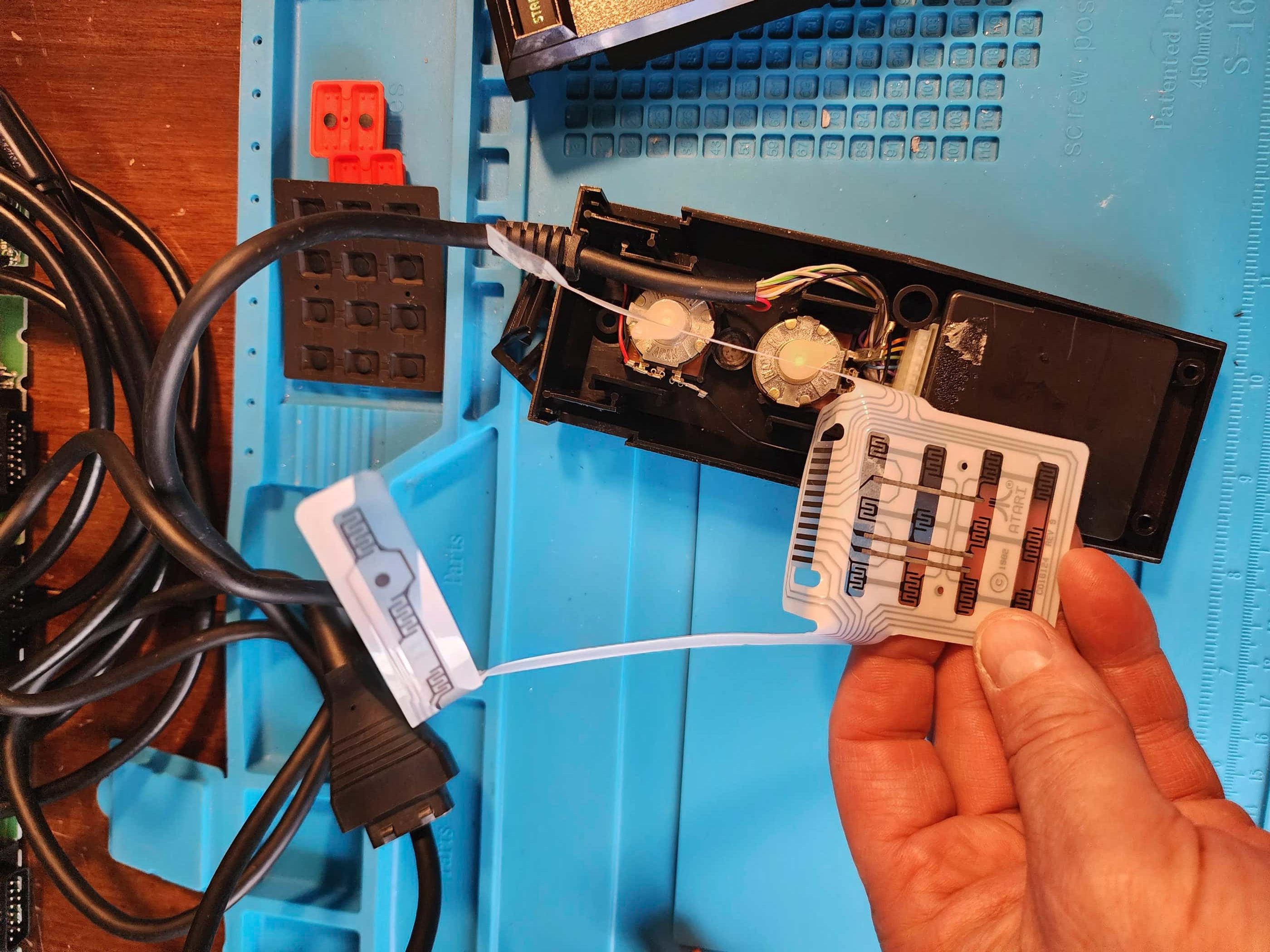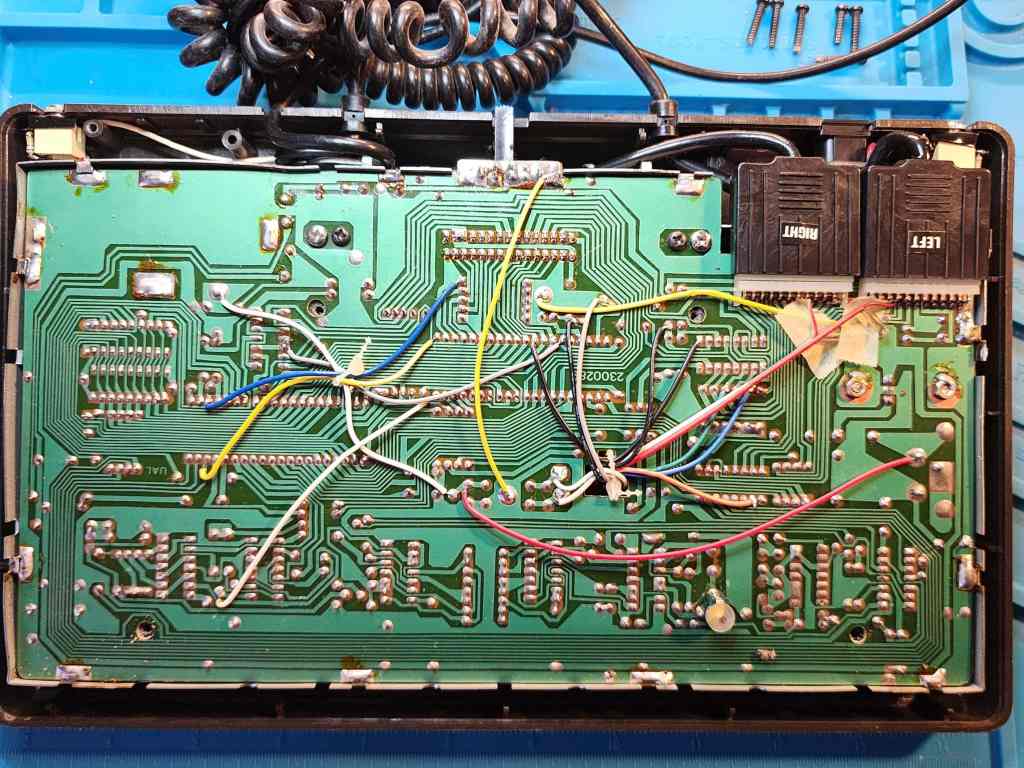 Like the console, the controllers were quite dirty and at some point, someone had spilled a drink that had seeped onto the flex circuit of the left controller. This added extra time to cleaning the contacts with IPA. This is when I noted the reasons why the left controller would not move anything down and why the left fire button did not work: broken traces on the flex circuit. Not have a silver flex painting pen on hand, I improvised a solution using an old Atari 5200 controller flex circuit. Cutting some tiny pieces from the exposed 5200 circuits, I then carefully taped these as bridges to the gaps on the HMG’s controllers. A continuity test indicated that the solution worked, but it still needed to be tested. I plugged in Robot Killer (a Robotron clone) and sure enough, I could move my character around without issue. Though not entirely perfect, the left fire button worked while the right one was flawless.