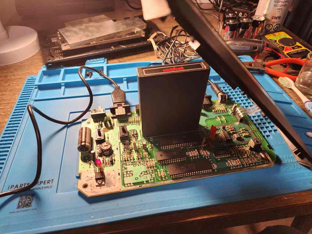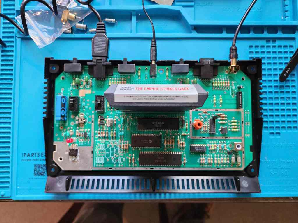 Before I went further though, I used a multimeter on the power adapter and determined that it indeed, fully functional; outputting the correct voltages. Once I’d removed all of the RF shielding I then replaced the RF cable. I excitedly powered on the system and…. nothing. I then began to test voltages coming out of the rectifier and then the various voltage regulators on the board. During this process, I noticed that capacitor C10 (16v 100 μF) had a small leak. I decided to replace all of the capacitors on the board and when all this was done, I powered it on and… it sprung to life!! 👏 😃 I then tested some of the cartridges and found that some worked and others didn’t.
