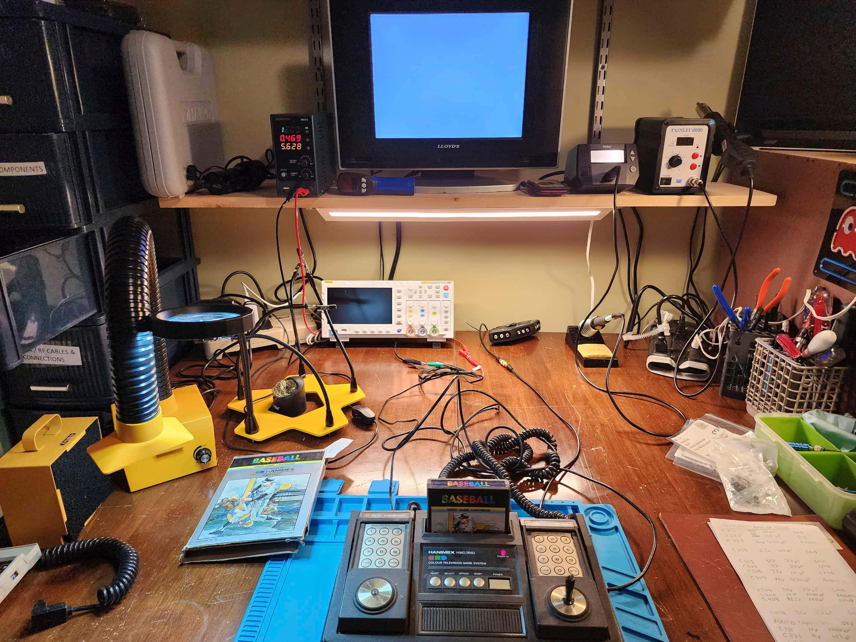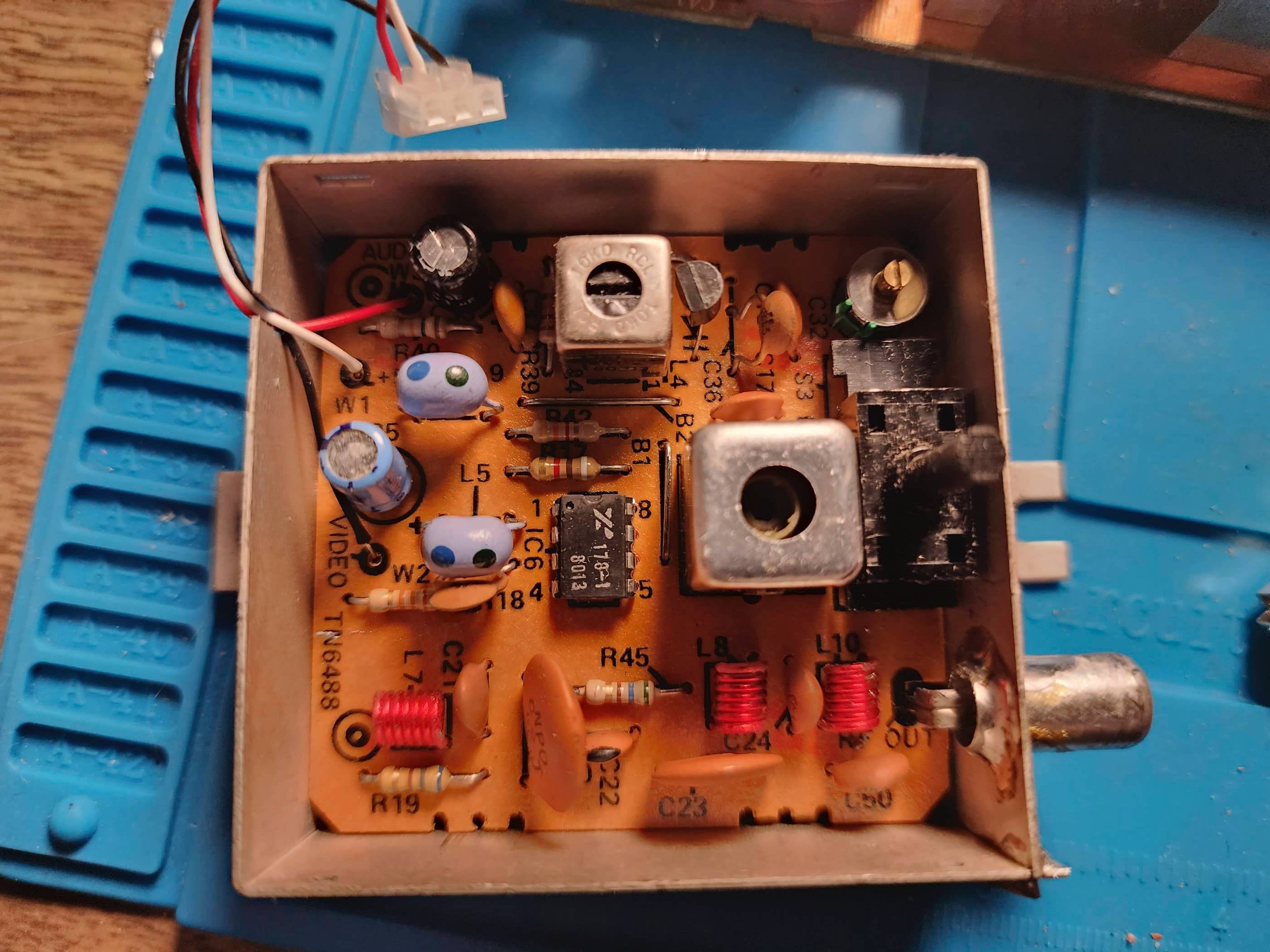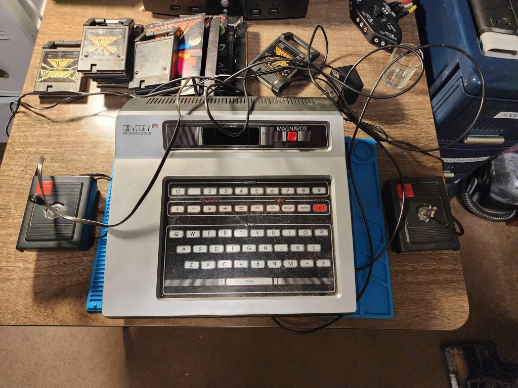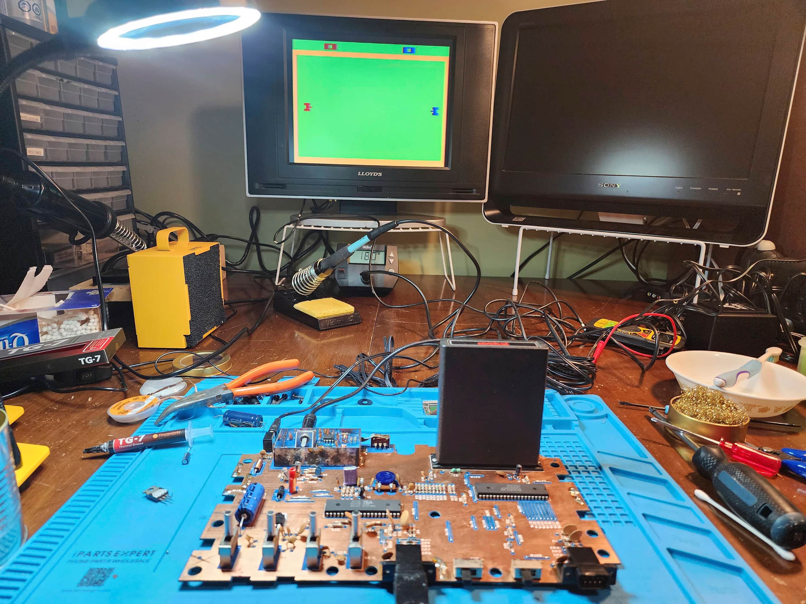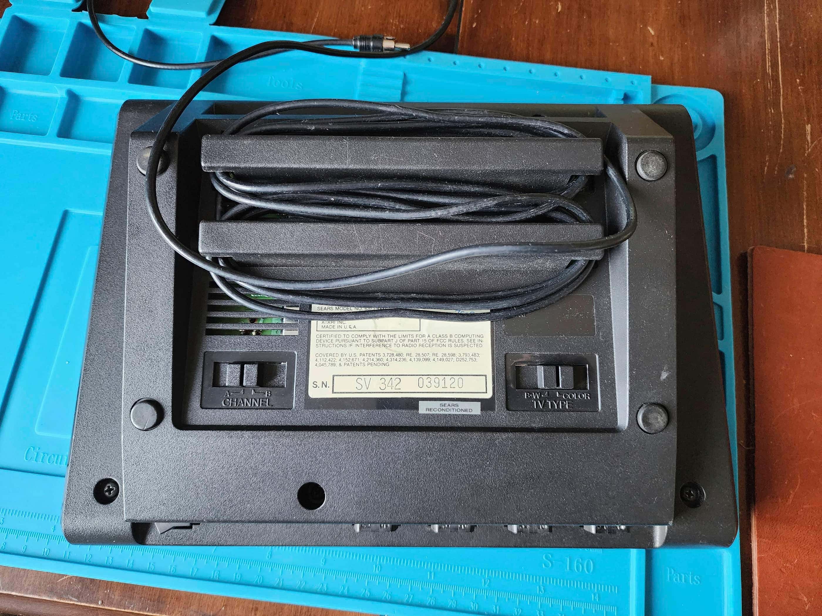 Project Details: We found this at the local thrift store in its original box along with 8 games. It even had some of the original documentation. The weird end of the RF cable was something that I’d never seen before, and after doing some digging, discovered that only the early models of the system used these. Not having the mated switch box, meant that I would have to put in a new RF cable, which I did. After confirming with a multimeter that the AC adapter (11.5 VAC) was functional, I proceeded to test the working status of the unit. Surprisingly, it worked; though the joysticks had little-to-no functionality. I then got to work on trying to desolder the RF shielding. Holy cow! 😳 What a nightmare! I ended up getting the key pieces off, but left the rest attached because it was taking way too long and I was in danger of lead poisoning. 😂 The weird thing about the Odyssey 2, is that the RF box is separate from the main board and there are a couple ground straps that have to be desoldered before you can remove the main board before the RF box. For testing, I had to run alligator clips from the board to the box for grounding to ensure that I could get an output.