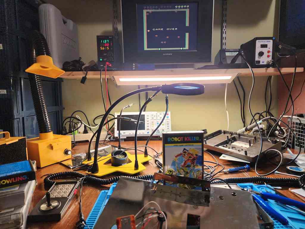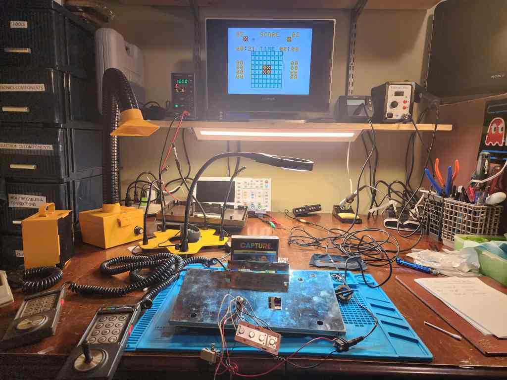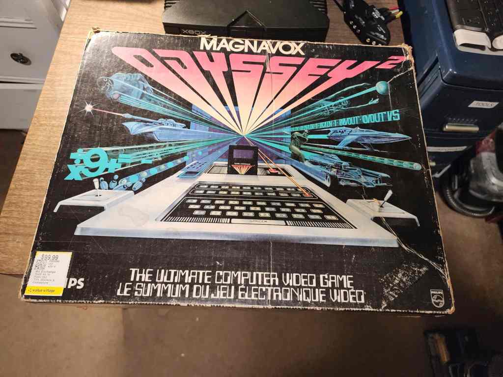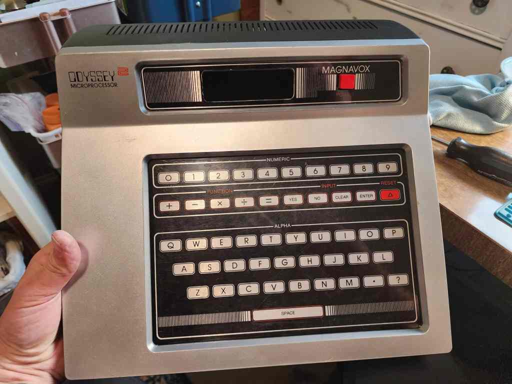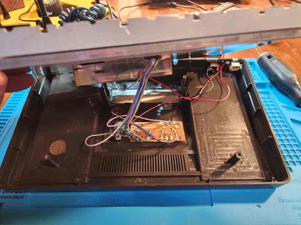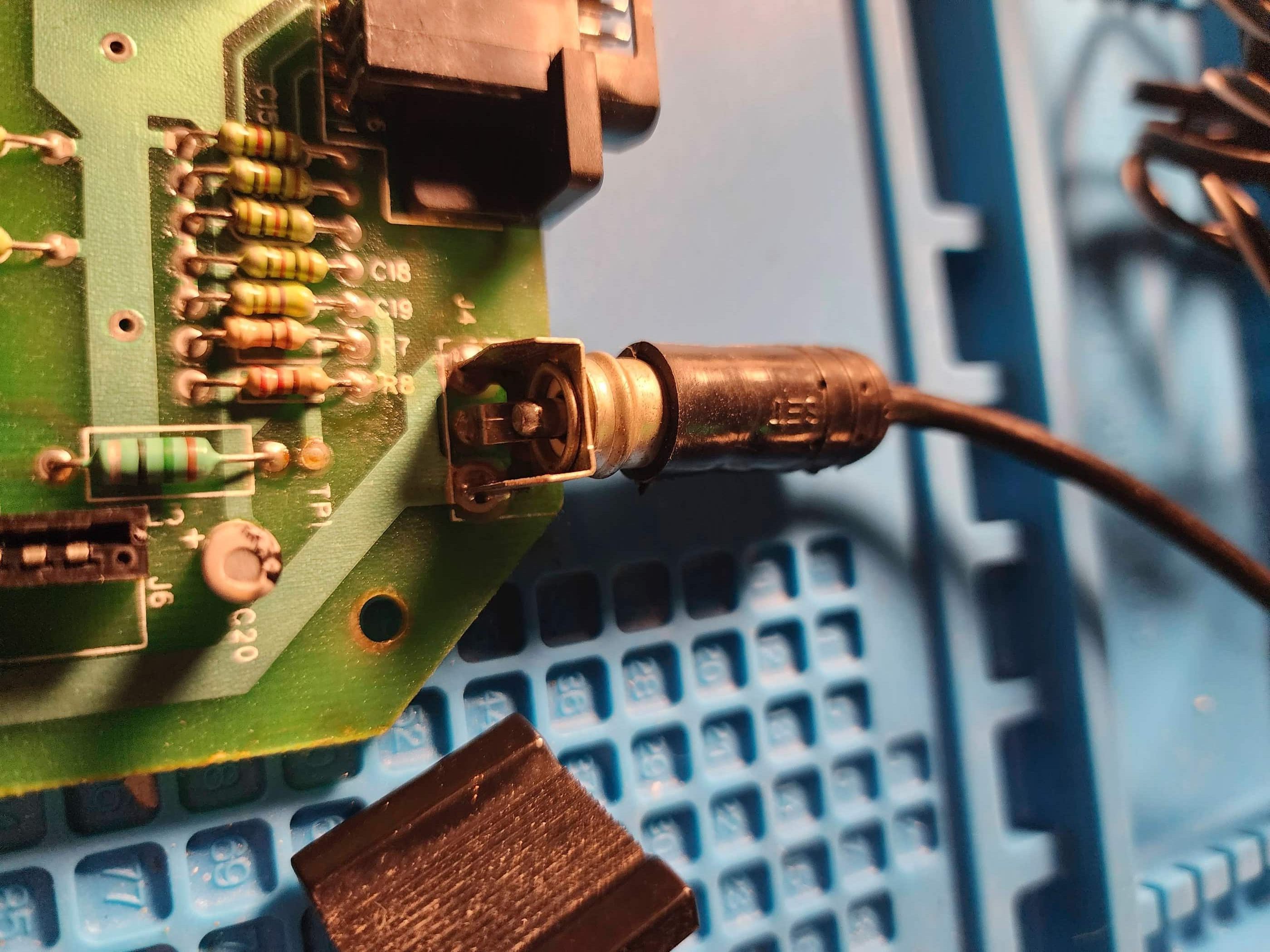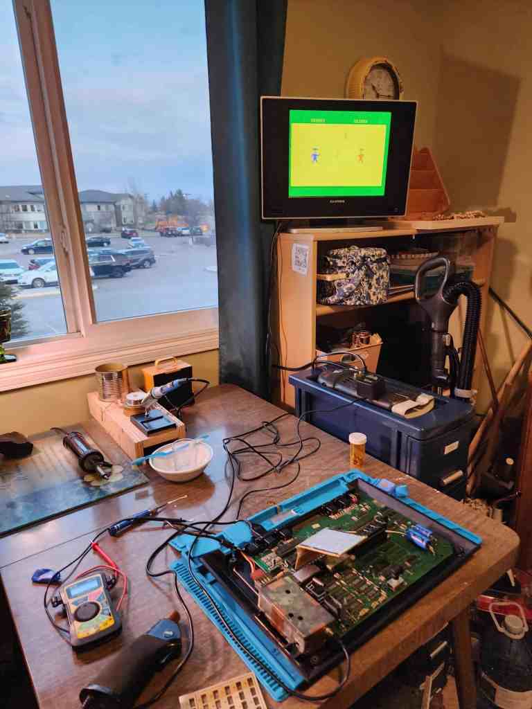 Project Details: We found this at the local thrift store in its original box along with 8 games. It even had some of the original documentation. The weird end of the RF cable was something that I’d never seen before, and after doing some digging, discovered that only the early models of the system used these. Not having the mated switch box, meant that I would have to put in a new RF cable, which I did. After confirming with a multimeter that the AC adapter (11.5 VAC) was functional, I proceeded to test the working status of the unit. Surprisingly, it worked; though the joysticks had little-to-no functionality. I then got to work on trying to desolder the RF shielding. Holy cow! 😳 What a nightmare! I ended up getting the key pieces off, but left the rest attached because it was taking way too long and I was in danger of lead poisoning. 😂 The weird thing about the Odyssey 2, is that the RF box is separate from the main board and there are a couple ground straps that have to be desoldered before you can remove the main board before the RF box. For testing, I had to run alligator clips from the board to the box for grounding to ensure that I could get an output.