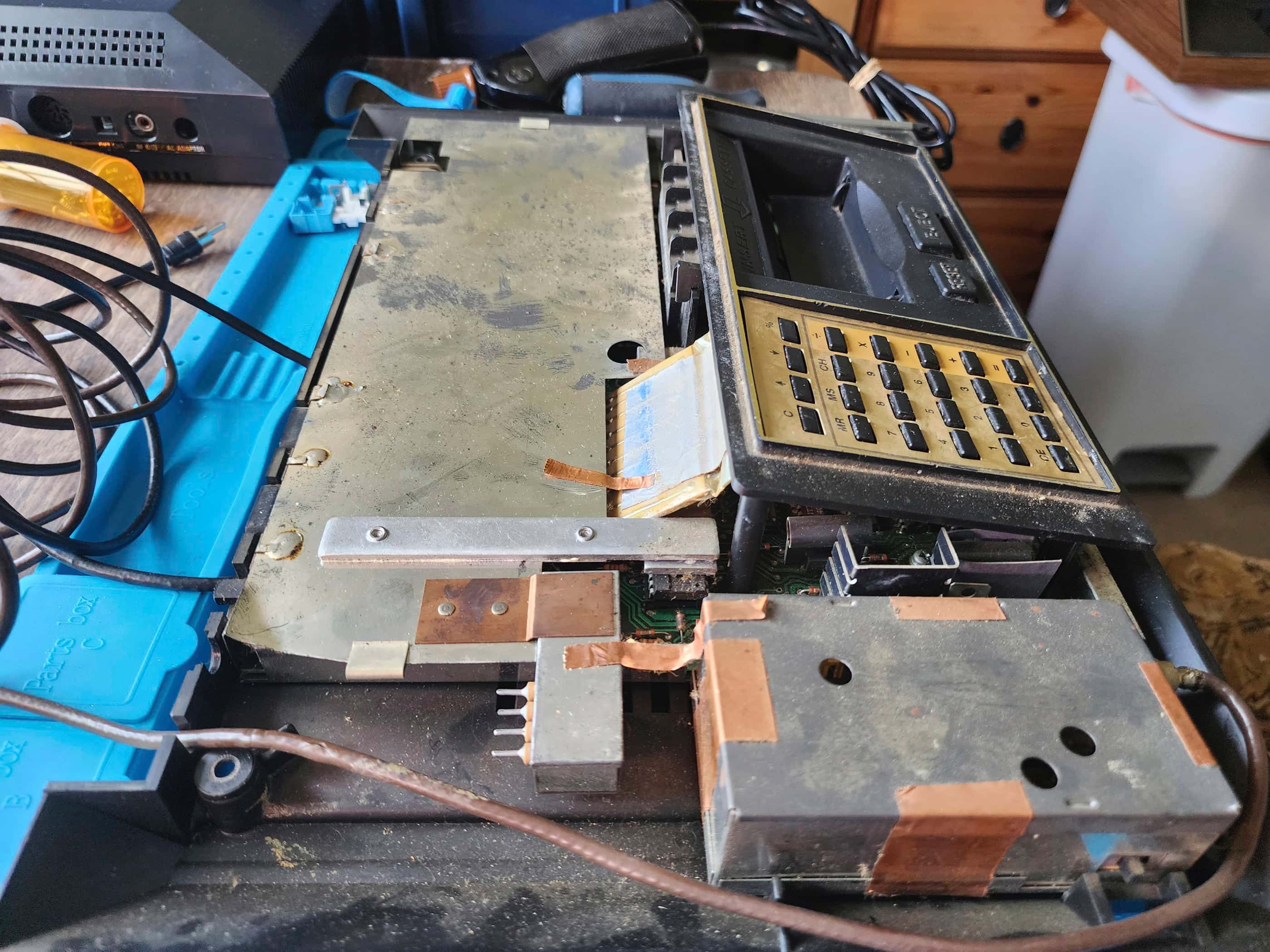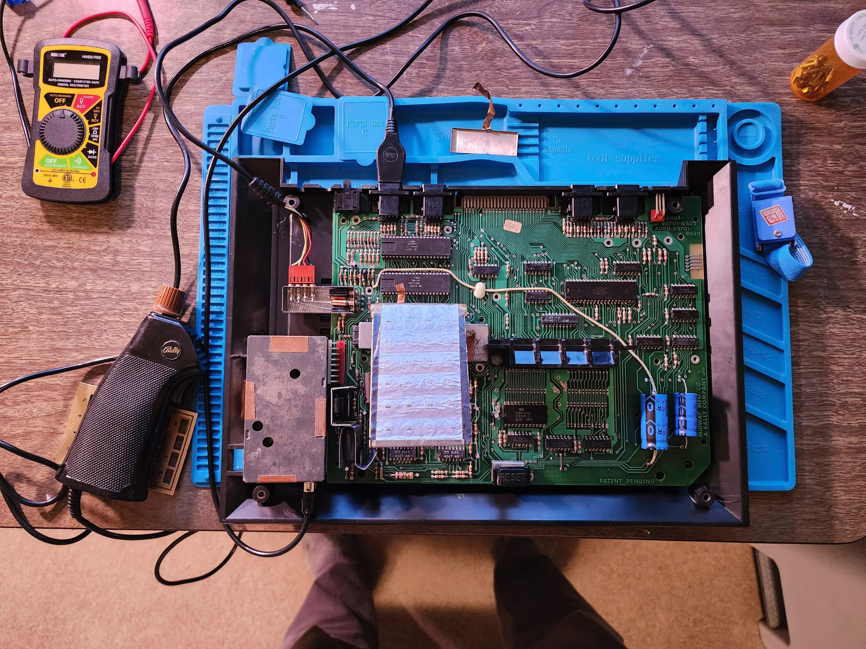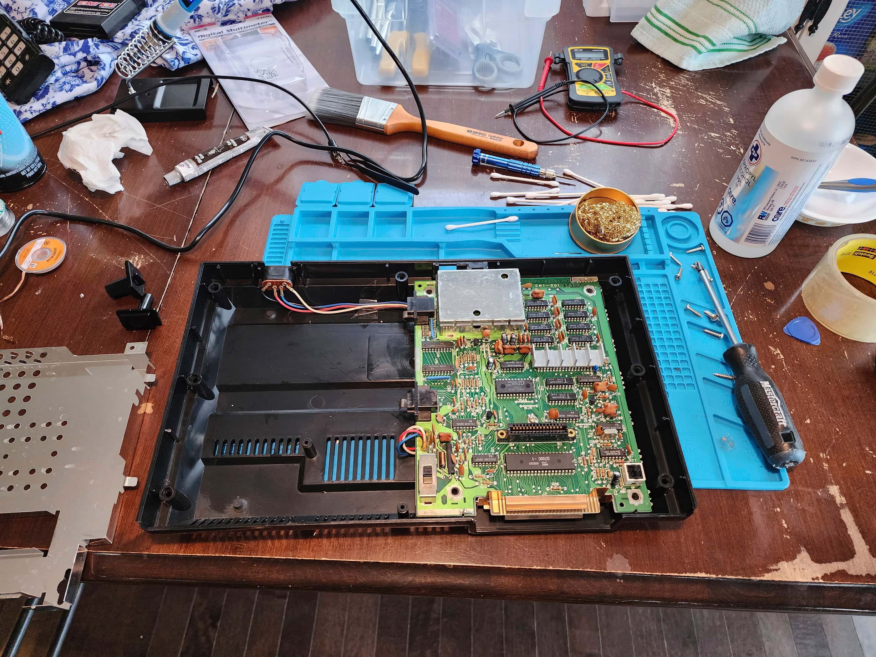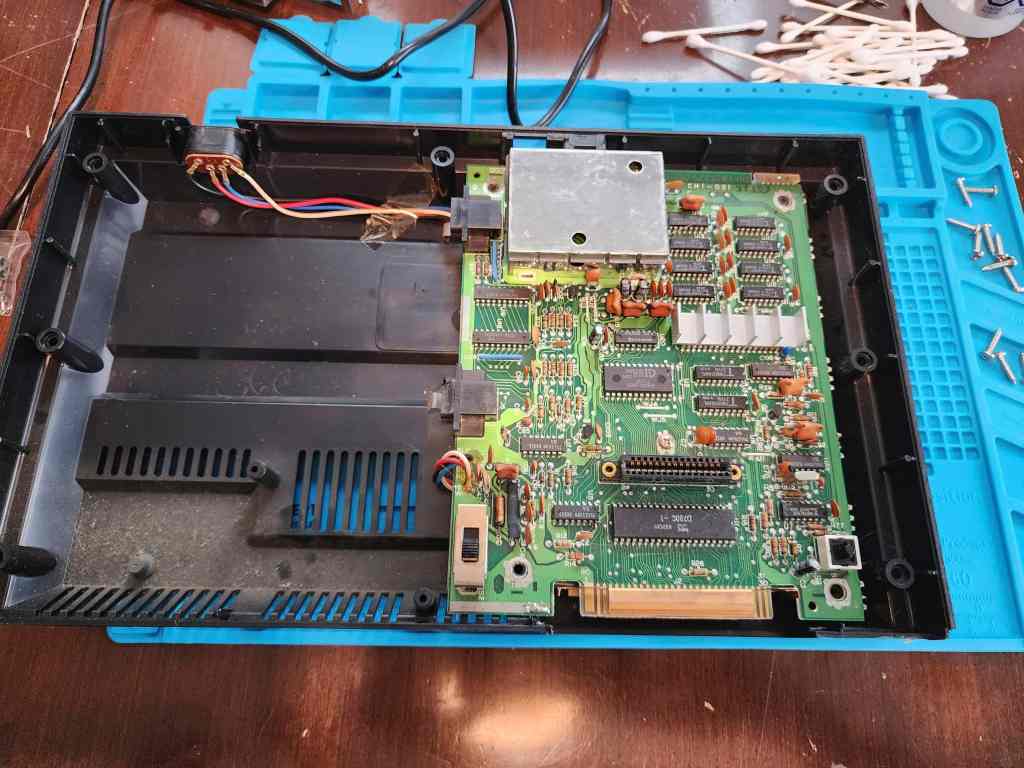 Next, I undertook my detailed cleaning regiment plus I added heatsinks to all three of the custom chips; however, I could not remove the ingot from the custom data chip, so I ended up putting the heatsink on top of the ingot. Not ideal but acceptable – and it still fit under the ribbon cable. I also rebuilt three of the non-working controllers using a pair of non-working controllers I found online. I disassembled, cleaned, and reassembled all of the cartridges to see if that helped. It did for one of the games. When I reassembled the entire system, I did not include the RF shielding to promote better airflow. As the metal keypad had come unglued, I glued that back onto the case. The system now works wonderfully and I’m consistently blown away by the depth and quality of the sound compared to its peers. The innovative controllers are also surprisingly responsive. 😀