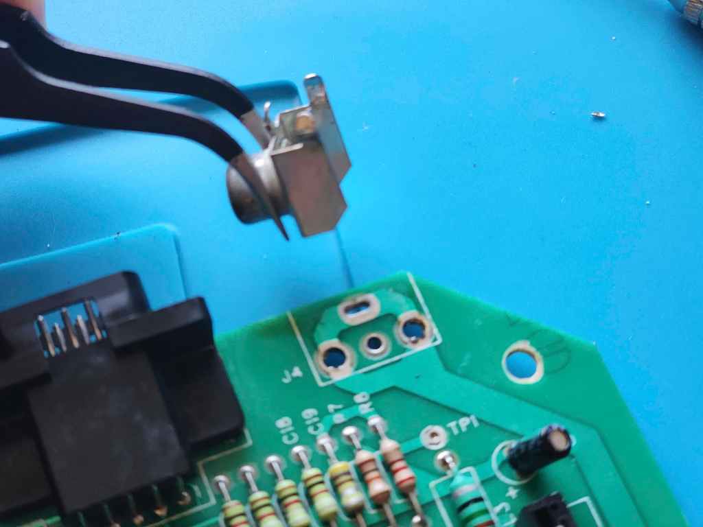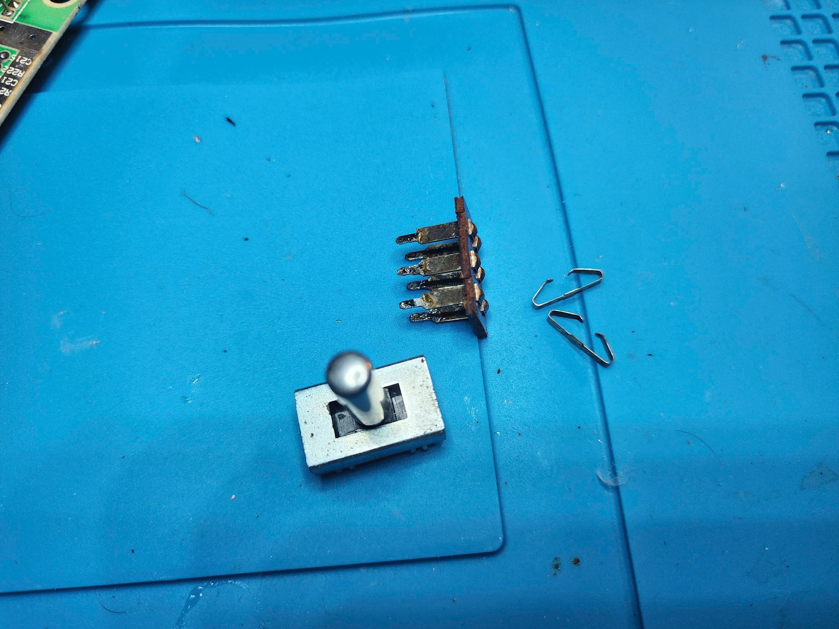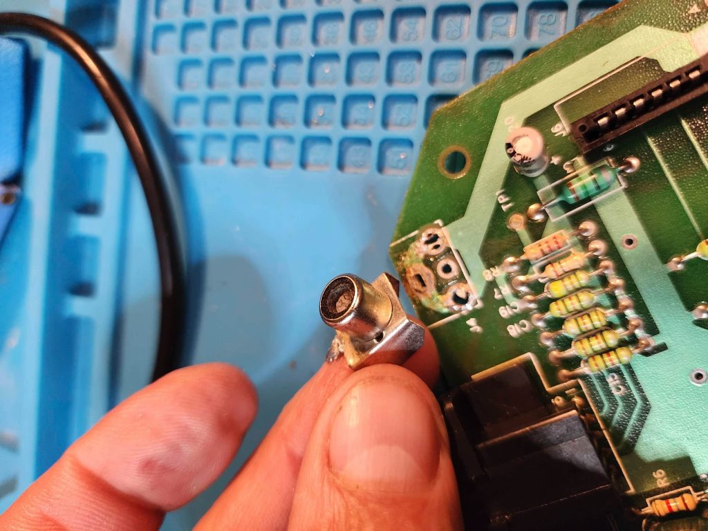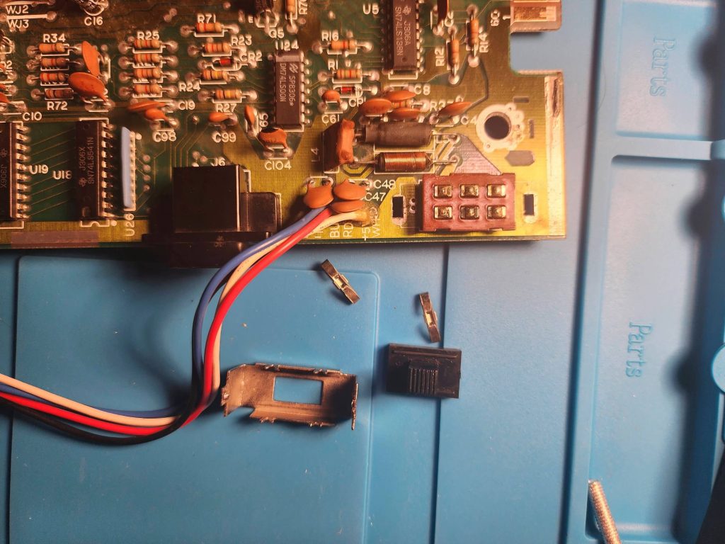 The issue was with the power switch. It was letting voltage through when it was on, but unless I pushed sideways against the toggle, nothing would appear on the screen. I taped the power switch for further testing and plugged in a joystick to the left port. Missile Command displayed great, but the joystick would only let me move up, down, left, and fire. I tried the second joystick and the same thing happened. I plugged in an Atari joystick and the same thing happened. Something was wrong with the port or the board. These machines have notoriously bad joystick ports, so I set about continuity testing and looking for cracked solder joints under a magnifying glass but I couldn’t see anything. To give my mind a break from that problem, I decided to try and fix the power switch by desoldering, disassembling, cleaning the contacts, reassembling, and soldering it back onto the board. Through this process, I was able to tighten the side-to-side play of the switch by pushing the contact plate closer to the metal casing and bending the clamps to hold it in place. This pretty much eliminated any excess play and the system now powered on and off as it should.