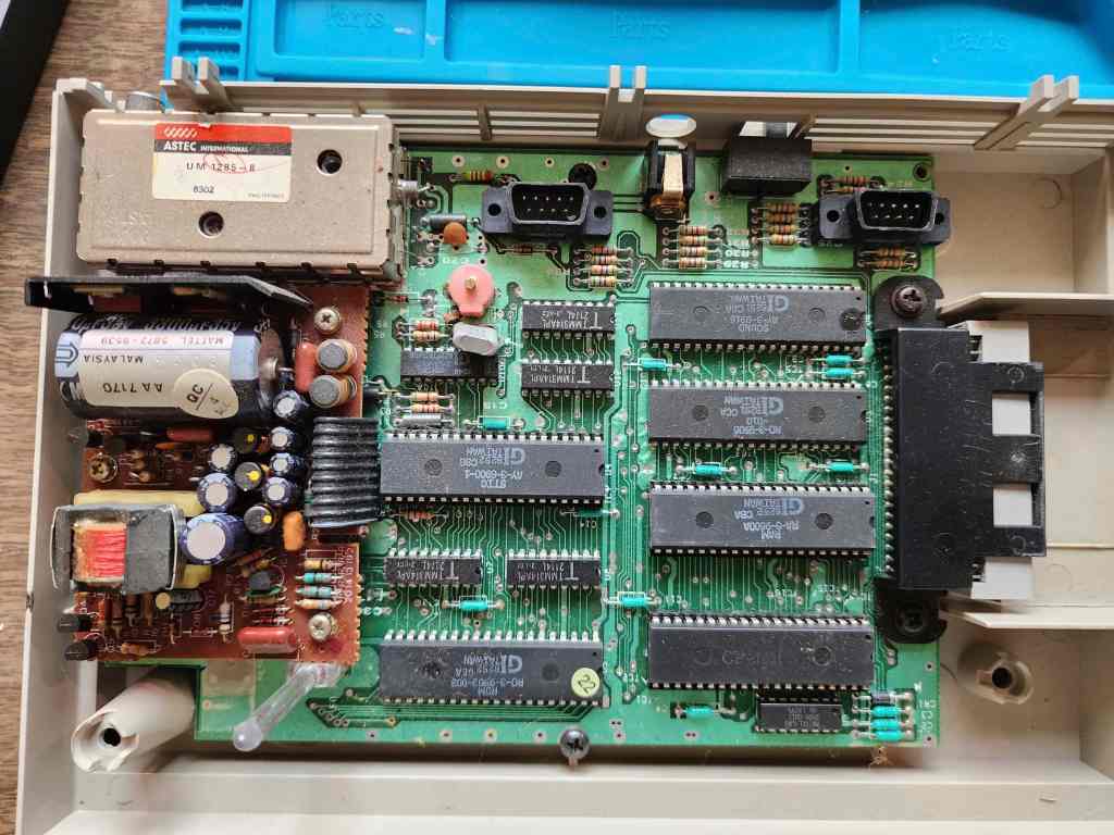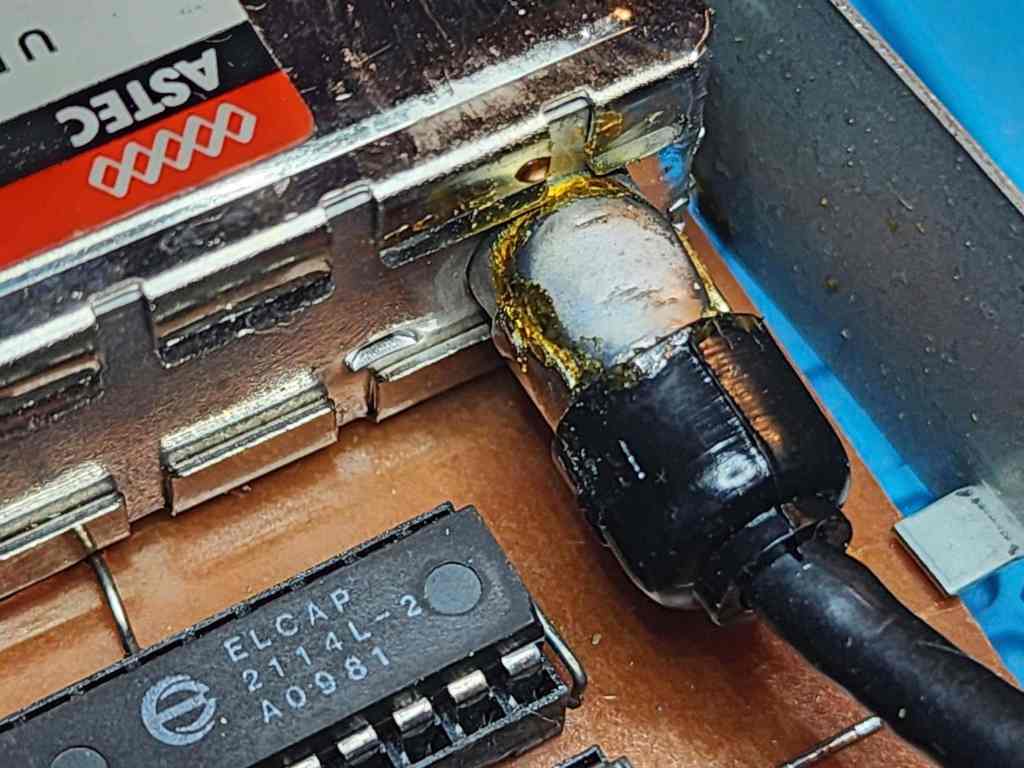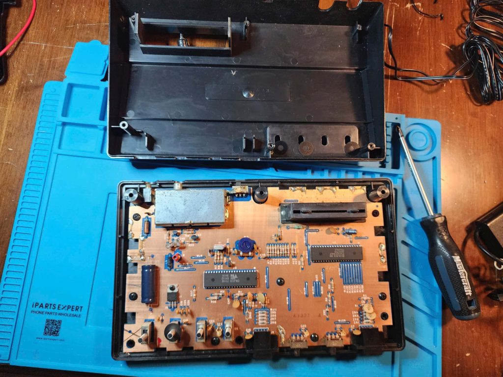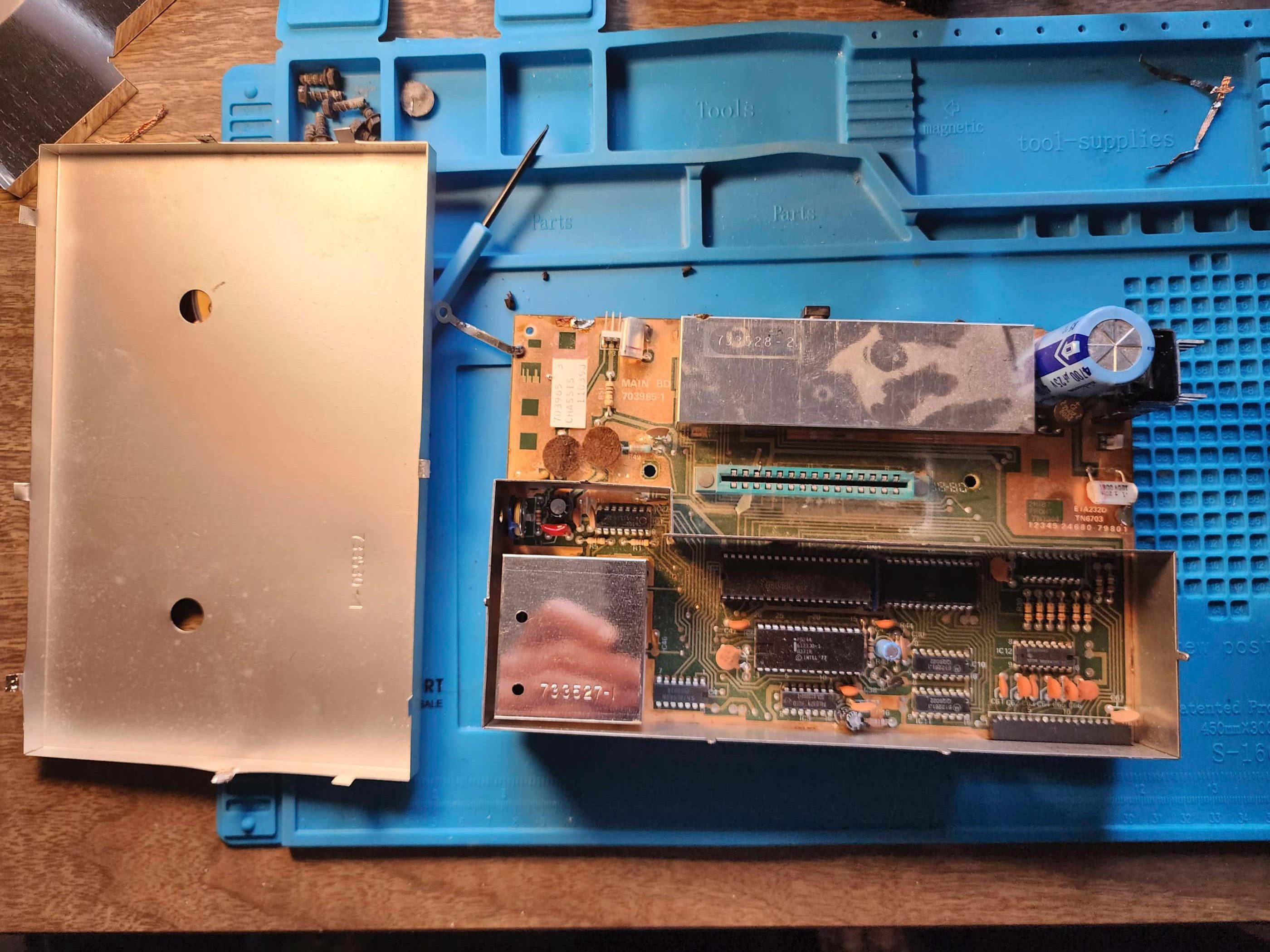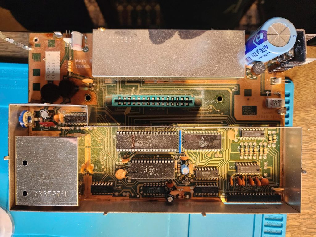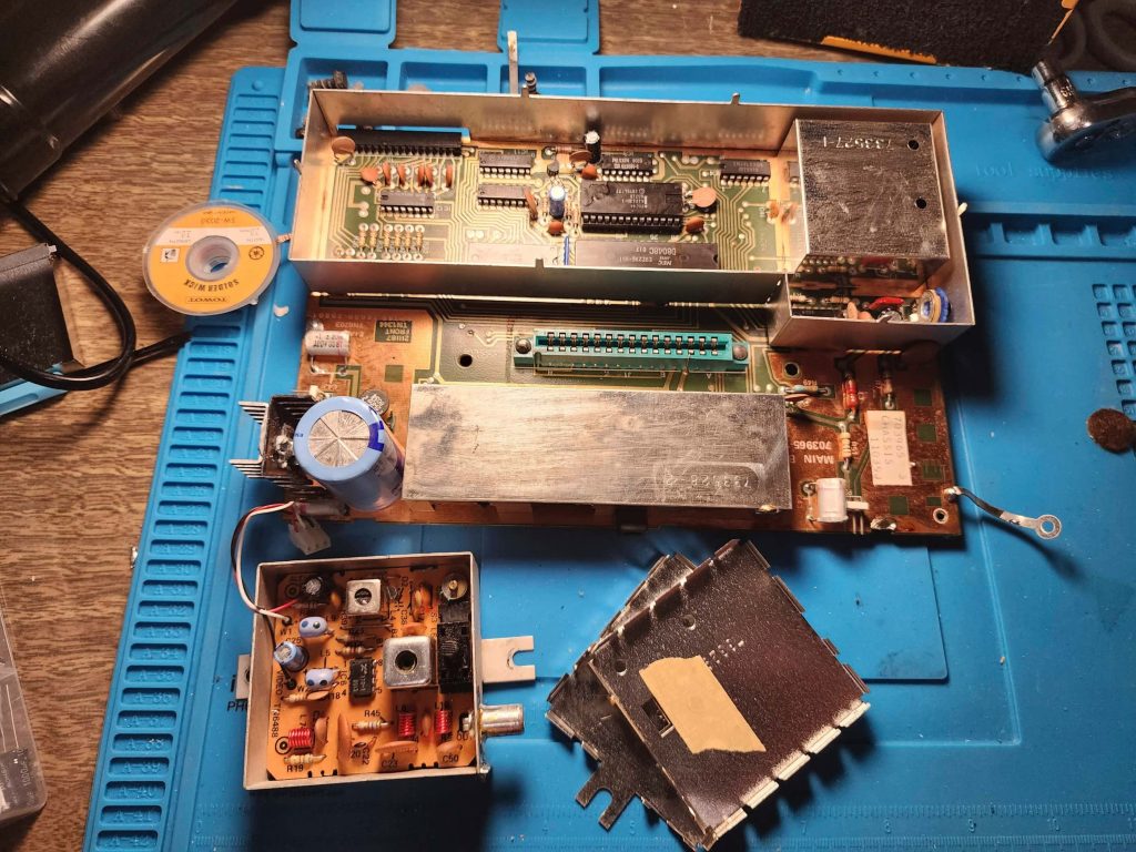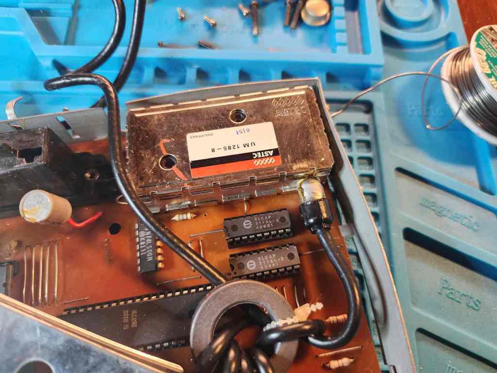 Project Details: I was super stoked to find this rare beauty! I knew from the seller that it would be DOA, but I was keen to see if it was a simple problem or something more complicated. These systems had a history of overheating due to design, and sometimes the custom chips would be wrecked by excessive heat. Moreover, the power adapter was proprietary and outputted two separate AC voltages (11.5 & 7.5) and if that was faulty, then finding a replacement would be tricky. However, before I could do anything to the unit, I had to fumigate it because it reeked of cigarette smoke (it’s a 70s console after all 😂). After a few weeks of sitting with a pan of baking soda while sealed inside a garbage bag, the Astrocade finally lost its acrid smell and I could get to work. Right away, I noticed the following: 1) the RF cable had been cut in half and then spliced with different cable; 2) when I opened the cover, I saw that the connector for the power adapter was not seated properly on the input to the rectifier; and 3) the metal ingot on the custom data chip had separated from the RF shielding, which it was supposed to be using as a giant heatsink. The good news, was that I could tell from the solder joints on the shielding, that the unit had probably never been opened before, so I got to work on desoldering the shielding.