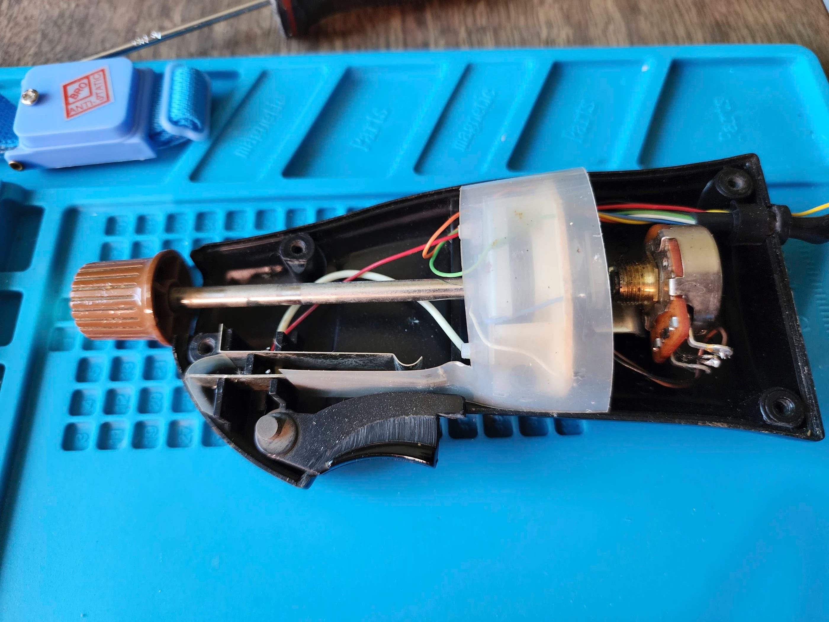 After finally getting the system open, I removed the felt-like liner that covered the area around the cartridge slot, and took note that there were three electrolytic capacitors along with a well-secured 7805 5V regulator. I then started in on replacing the RF cable, which took way longer than I thought it would, as it had been soldered onto the Astec RF modulator with a huge weld. Once removed, I replaced it with a spare cable, though I did not solder it. I then tested the system and it fired up nicely. I tried a few games and took note that the left controller had function problems, notably that trying to move anything down was unresponsive.