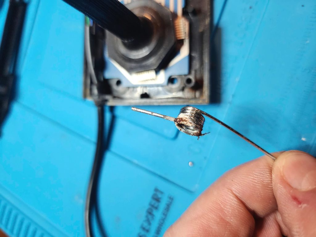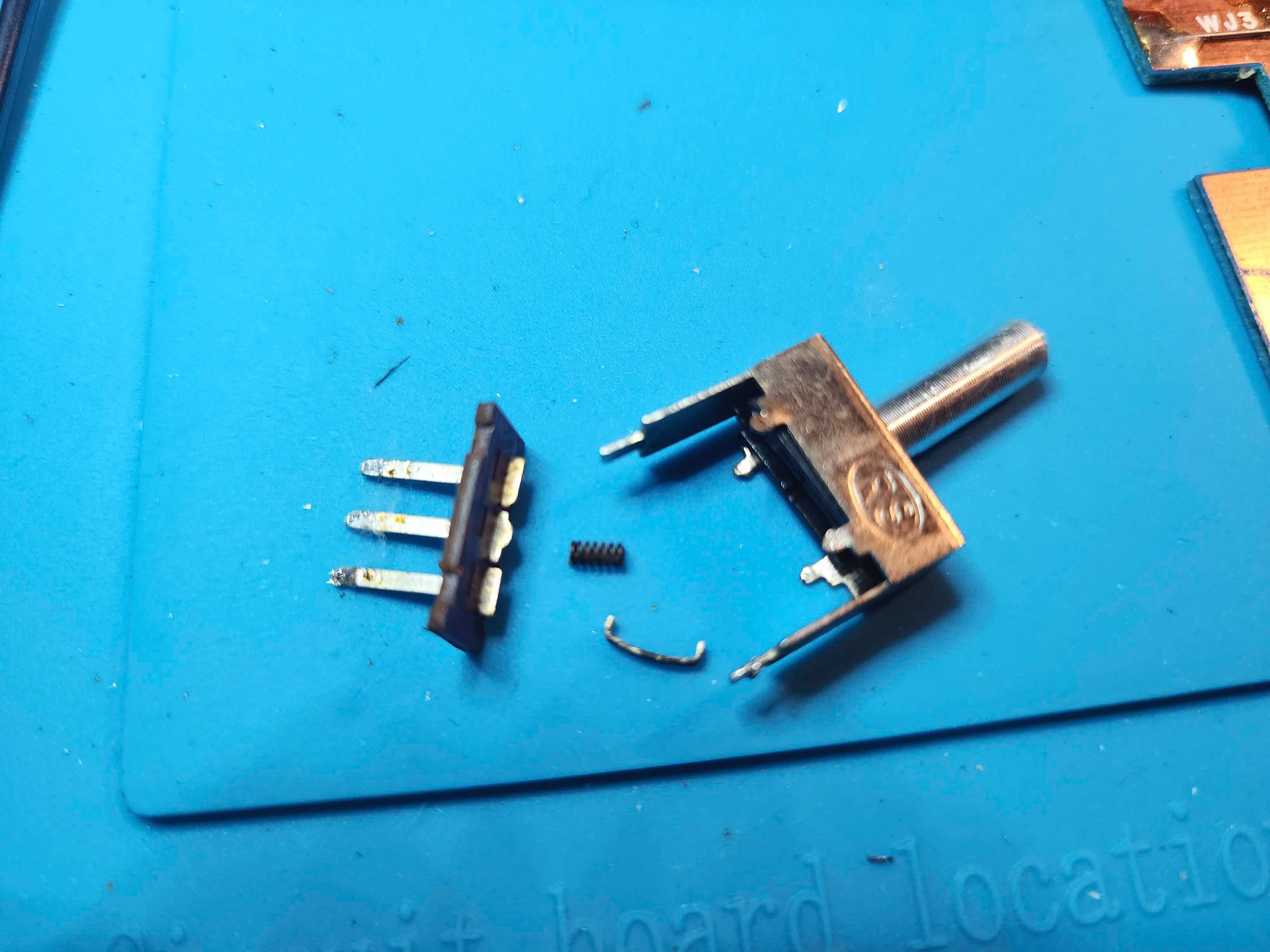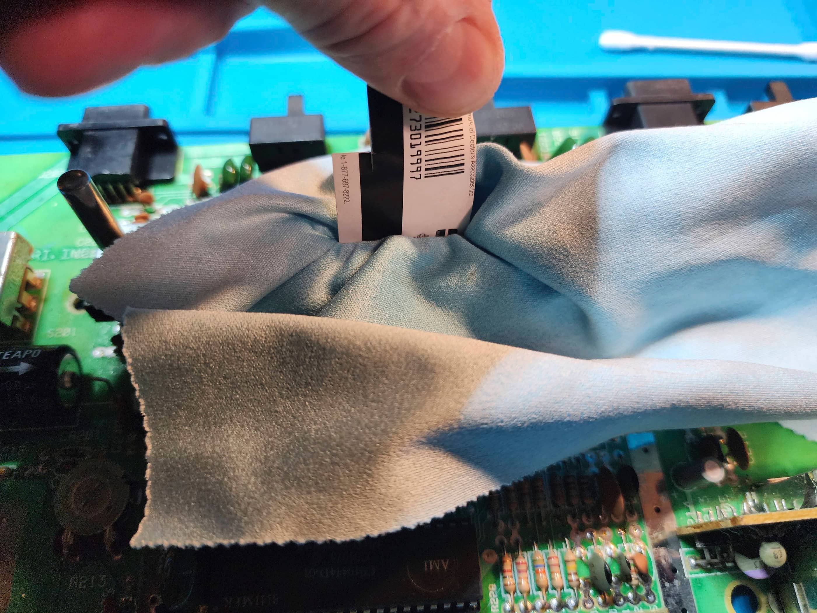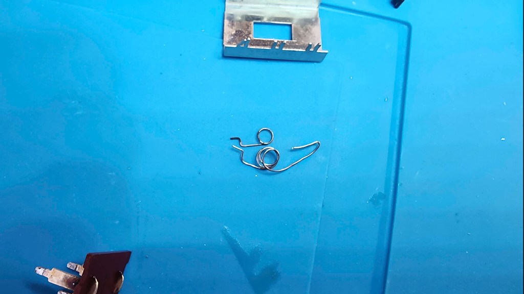 Once this was done, I then removed all the socketed chips, applied Deoxit D5, and then reseated them. I then began to work on trying to find a solution to fix the broken spring on the Game Select switch. My solution was to rummage through my parts bin where I came across a spring from a Commodore 64 keyboard. After 45 minutes or so of bending and carefully reshaping, I was able to fabricate a working replacement. I then reassembled the switch and soldered it back onto the board.