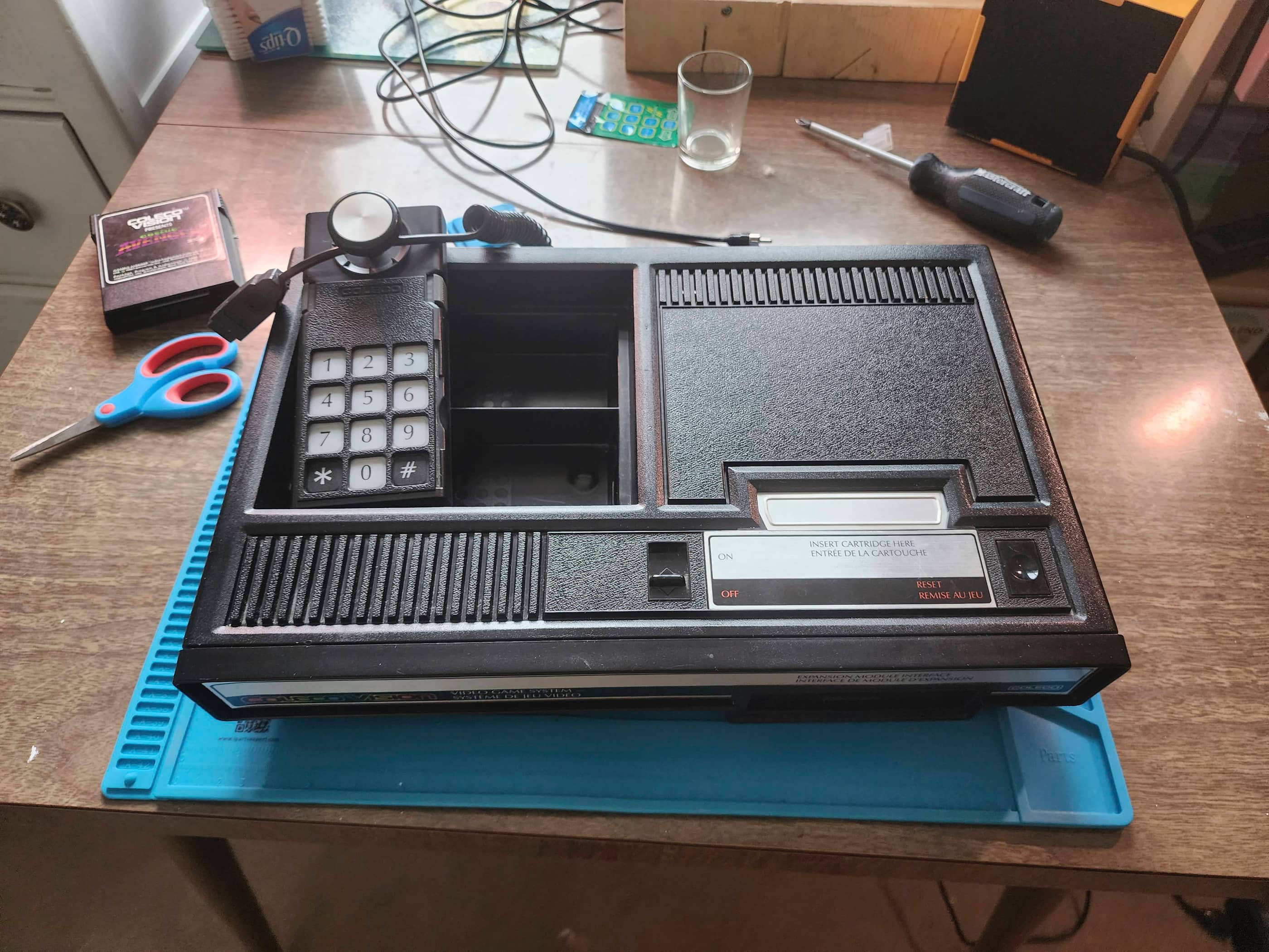 Project Details: I bought this solely as a parts unit because the mylar keypads on the controllers were in amazing shape, something that’s really hard to find. However, outside of the keypads and flex circuits, the controllers were trashed and the plastic casing was significantly yellowed. The seller sold the unit for quite cheap and had no idea if it would work. On arrival, I tested the power adapter and confirmed it was good. I then checked to see if system would power up after I inserted a cartridge. Not expecting anything to happen, I was shocked when it fired up Night Stalker without any issues. Cool! After harvesting the mylar keypads and flex circuits to use on Inty #1, I parked this unit on my shelf to one day add new controllers and either a new case or try a UV-H2O2 whitening treatment. I also paired the IBM Lenovo 16v 3.36a power adapter (model:AA20530) that I first tried with Inty II #1 to work as the unit’s power supply because I took the proprietary supply that came with it to also use in Inty II #1. As none of my remaining controller cases are good, nor do I have any number pads, this system is still sitting in my project box. I did swap its power jack with my Atari 5200 2 port, so I’ll have to replace this at some point, but it works good enough for now.
