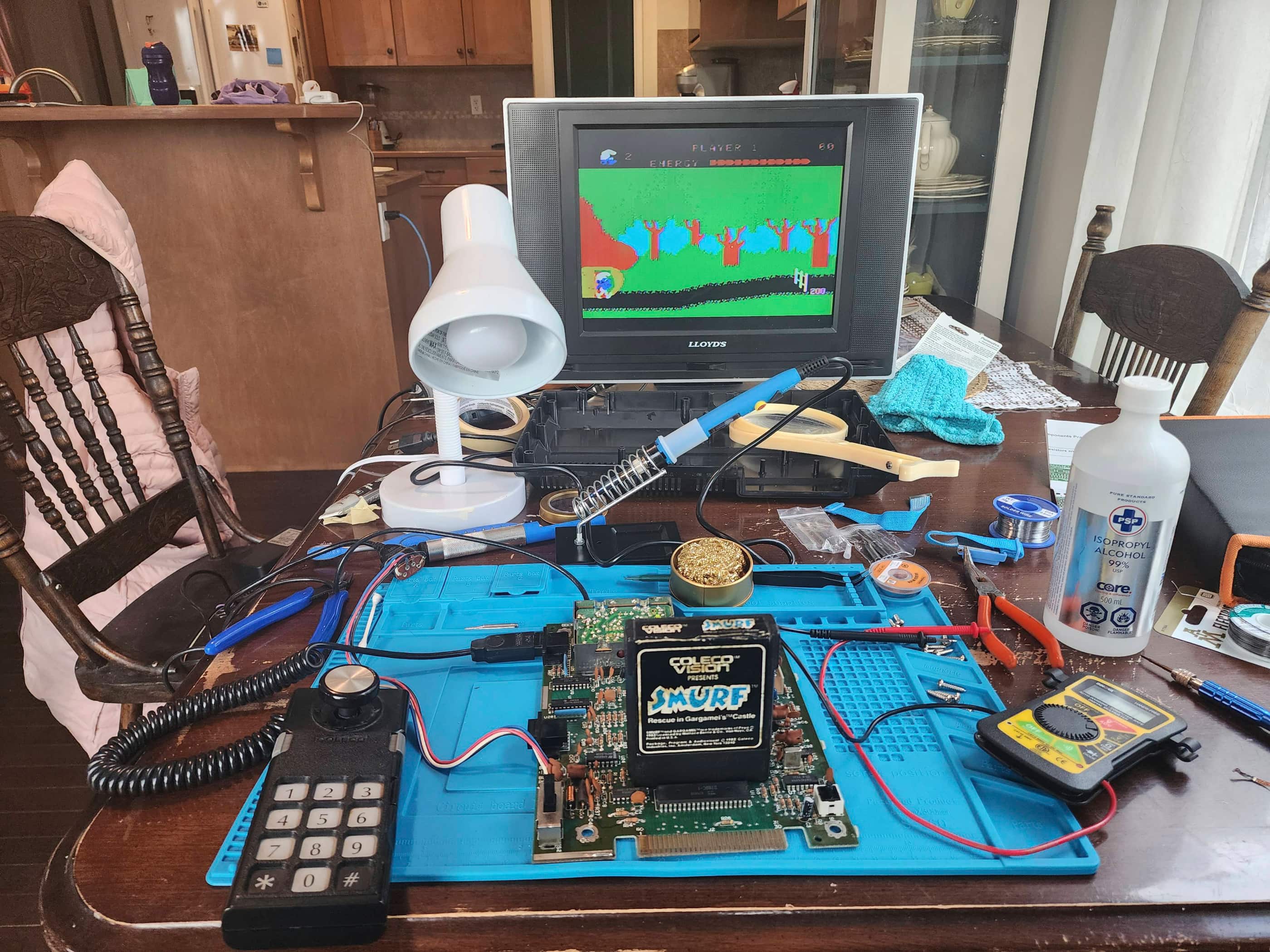 Project Details: This unit came to me DOA. An initial test of the power adapter indicated that it was putting out the correct +5v and -5v, but not the necessary 12v. It was only showing 11.75v, which was in tolerance for spec but lower than I liked. I powered the unit on, but could not get anything but static. To cover my bases, I tried another power adapter that I knew was outputting the required voltage and powered the unit on. Progress! A snowy and flickering image came onto my TV. I got the game started and I could also hear audio, so this was also encouraging. I adjusted the tuning on the RF box and was able to generate a stable image and sound. For good measure I also desoldered, disassembled, cleaned, reassembled, and solder the power switch back into place. The system now worked like it was supposed to. I turned my attention to the controllers as one did not work and one had limited movement. After taking them both apart, I discovered that the non-working controller’s board had been broken in half at some point and somebody had run wire hacks to compensate. I tried to fix it, but it was too far gone, so I found a couple Coleco Adam controllers online and ordered these in to harvest for parts. Continuity tests on the other controller discovered a broken trace that I was able to fix with my own wire hack. I performed a detailed cleaning of the controller and the main console. The unit works now works great, but only has one controller.