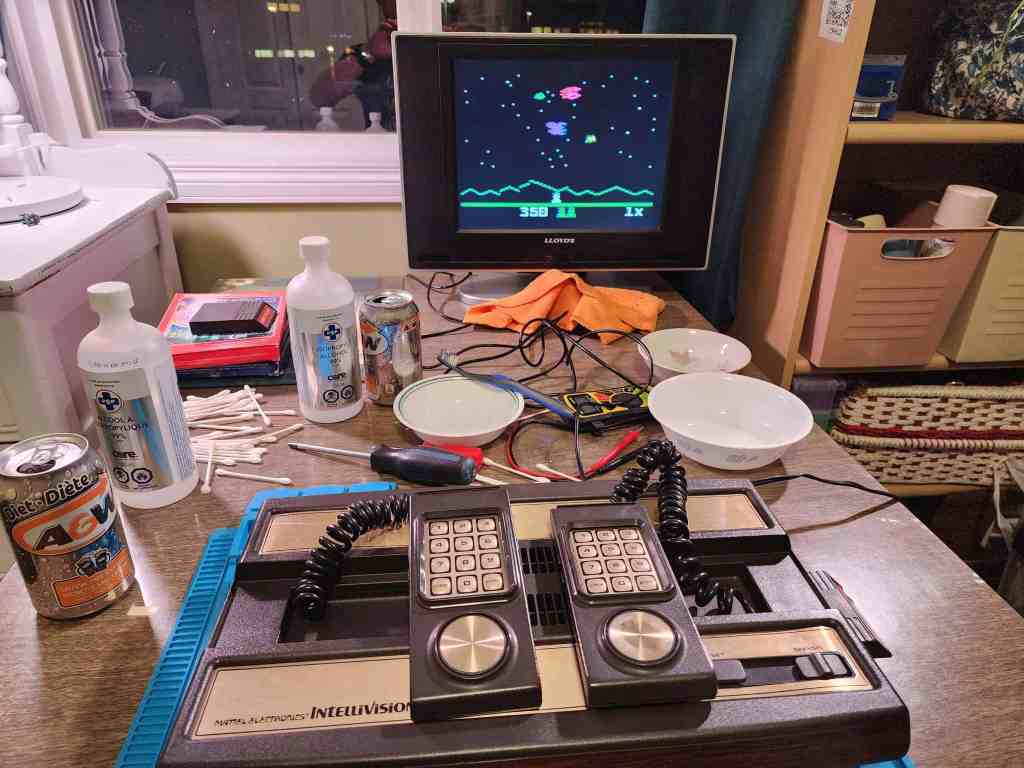 Project Details: This one arrived shortly after Inty II #1 and came as a ‘working but with issues’ tag. After testing the proprietary power adapter and confirming it was good, I fired up the system with Astro Smash as the test cartridge. The game worked with the proper sounds but the graphics were glitchy. Both controllers were missing the mylar keypads and neither worked properly; yet the directional discs were in amazing shape. I opened the unit and got to work inspecting an cleaning the board. A thorough application of IPA to the cartridge slot fixed the graphics glitching. I disassembled the controllers and determined that only one had an undamaged case. I then put everything aside until INTY II #3 arrived. Once it arrived and I had rebuilt INTY II #1, I took the working flex circuit and cracked keypad from INTY II #1 and paired it with the good casing that came with this unit. I parked the other working flex circuit in its own container until I can one day find a new controller case and keypad(s). For now, this is a fully functioning system with one controller.