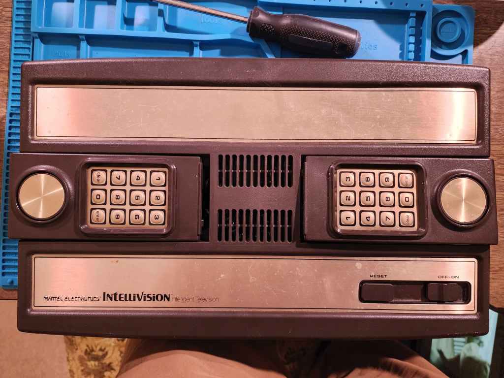 Project Details: I love it when I get a console that has been so well taken care of! This Intellivision came bundled with Intellivision #2 from the original owner. Even the game boxes were in pristine condition and included the instructions and keypad overlays. The only thing that I’ve had to do with this console, is take it and the controllers apart and clean them. I debated trying to remove and glue down the metal labels on the top of the console, but removing them – even after heating – is tricky and can still crease or dent them. As the peeling wasn’t too bad (yet), I decided to leave it until I can get a parts unit that I can swap it with. However, a few months later, I found Intellivison #4 for a shockingly good price and my problem was solved: I simply swapped the two top covers. This woodgrain throwback to the late 70s / early 80s now looks and functions perfectly. 😁
