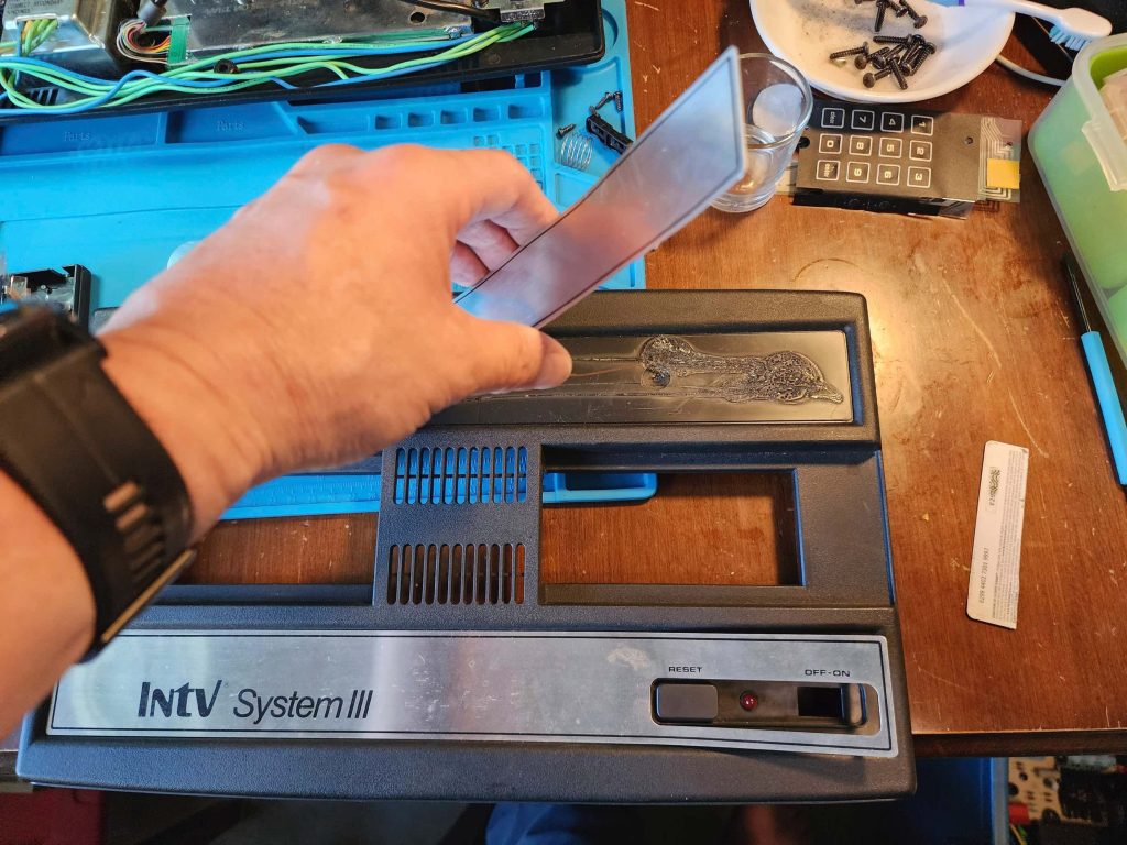 Project Details: This came as part of a cheap lot with my Atari 2600 “Vader”. At the time, I didn’t realize that these consoles are somewhat hard to find, despite being remakes of the original Intellivision. This particular unit came to me as untested and like the 2600 Vader, had been sitting in storage for a couple decades. It was dirty and the metal label strips on the top of the case were not in great shape. One controller was missing its keypad but the other keypad was in decent shape. When I turned the unit on, it had no trouble with graphics or sound which was also a bonus, but it did have trouble powering up on a consistent basis. The controllers however, had significant issues. I proceeded to take the unit apart and give it a thorough cleaning as it was very dirty. I also disassembled, cleaned, applied dielectric grease, and reassembled the power switch which fixed the power issue. I then moved on to disassembling and cleaning the controllers to see what could be salvaged. I ended up being able to create two functional controllers and moved the good keypad onto the left controller. I put everything back together as a functional system in the hope that I’d one day find another INTV System III that I could use for its mylar keypad(s) – or if it was better, use this as the parts system. Well, that day arrived when I found INTV System II #2 and I was able to harvest a new set of keypads. As the top cover of #2 was also in better shape, I also swapped these.