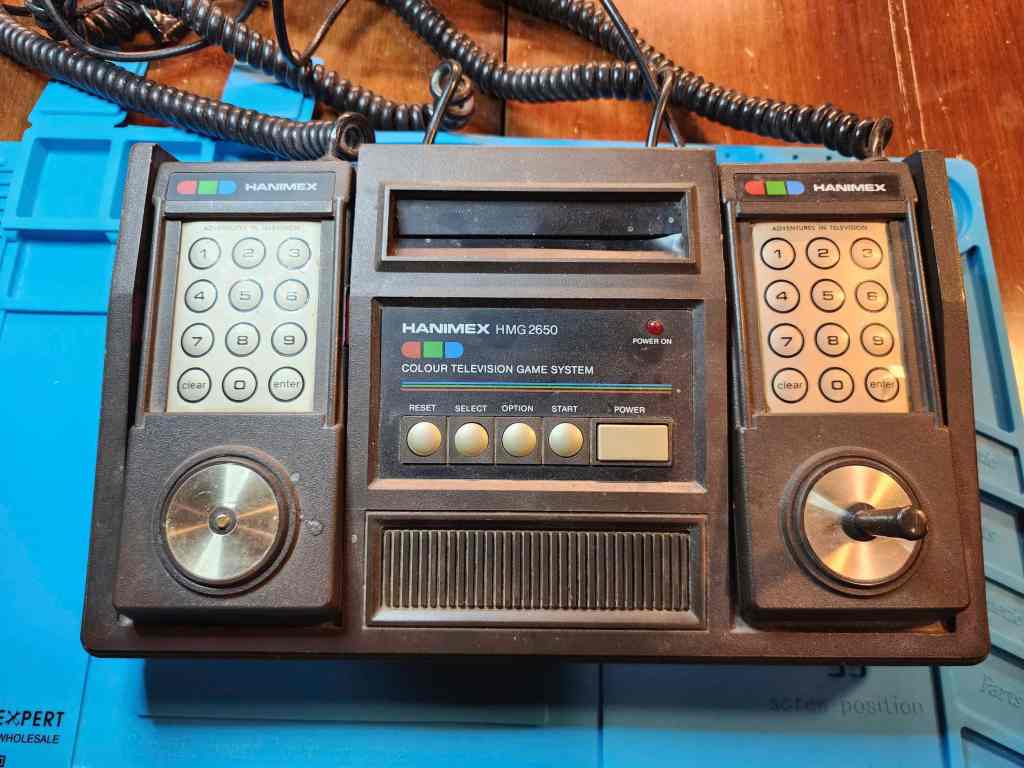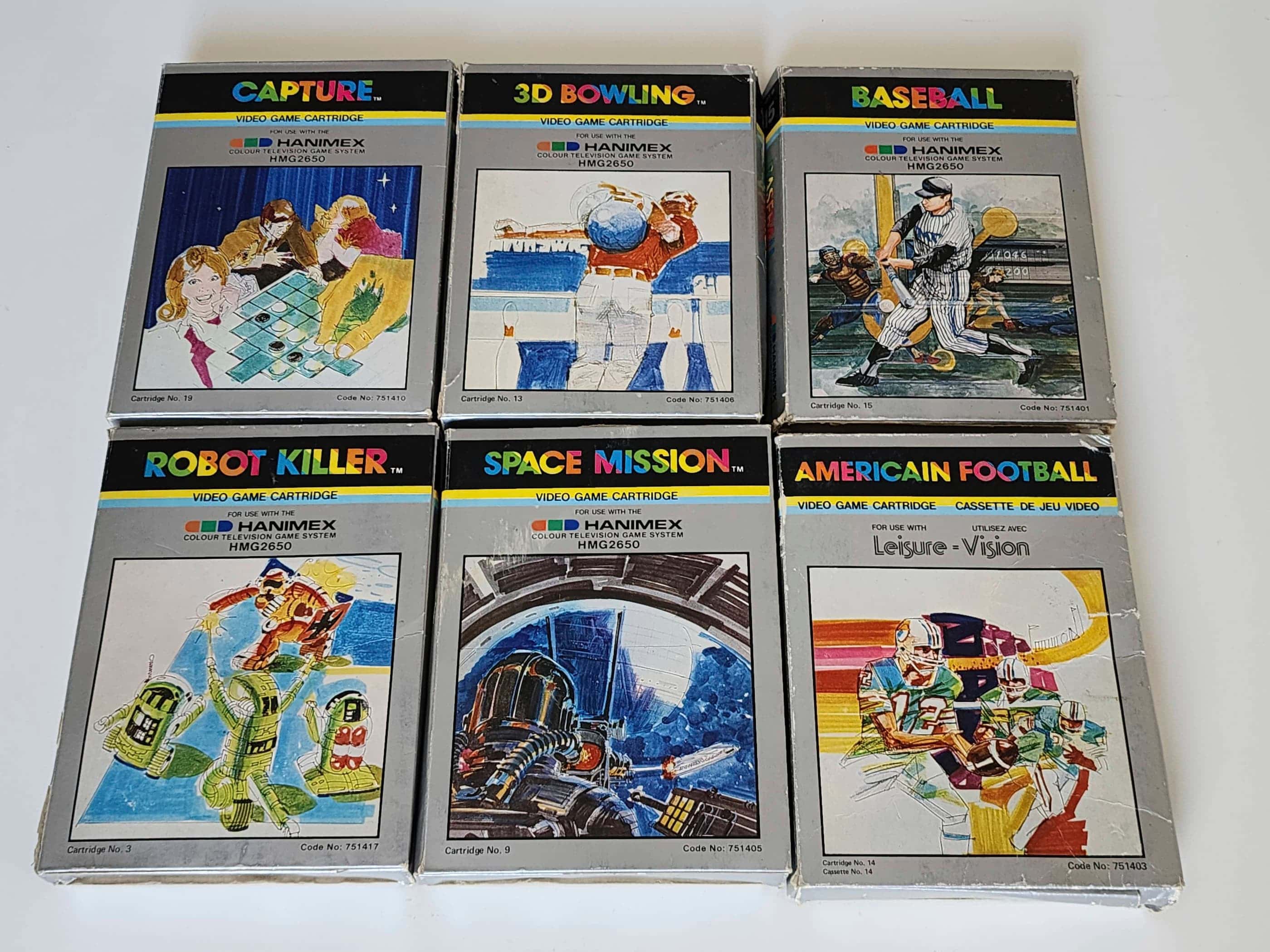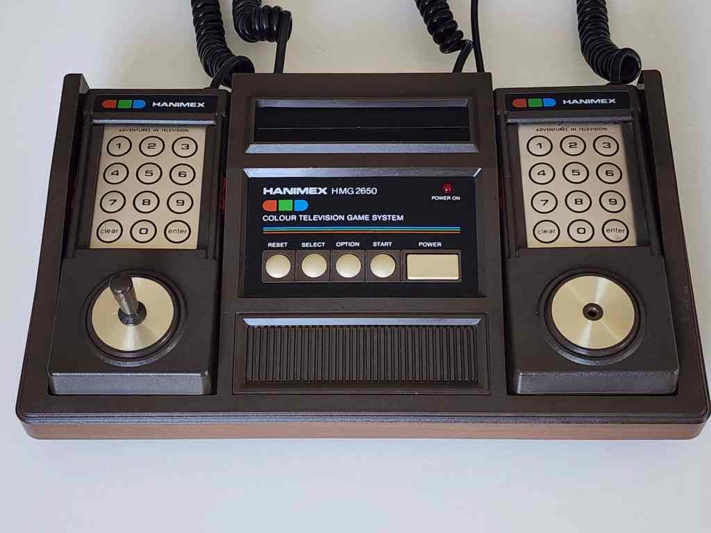 Interesting Fact: The Hanimex HMG 2650 is one of several international versions of the Emerson Arcadia 2001. Developed in Hong Kong in 1982 by United Appliances Limited, the console was licensed to Emerson for use in the United States and also to Hanimex, an Australian company, for international use including, Canada. (source) It was also licensed to numerous other companies and depending on the region, the console can have a different name. For example, it was licensed to the Canadian Company, Leisure Dynamics, and was released only in Canada as the Leisure Vision console. (source) This means that in 1982, Canadians had the option to buy the same console (and cartridges), but under two different brand and console names. Designed to dethrone the Atari 2600, the HMG 2650 / Arcadia 2001 did not last long, as it had no third-party support and the newly released ColecoVision and the Atari 5200 were vastly superior machines. (source) The HMG 2650 is named for the Signetics 2650 8-bit microprocessor that it used. Interestingly, the system cloned the original Intellivision controllers, but made a few small changes such as: the addition of a small joystick; the inclusion of only one fire button on each side; 11-pin connectors instead of 9; and the limitation of the control pad to 8 directions.