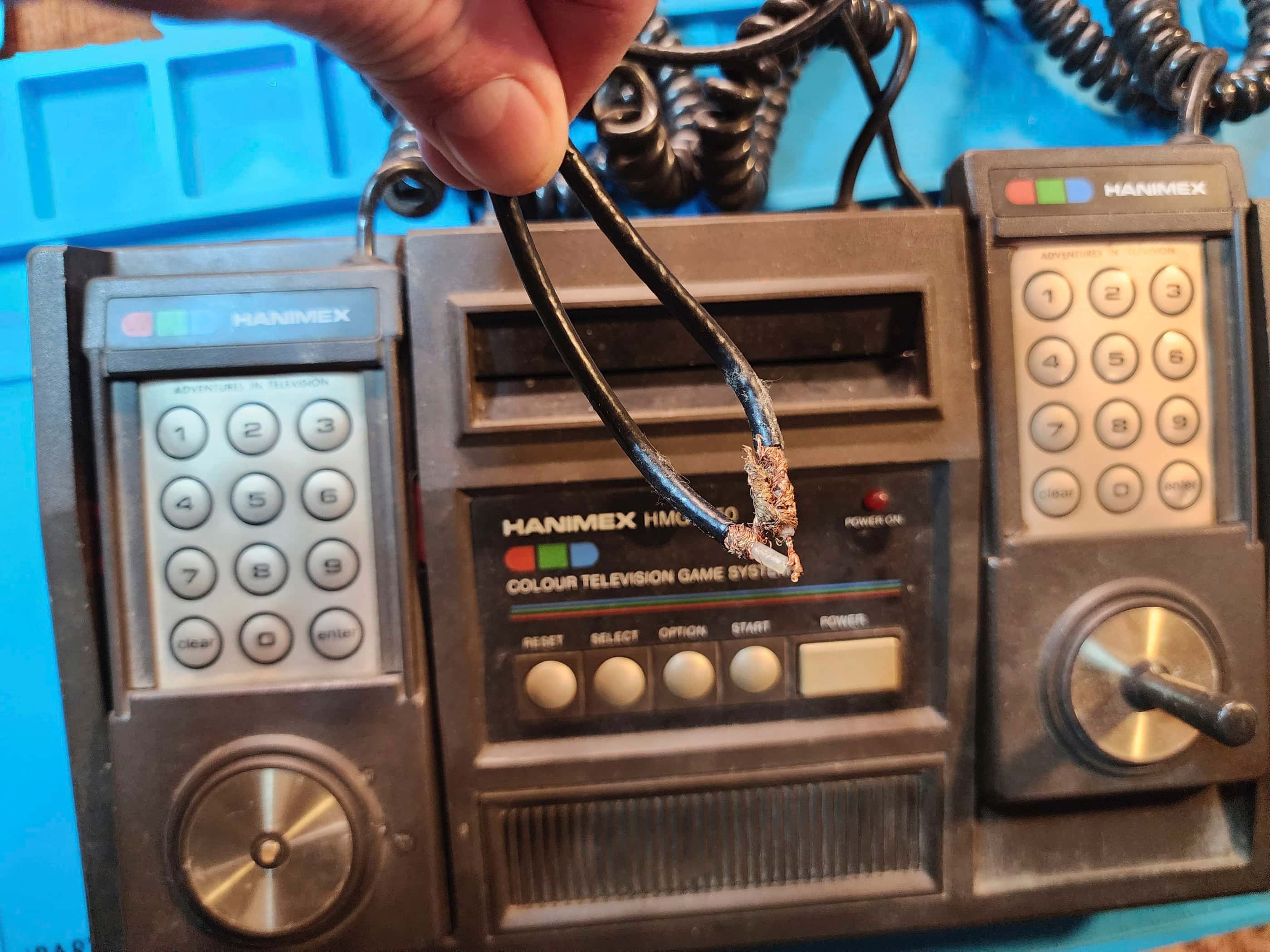 As it did not come with a 12v 500mA power adapter, the first thing I had to do was figure out if the barrel connector needed to be centre-positive or centre-negative. Messing this up would be disastrous, so I made a quick online search and confirmed that the Arcadia 2001 was centre-positive, so I ventured this must be as well… I then hooked up my bench supply and tried out some cartridges. As I suspected, the RF cable was botched, so I made a quick solder repair and a few minutes later, tried another game. I was happy to see garbled graphics on the screen which meant that the system had at least some life in it.