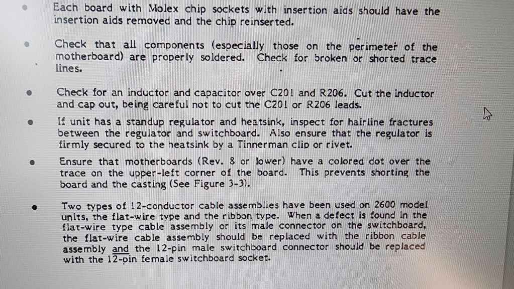 Furthermore, besides not being able to find this mod on a schematic, I couldn’t find a photo or online discussion of it – until I read the Atari VCS Service Manual. On page 3-2, bullet point #7 under the sub-heading “2600 Model Modifications” stated, “Check for an inductor and capacitor over C20 l and R206. Cut the inductor and cap out, being careful not to cut the C20 l or R206 leads.” So, in following the recommendation of the manual, I de-soldered and removed the inductor and the capacitor.
